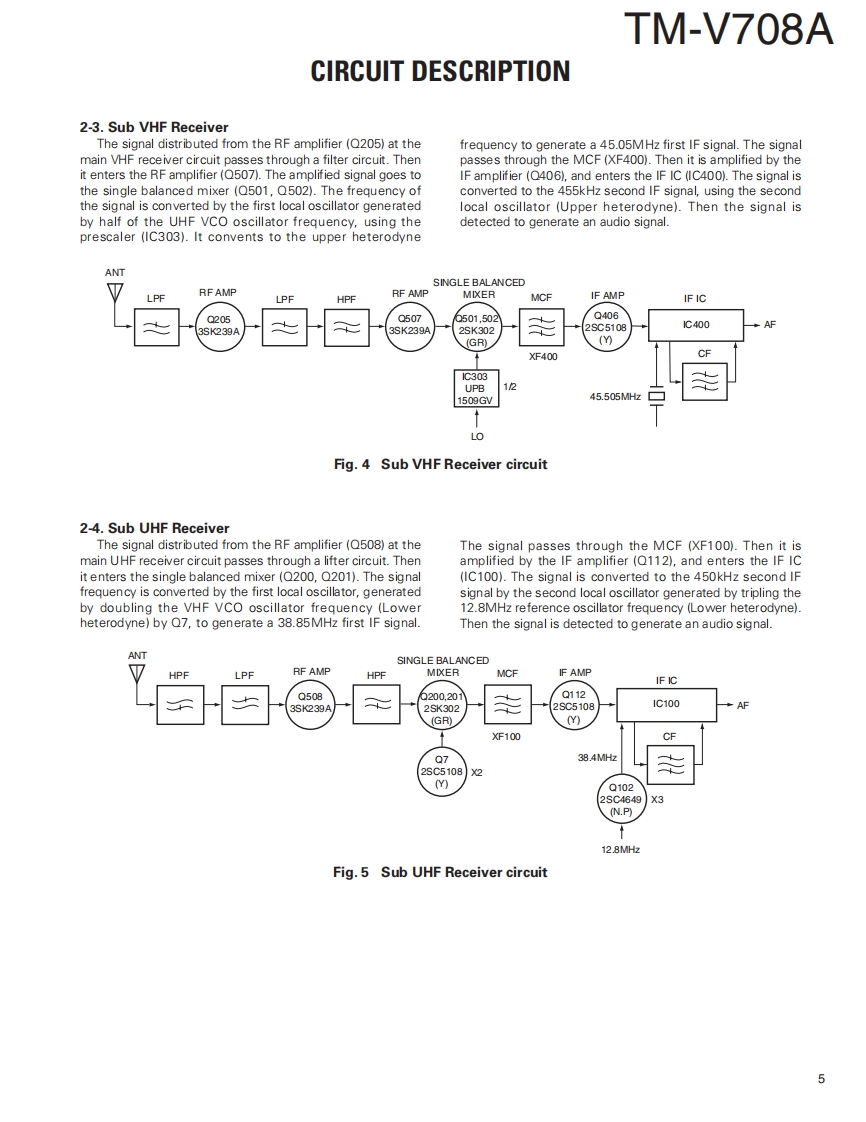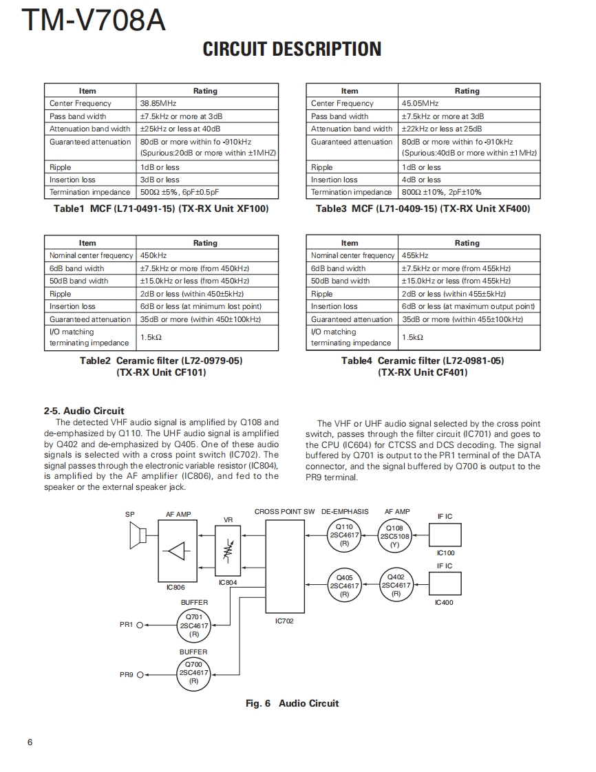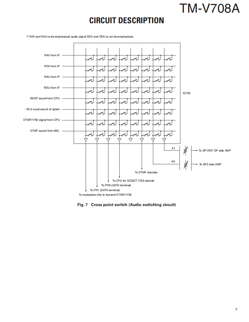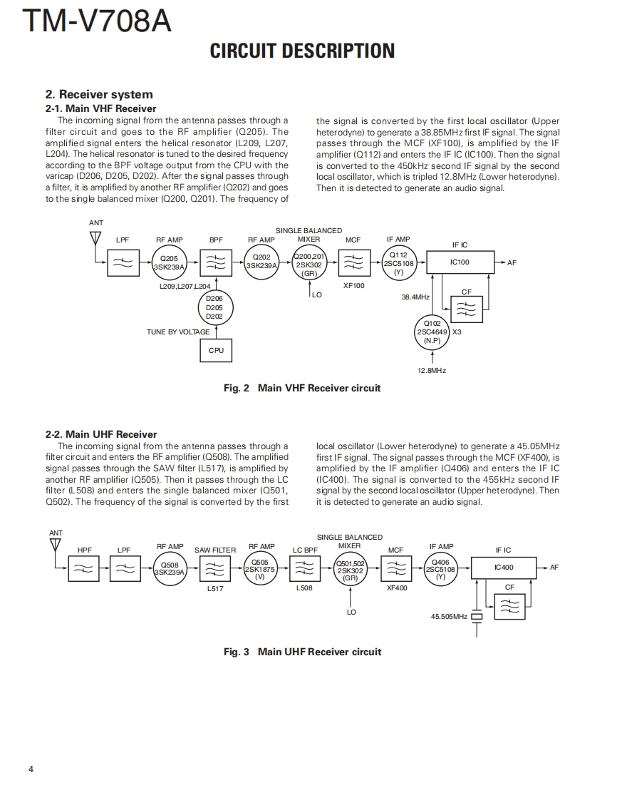 144/440MHz FM DUAL BANDERKENWOODTM-V708ASERVICE MANUALC2004-11 PRINTED IN JAPANB51-8704-00(S)237Microphone(T91-0636-05)Panel (DISPLAY)000(A62-0775-03)KENWOODButton knob月t1 anta se附E(K295400-11)Button knob(K29-5400-11)146.970448.525Knob (SQL)(K29-5223-03)Knob (ENC)(K29-5381-03)Cabinet (UPPER)Knob (VOL)(A01-2122-.23)(K29-5222-03)Panel (MAIN UNIT)(A62-1122-03)CONTENTSCIRCUIT DESCRIPTION...........2PC BOARDSEMICONDUCTOR DATA......14TX-RX UNIT(X57-5860-12).47COMPONENTS DESCRIPTION.......7PANEL UNIT(X54-3290-00).53TERMINAL FUNCTION..19SCHEMATIC DIAGRAM...........57PARTS LIST20BLOCK DIAGRAM..67EXPLODED VIEW...31INTERCONNECTION DIAGRAM........69PACKING.32LEVEL DIAGRAM.70ADJUSTMENT33OPTION (PG-4X)........71SPECIFICATIONS..........BACK COVER
