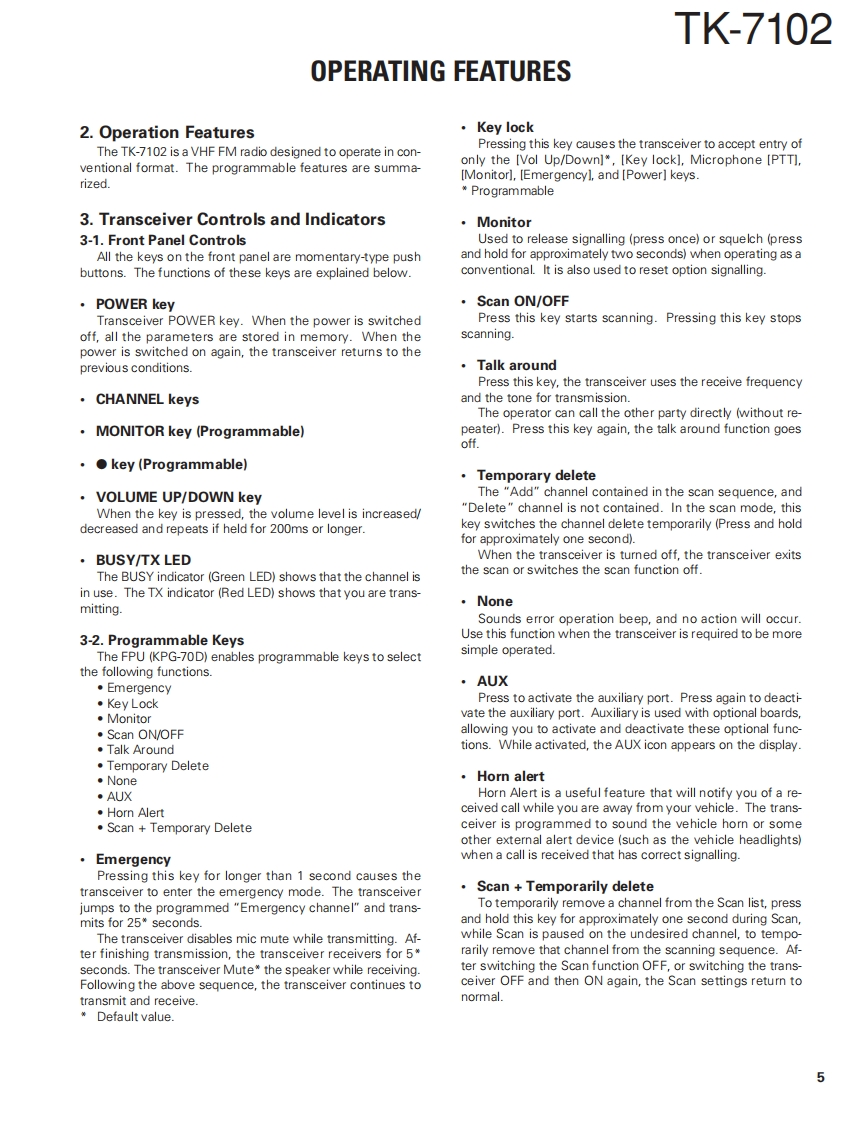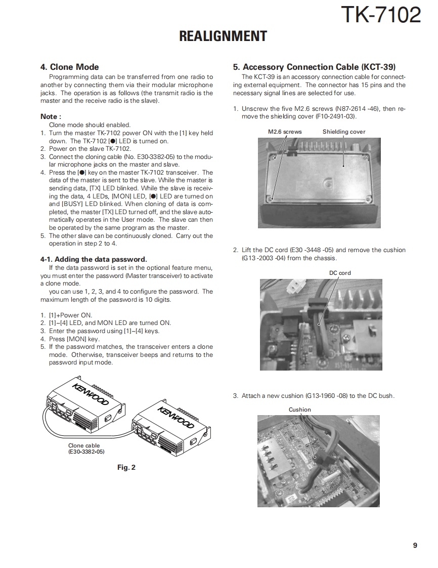VHF FM TRANSCEIVERTK-7102KENWOODSERVICE MANUALREVISED II2003-11 PRINTED IN JAPANB51-8584-20(N)258This service manual applies to products with 50800001 or subsequent serial numbers.In terms of the products with the serial numbers earlier than 50800001,refer to the TK-7102 service manual as per part No.B51-8584-00andB51-8584-10.CabinetFront glassPanel assy(A01-2178-02)(B10-2753-03)(A62-0942-03)Modular jackKey top(E08-0877-05)(K29-9065-01)CONTENTSGENERAL…2PACKING..30SYSTEM SET-UP3ADJUSTMENT ..............31OPERATING FEATURES.................4PC BOARDREALIGNMENT...8DISPLAY UNIT (X54-3460-20).............36INSTALLATION12TX-RX UNIT (X57-6910-XX)..........38DISASSEMBLY FOR REPAIR...........15SCHEMATIC DIAGRAM..........42CIRCUIT DESCRIPTION....16BLOCK DIAGRAM…46SEMICONDUCTOR DATA.............21LEVEL DIAGRAM..........48COMPONENTS DESCRIPTION22TERMINAL FUNCTION…50PARTS LIST.…23SPECIFICATION......51EXPLODED VIEW...........29Service Manual ListTitleParts numberRemarksDestinationTX-RX unit number Display unit numberTK-7102B51-8584-00MX57-6290-20X54-3340-20TK-7102B51-8584-10REVISEDM,M2X57-6290-X0XX54-3340-20B51-8584-20TK.7102(This service manual)REVISED IM.M2X57-6910-X0XX54-3460-20