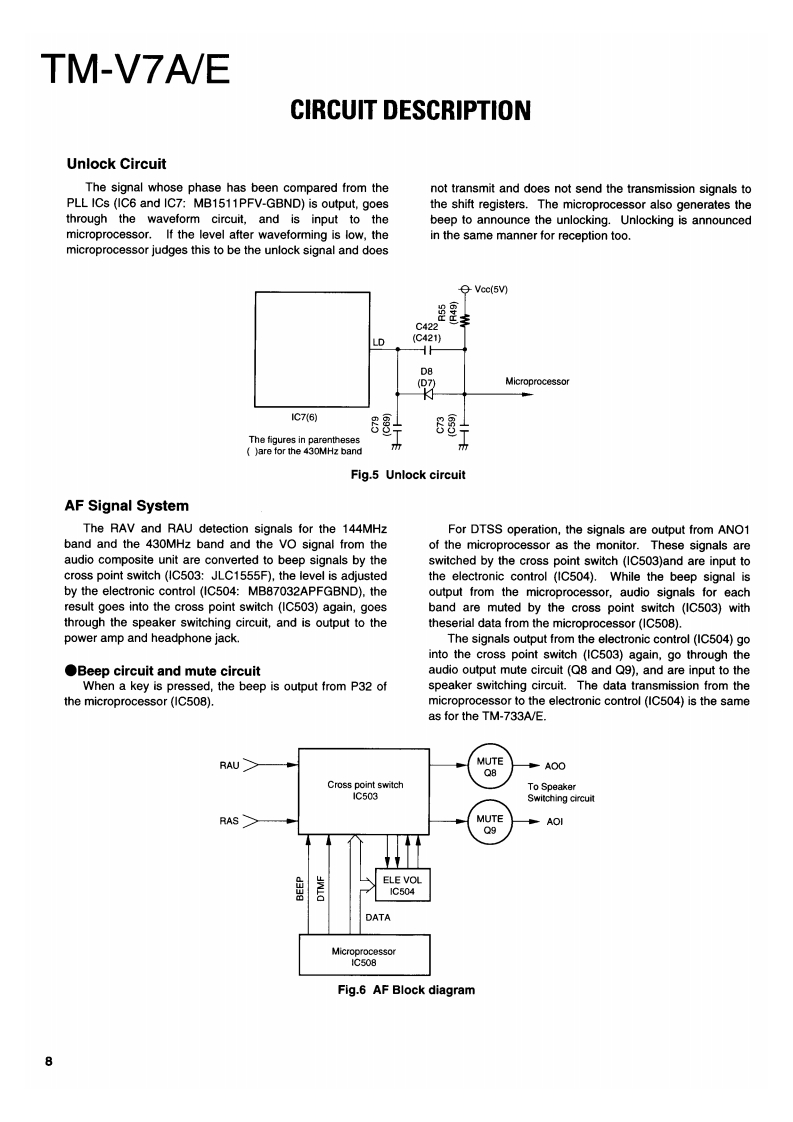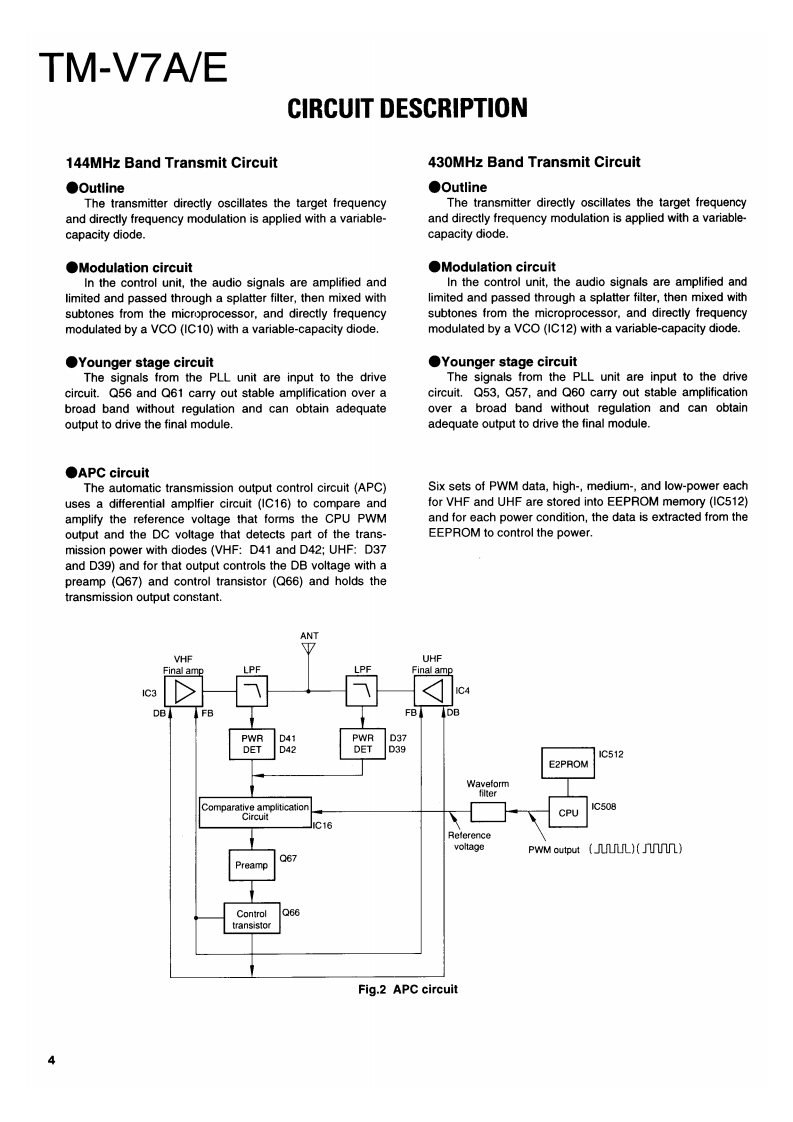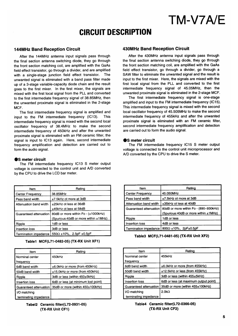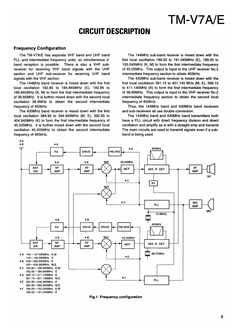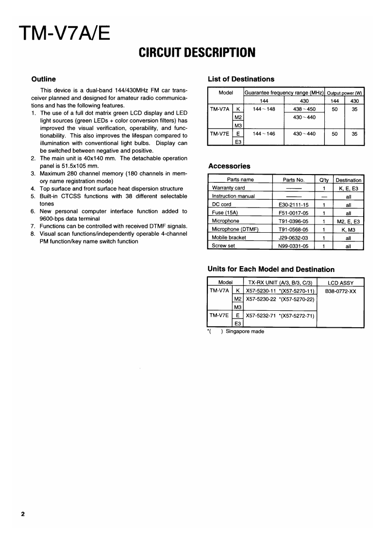 144/430MHz FM DUAL BANDERKENWOODTM-V7A/ESERVICE MANUAL1996-11 PRINTED IN JAPANB51-8348-00(B)1100Microphone assy(T91-0568-05)K.M3Metallic cabinet(Upper)(A01-2122-13)KENWOODKnob(PM)(K27-3168-23)KENWOOD PM DUAL BANGE7Knob(MNU)Knob (VFO)(K27-3169-33)(K27-3166-23)Knob (MR)(K27-3167-23)146.970448.525YTONE REU LOWCover (DIN 6P)(F07-1428-23)Sub panelKnob (MAIN)Panel assyKnob (VOL)Knob (SQL)(A22-0798-11】(K29-5133-03)(A62-0492-33K29-5134-03)0K29-5135-03)Button knob (MAIN.PUSH)(K27-3172-03)Photo is K TypeCONTENTSCIRCUIT DESCRIPTION.....2PC BOARD VIEWSEMICONDUCTOR DATA...19LCD ASSY(B38-0772-15)52DESCRIPTION OF COMPONENTS.........23TX-RX UNIT (X57-52XX-XX)(A/3)..........53TERMINAL FUNCTION.26TX-RX UNIT (X57-52XX-XX)(B/3)..........57PARTS LIST…29TX-RX UNIT (X57-52XX-XX)(C/3)........59EXPLODED VIEW........40SCHEMATIC DIAGRAM...........61PACKING41BLOCK DIAGRAM.69ADJUSTMENT......42NIRING DIAGRAM…71LEVEL DIAGRAM.......72OPTIONS(DFK-3C/DFK-4C/DFK-7C)........73SPECIFICATIONSBack cover