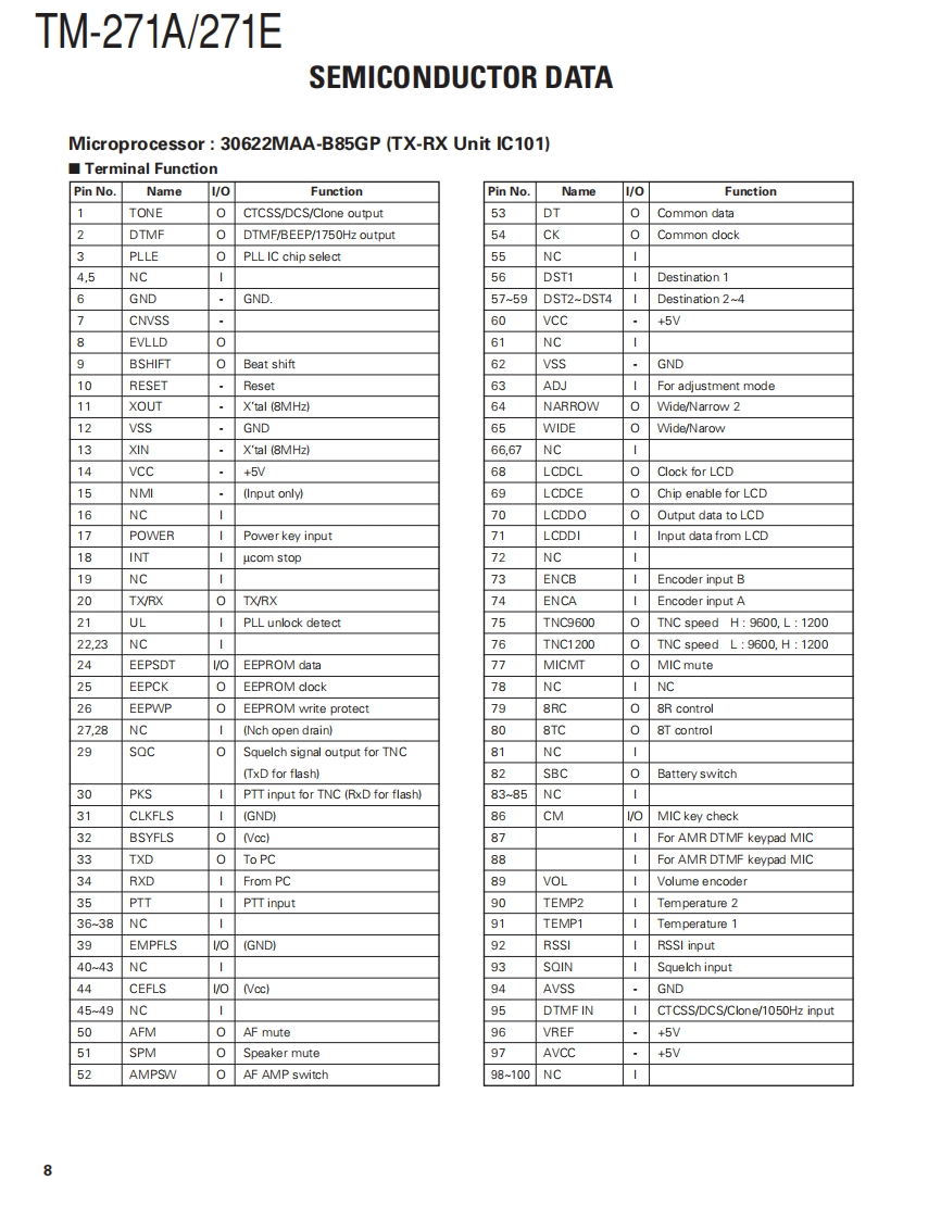 VHF FM TRANSCEIVERTM-271A/271EKENWOODSERVICE MANUAL2003-10 PRINTED IN JAPANB51-8663-00(N743TM-271A(M2,M4)Key top(K29-9291-01)MicrophoneKnob(Volume)(T91-0624-05)(K29-9292-03)Cabinet(A01-2193-01)1697099Knob (Encoder)(K29-9293-03)Panel assy(A62-.1088-03)TM-271A/E (K,M3,E)Key top(K29-9291-01)MicrophoneKnob (Volume)(T91-0641-05)(K29-9292-03)⊙⊙3图明用Cabinet(A01-2193-01)网580099Knob (Encoder)(K29-9293-03)Panel assy(A62.1088-03)CONTENTSCIRCUIT DESCRIPTION.........2TERMINAL FUNCTION .........27SEMICONDUCTOR DATA...................8PC BOARDCOMPONENTS DESCRIPTION...9DISPLAY UNIT (X54-3450-10).........28PARTS LIST...10TX-RX UNIT (X57-685X-XX)...............30EXPLODED VIEW.…17SCHEMATIC DIAGRAM.............34PACKING…18BLOCK DIAGRAM.…38RESETTING THE TRANSCEIVER...........19LEVEL DIAGRAM....40ADJUSTMENT…20SPECIFICATION.BACK COVER