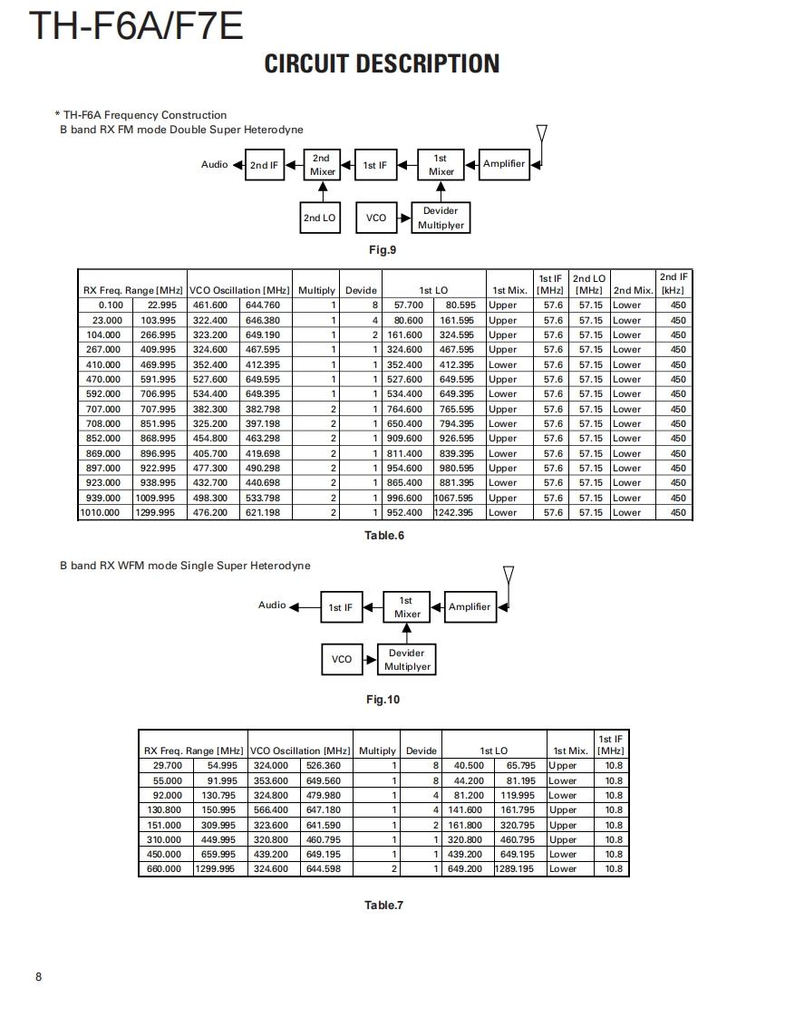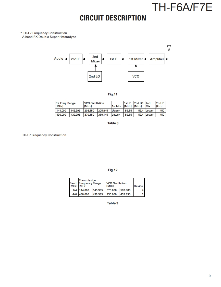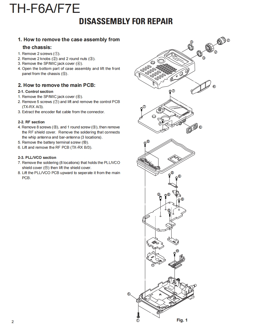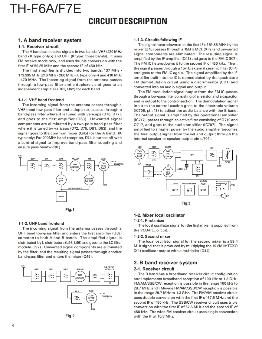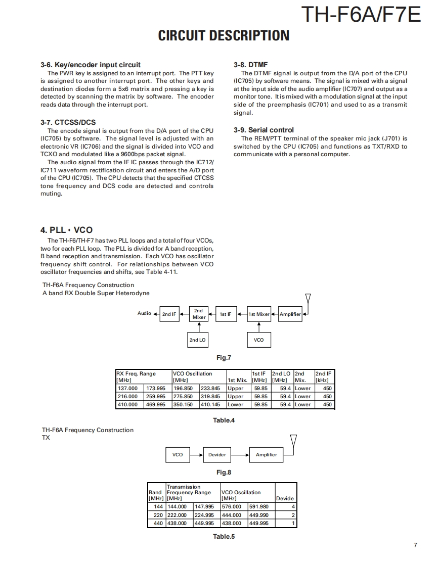 144/220/440MHz FM TRIBANDER /144/430MHz FM DUAL BANDERKENWOODTH-F6A/F7ESERVICE MANUAL2001-8 PRINTED IN JAPANB51-8580-00(S)798WHIP ANTENNA(T90-0781-05⑤:K(T90-0789-05:T.ECONTENTSKNOB(PTT/MONI)KNOB(ENC)(K29-9108-13)(K29-5159-03)DISASSEMBLY FOR REPAIR.2KNOB(VOL)CIRCUIT DESCRIPTION4(K29-5150-03)DESCRIPTION OF COMPONENTS.14PARTS LIST..19FRONT GLASS(B10-2685-13):T,EEXPLODED VIEW.........32(B10-2723-13):KPACKⅪNG33CAPKENWOODB09-0615-23)ADJUSTMENT....34PC BOARD VIEWSCABINET ASSY(A02.3620-13):T.ETX-RX UNIT (CONTROL SECTION)59(A02-3719-13):KTX-RX UNIT.....66TX-RX UNIT (VCO SECTION)..71SCHEMATIC DIAGRAM.........73BLOCK DIAGRAM.8LEVEL DIAGRAM.83KEY TOPOPTIONS...85(K29-9107-12)SPECIFICATIONS.86