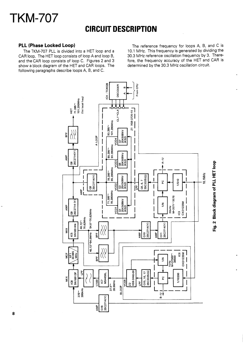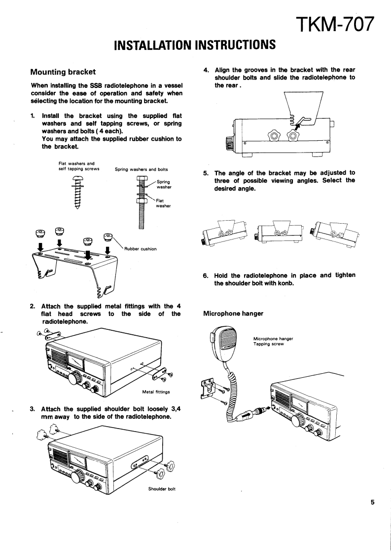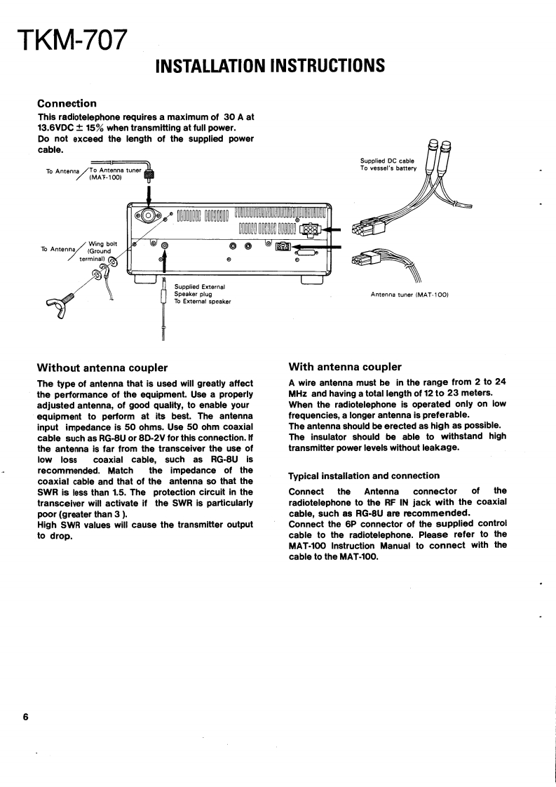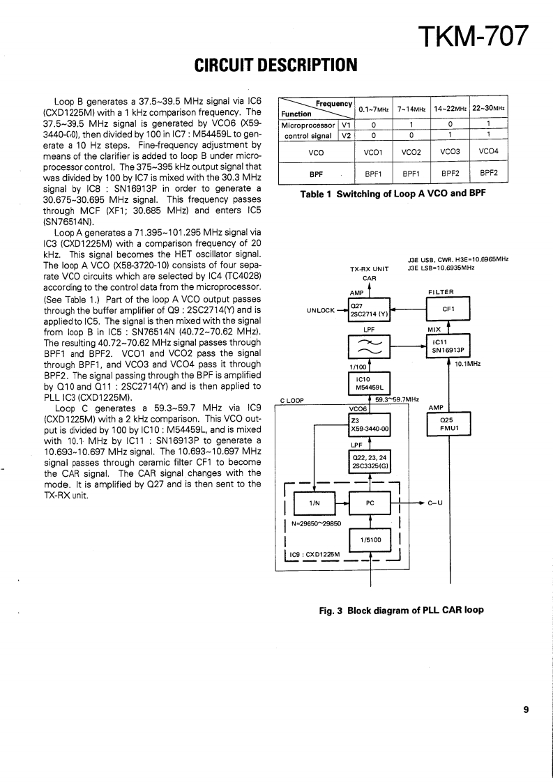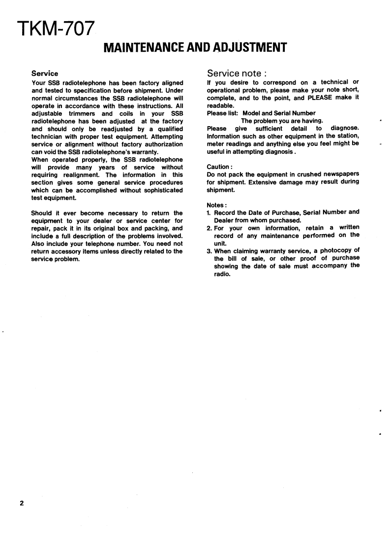 SSB RADIOTELEPHONEKENWOODTKM-707SERVICE MANUAL1989-11 PRINTED IN JAPANB51-8037-00(O)638KnobKnob(POWER SW)Panel ass'y (DRESSING PANEL)(K29-4540-14)(K29-4519-04)(A20-7061-04)Panel ass'yMetallic cabinetFront glassKnobKnob(A20-7045-13)(A01-1086-02)(B10-1129-14)(K29-4540-14)x4(K29-4539-04)×2KENWOOD2.782.0E[TKM-707MicrophoneCap (PHONES)KnobKnob(MAIN DIAL)Foot(T91-0388-05)(B09-0320-04)(K29-4540-14)×5{K29-4538-03)(J02-0323-05)×4CONTENTSMAINTENANCE AND ADJUSTMENT..................2TX-RX UNIT (X57-3470-10).…93INSTALLATION INSTRUCTIONS.5.FINAL UNIT(X45-3370-10).101CIRCUIT DESCRIPTION.SCHEMATIC DIAGRAM...............105DESCRIPTION OF COMPONENTS.27MAT-100 (AUTOMATIC ANTENNA TUNER)PARTS LIST.........33Circuit Description108EXPLODED VIEW..............63Block Diagram…122PACKING……65Description of Components..............123ADJUSTMENT..........,66Parts List........124LEVEL DIAGRAM.....76Exploded View .........129BLOCK DIAGRAM.....…77PC Board ViewTERMINAL FUNCTION81LED UNIT(W02-0844-08).…130CIRCUIT DIAGRAMS PC BOARD VIEWSANT MODULE UNIT(W02-0883-08)........131LCD ASSY(B38-0324-05).83Schematic Diagram133VC0(X58-3720-10).…83Installation Instructions...........136DC-DC(X59-1100-00)84Manual Tuning........140FAN TEMP PROTECTION (X59-3370-00).....84Specifications............141VC0(X59-3440-00).84SPECIFICATIONS.BACK COVERCONTROL UNIT (X53-3280-10)......................85
