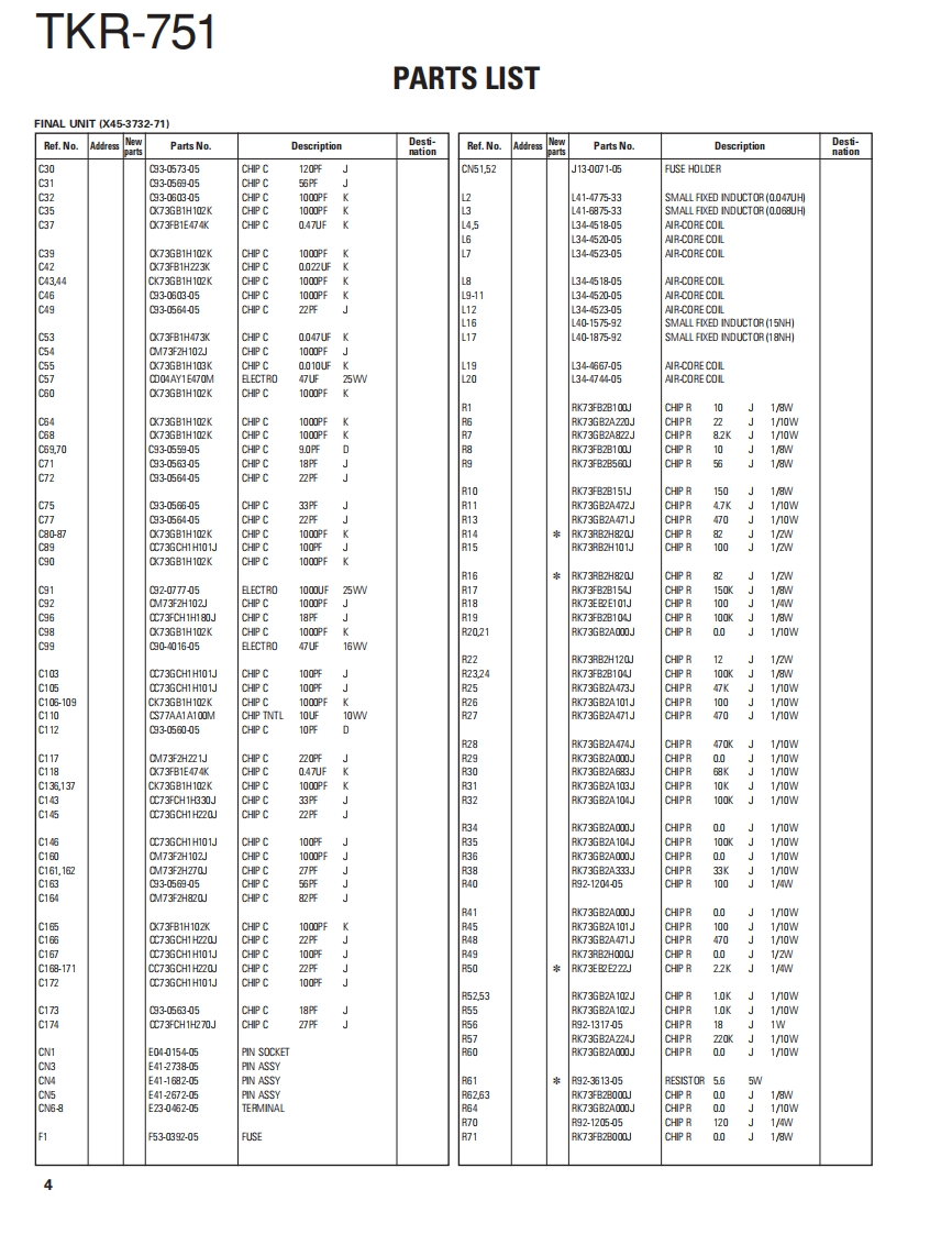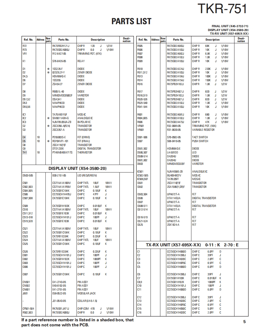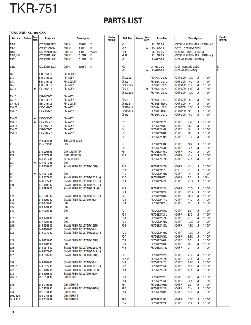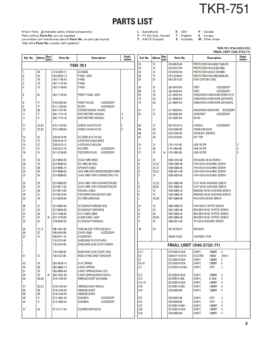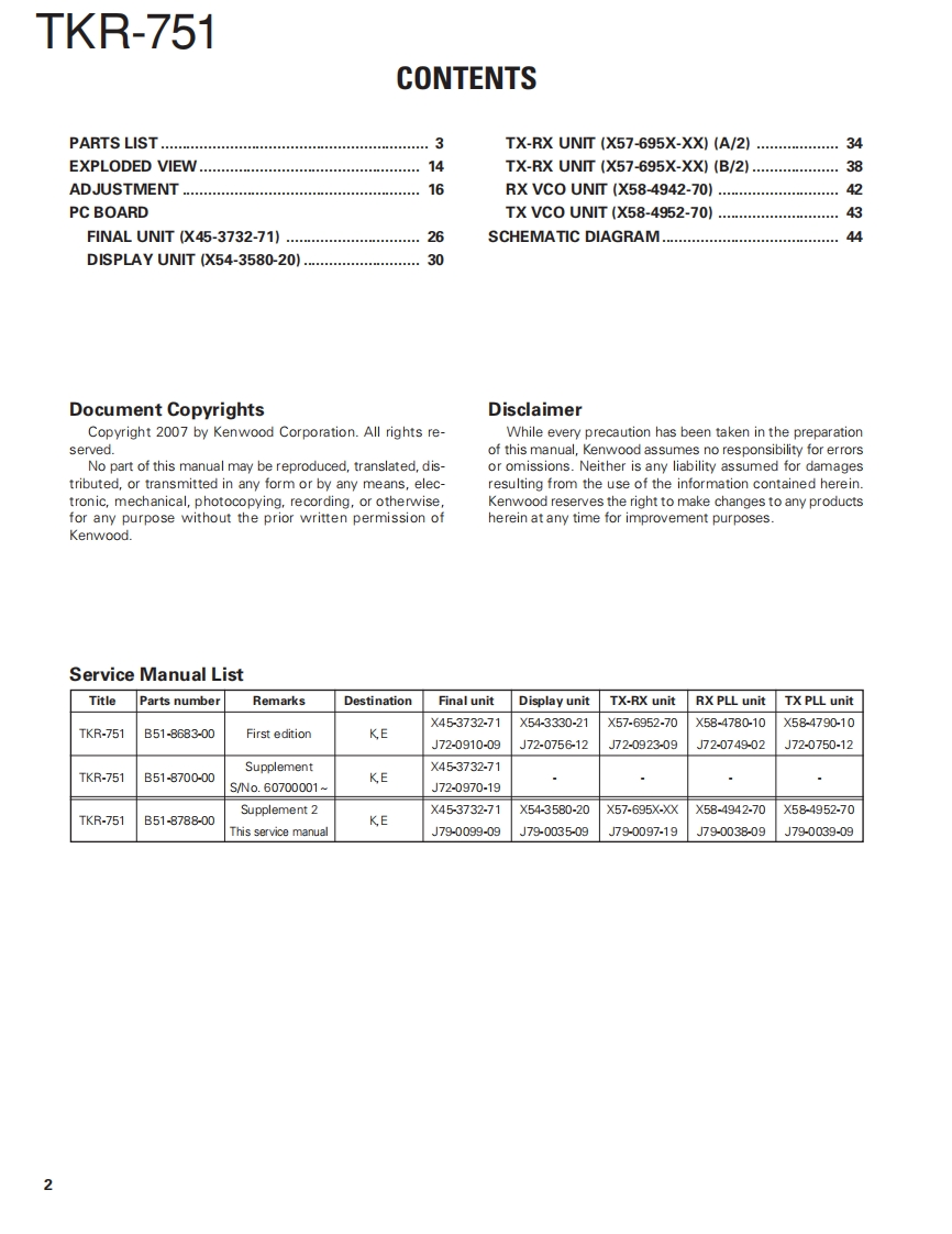 VHF FM REPEATERTKR-751KENWOODKenwood CorporationSERVICE MANUALSUPPLEMENT II2007-3 PRINTED IN JAPANB51-8788-00(N)1084This service manual is applied from the following serialnumbersK:809xX00xx-,E:801Xx0x-Front panelKnob (Volume)Knob (DC source)(A62.1149-03)(K29-5389-03))(K29-9106-04)KENWOOD回88回●Key topModular jackK29-9370-02)(E58-0522-05)Fuse(Blade,10A/32V)(F06-1032-05)×2Antenna cable (N)Antenna cable(BNC】(E303419-15)E30-3418-15)D-sub cable assyDC cord (Ext DCin)(E37.1376-05)(E30-3414-05)TEST/SPKR connector assyDC backup terminal(E37-0913-05)(E70-0402-05)LFThis product uses Lead Free solder.
