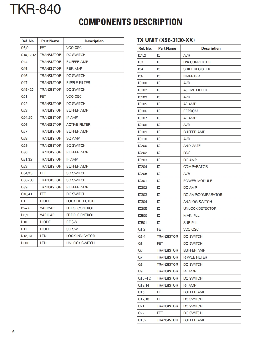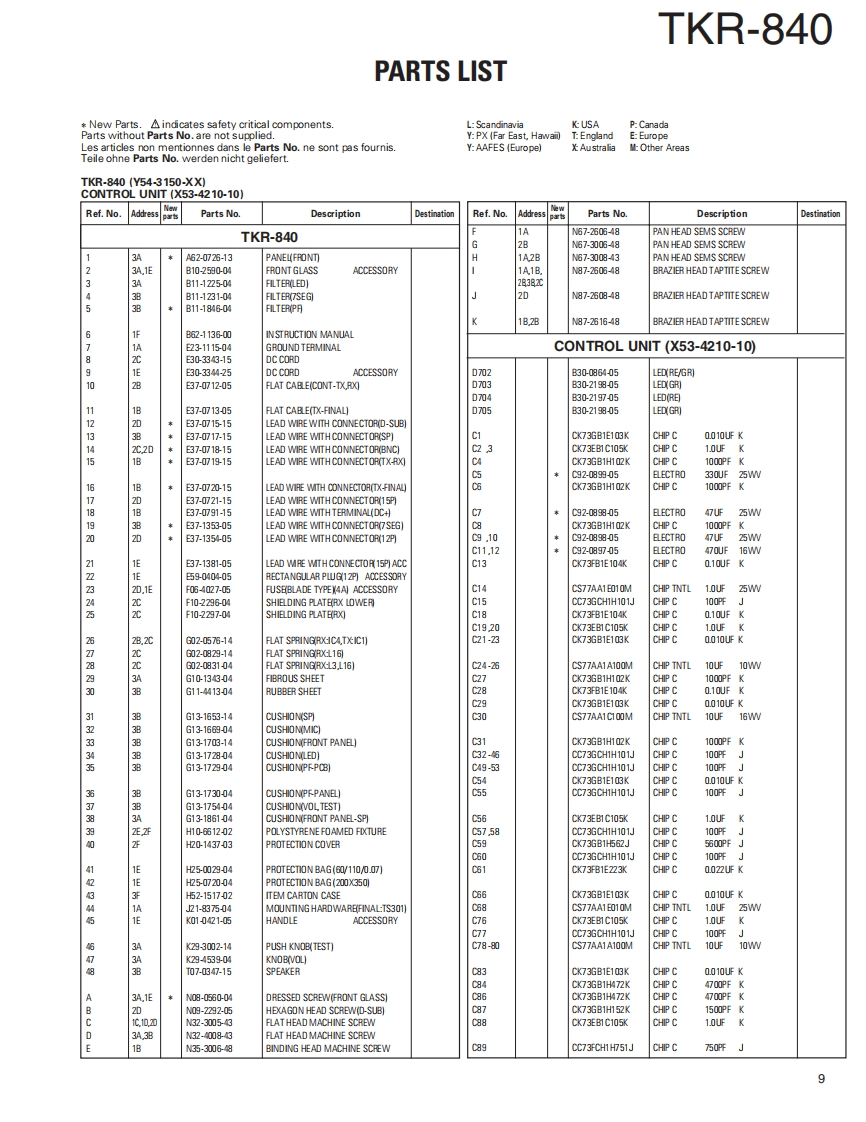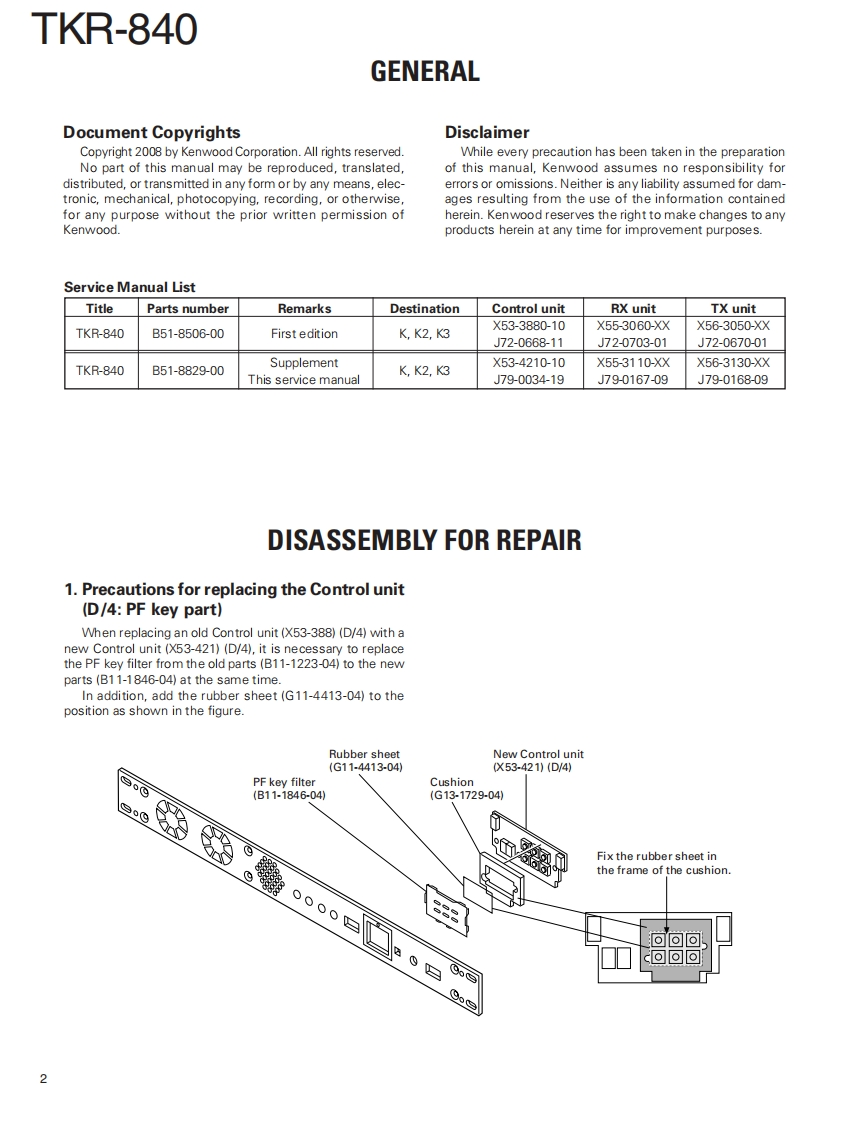 UHF FM REPEATERKENWOODTKR-840Kenwood CorporationSERVICE MANUALSUPPLEMENT2008-3 PRINTED IN JAPANB51-8829-00(S)625This service manual(B51-8829-00)applies to products with 907xxxxx or subsequent serial numbers.Refer to the TKR-840service manual(B51-8506-00)for any information which has not been covered in this service manual.Panel (Front)LEDPUSH KNOB(TEST)(A62-0726-13)(B30-2197-05)(K29-3002.14)4VoKENWOODLEDLED ASSYMODULAR JACK(B30-0864-05)(LA301DB(N))(E58-0526-05)】LEDKNOB (VOL)(B30-2198-05)K29-4539-04)CONTENTSGENERAL2PC BOARDDISASSEMBLY FOR REPAIR..............2C0NTR0 L UNIT(X53-4210-10)28COMPONENTS DESCRIPTION......5.RX UNIT(X55-3110-XX)....36PARTS LIST.8TX UNIT(X56-3130-XX040EXPLODED VIEW..........24SCHEMATIC DIAGRAM.....48PACKING.26SPECIFICATIONS.............BACK COVERSEMICONDUCTOR DATA..............27LFThis product uses Lead Free solder.