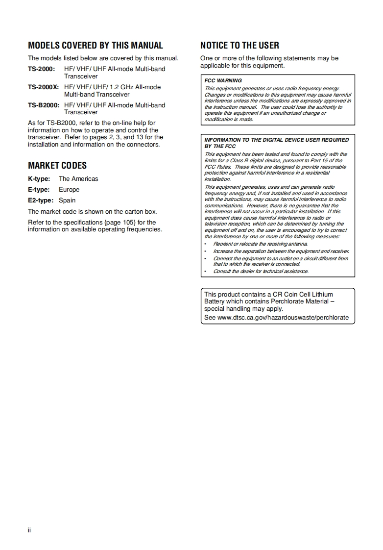 INSTRUCTION MANUALKENWOOD23850-¥325089ALL MODE MULTI-BAND TRANSCEIVERTS-2000TS-2000XTS-B2000NOTIFICATIONThis equipment complies with the essential requirements of Directive 1999/5/EC.The use of the warning symbol means the equipment is subject to restrictions ofuse in certain countriesThis equipment requires a licence and is intended for use in the countries asbelow.AT BE DK FI FR DE GRLU NL NO PT ES SE CH GB CY CZ EEHU LVLT MTPL SK SI BG RO1S03166Kenwood Corporation©B62.1221-50(K,目0908070605C∈0682①