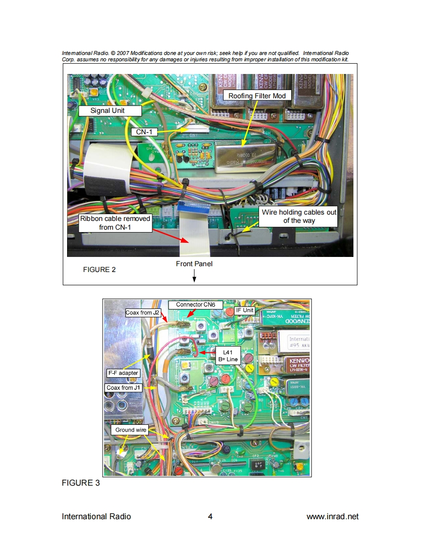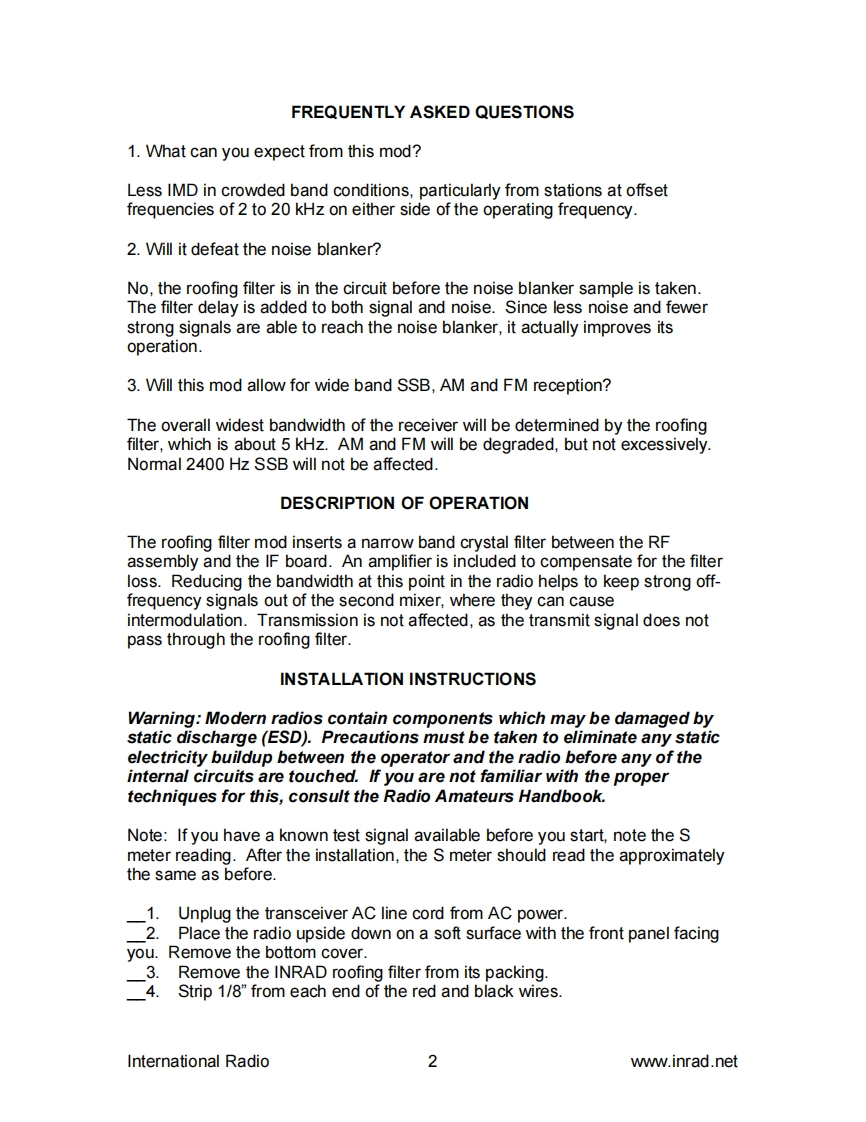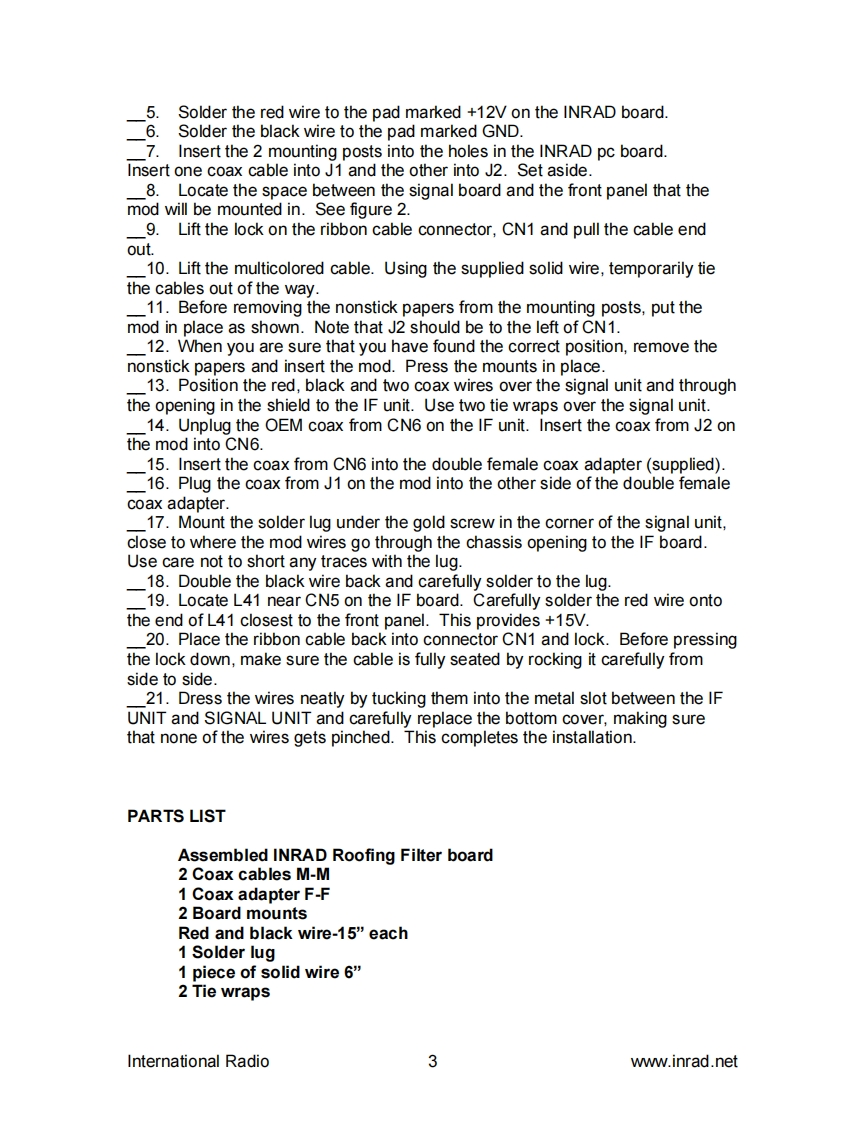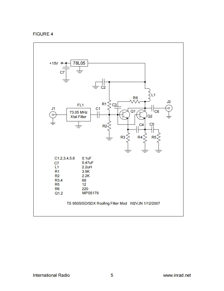 PO Box 2110,Aptos CA95001,USAtel1-831-462-5511fax:1-831-6121815e-mail:sales@inrad.net web:www.inrad.netinternational radioTS 950S,SD,SDX Roofing Filter Mod Installation Instructions.The TS 950 roofing filter mod consists of a 6 pole,4 to 5 kHz wide filter followedby a high dynamic range feedback amplifier.The amplifier provides enough gainto override the filter insertion loss.The plot below shows the sweep frequency response of the front end and first IFfilter installed in a TS 950SDX radio.The wider curve is the OEM response andthe narrow curve is with the INRAD roofing filter mod added.A dBMARCONI-10.0Atten 10dB 50oTG -10.0dBm Ext etd 2382-20.0-30.0-40.0-50.0-60.0-70.01-80.01-90.0-100.0-110.0DADDDRef73.0500MHz10.OkHz/div Res bw1kHzAvg 2Inc10kHz50ms /div Vid bw 700HzFIGURE 1The result of the bandwidth improvement shown above is the reduction of closein intermodulation from multiple signals.The IMD dynamic range will beimproved 5 to15 dB for some signal spacings.Also,the blocking dynamic rangewill be improved up to 10 dB for close in signals.International Radio1www.inrad.net