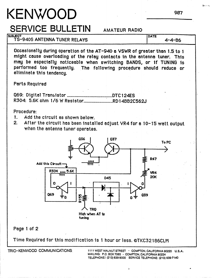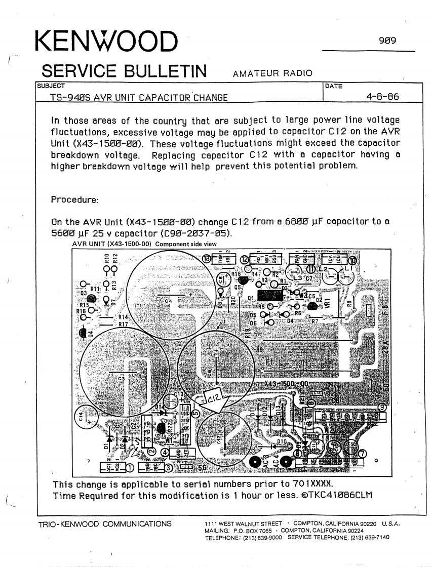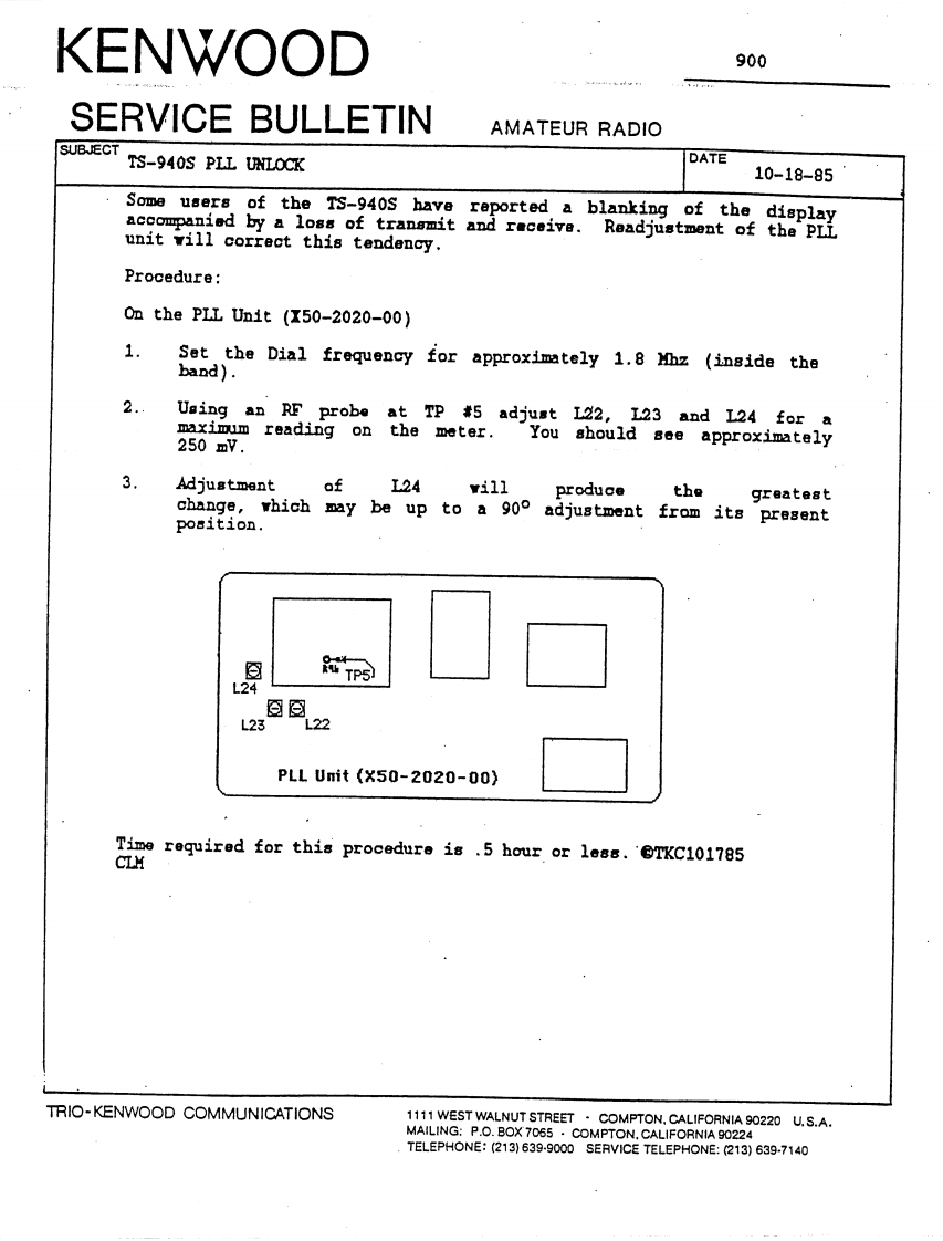 KENWOOD896.SERVICE BULLETINAMATEUR RADIOSUBJECTDATETS-940S LCD CLOCK DISPLAY ERRATIC OPERATION9-14-85We have reoeived a fow roporte oonoerning orratio operation of the LCDclock display when the Main Dial is rotated,or the VBT or SLOPE TUNEcontrols are.operated.This appears as if you had preseed the SET,SCROLL,OR GRAPH switches.This erratic operation may be caused by improper timing of the inputpulses applied to the auxiliary display microprocessor,IC 1.1.This symptom is easily correated by replacing Ic 2MBM2764-30T1with MBM2764-30T2,on Digital UnitA (X54-1830-00).Early modelsof the improved Ic will carry the old nomenclature but will bedistinguished by a white dot on the top of the chip.2.After the Ic has been changed reset the main microprocessor bypressing and holding the [A-B]key,and then turning the powerswitch OFF and then back ON.Then release the [A=B]key.3.After this change is made the subdisplay vill not immediately trackthe main display.A slight delay has been introduced in the new Icto.prevent any timing errors.It may take approximately 0.5 secondsfor the LCD to traok the main display.4.Please return the old IC 2 to the Service Department along with thethe WSR for credit.Perform this procedure only if the symptom occurs,as a repair.Thischange is not required othervise.Time required for this modifioation is 1 hour or less.TKC985CLMTRIO-KENWOOD COMMUNICATIONS1111 WEST WALNUT STREET COMPTON.CALIFORNIA 90220 U.S.A.MAILING:P.O.BOX 7065.COMPTON.CALIFORNIA 90224TELEPHONE:(213)639-9000 SERVICE TELEPHONE:(213)639-7140