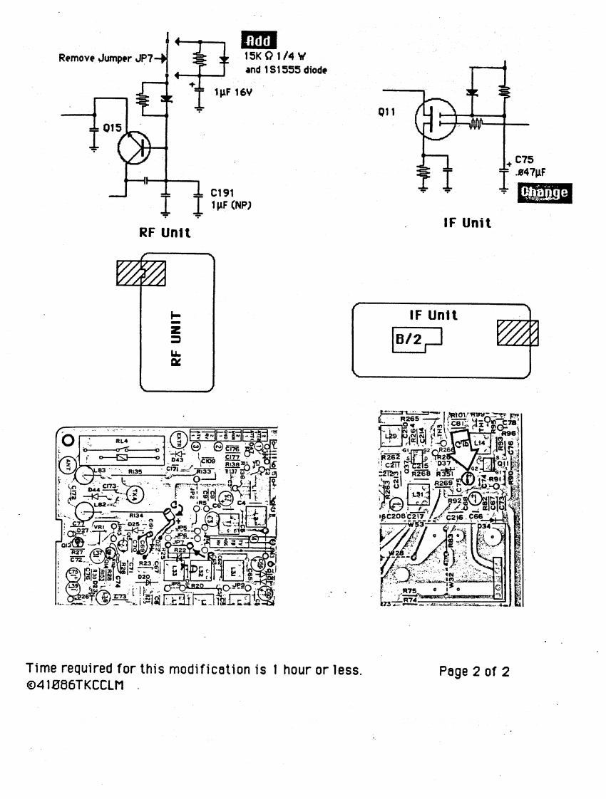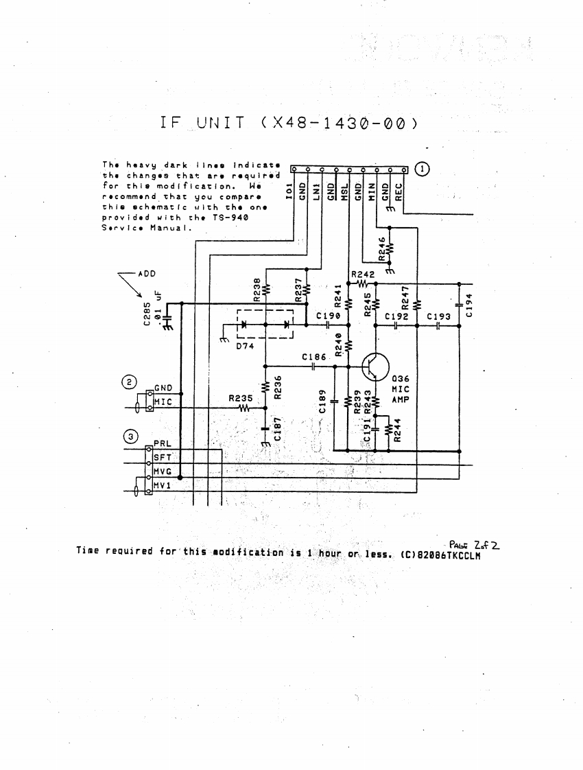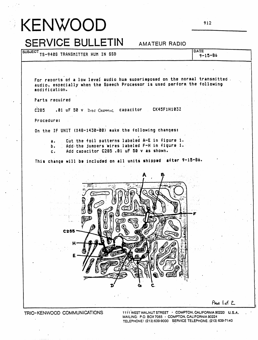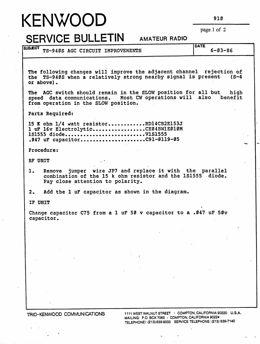 KENWOOD896.SERVICE BULLETINAMATEUR RADIOSUBJECTDATETS-940S LCD CLOCK DISPLAY ERRATIC OPERATION9-14-85We have reoeived a fow roporte oonoerning orratio operation of the LCDclock display when the Main Dial is rotated,or the VBT or SLOPE TUNEcontrols are.operated.This appears as if you had preseed the SET,SCROLL,OR GRAPH switches.This erratic operation may be caused by improper timing of the inputpulses applied to the auxiliary display microprocessor,IC 1.1.This symptom is easily correated by replacing Ic 2MBM2764-30T1with MBM2764-30T2,on Digital UnitA (X54-1830-00).Early modelsof the improved Ic will carry the old nomenclature but will bedistinguished by a white dot on the top of the chip.2.After the Ic has been changed reset the main microprocessor bypressing and holding the [A-B]key,and then turning the powerswitch OFF and then back ON.Then release the [A=B]key.3.After this change is made the subdisplay vill not immediately trackthe main display.A slight delay has been introduced in the new Icto.prevent any timing errors.It may take approximately 0.5 secondsfor the LCD to traok the main display.4.Please return the old IC 2 to the Service Department along with thethe WSR for credit.Perform this procedure only if the symptom occurs,as a repair.Thischange is not required othervise.Time required for this modifioation is 1 hour or less.TKC985CLMTRIO-KENWOOD COMMUNICATIONS1111 WEST WALNUT STREET COMPTON.CALIFORNIA 90220 U.S.A.MAILING:P.O.BOX 7065.COMPTON.CALIFORNIA 90224TELEPHONE:(213)639-9000 SERVICE TELEPHONE:(213)639-7140