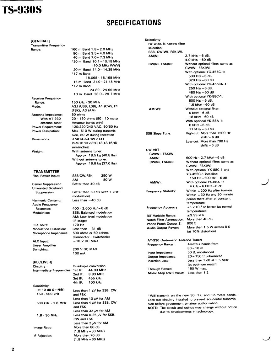 KENWOODSERVICE MANUALTS-930SSP.930,AT-930,S0-1HF TRANSCEIVER2090:.CONTENTSSPECIFICATIONS....................2MAIN ENCODER UNIT(X54-1680-0O)+-.···40CIRCUIT DESCRIPTION3RIT ENCODER UNIT (X54-1690-00)...40FILTER DATA20SIGNAL UNIT (X57-1000-11)41SEMICONDUCTOR DATA21PARTS LIST.................…45OUTSIDE VIEWS.........28PACKING........2……59PC BOARD VIEWS行名+队外章DISASSEMBLY..................60LPF UNIT (X51.128000:5029ADJUSTMENT .......63SW UNIT(X41-141000)·.30,31LEVEL DIAGRAM.,.·78,79POWER SUPPLY UNIT (X43-1430-00).--....32,33BLOCK DIAGRAM80RF UNIT(X441490-00):...32,33SP930.81PLL UNIT(X50-188000).i…于3435AT-930.,……·83DIGITAL UNIT (X54-1670-00)……36,37BACK COVERAT UNIT(X57-1010-00)...,.··.·38,39INTERCONNECT100 W FINAL UNIT.(X56-1430-001.......40SIGNAL UNIT SCHEMATIC.,.·.....·INSERT