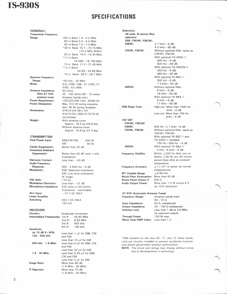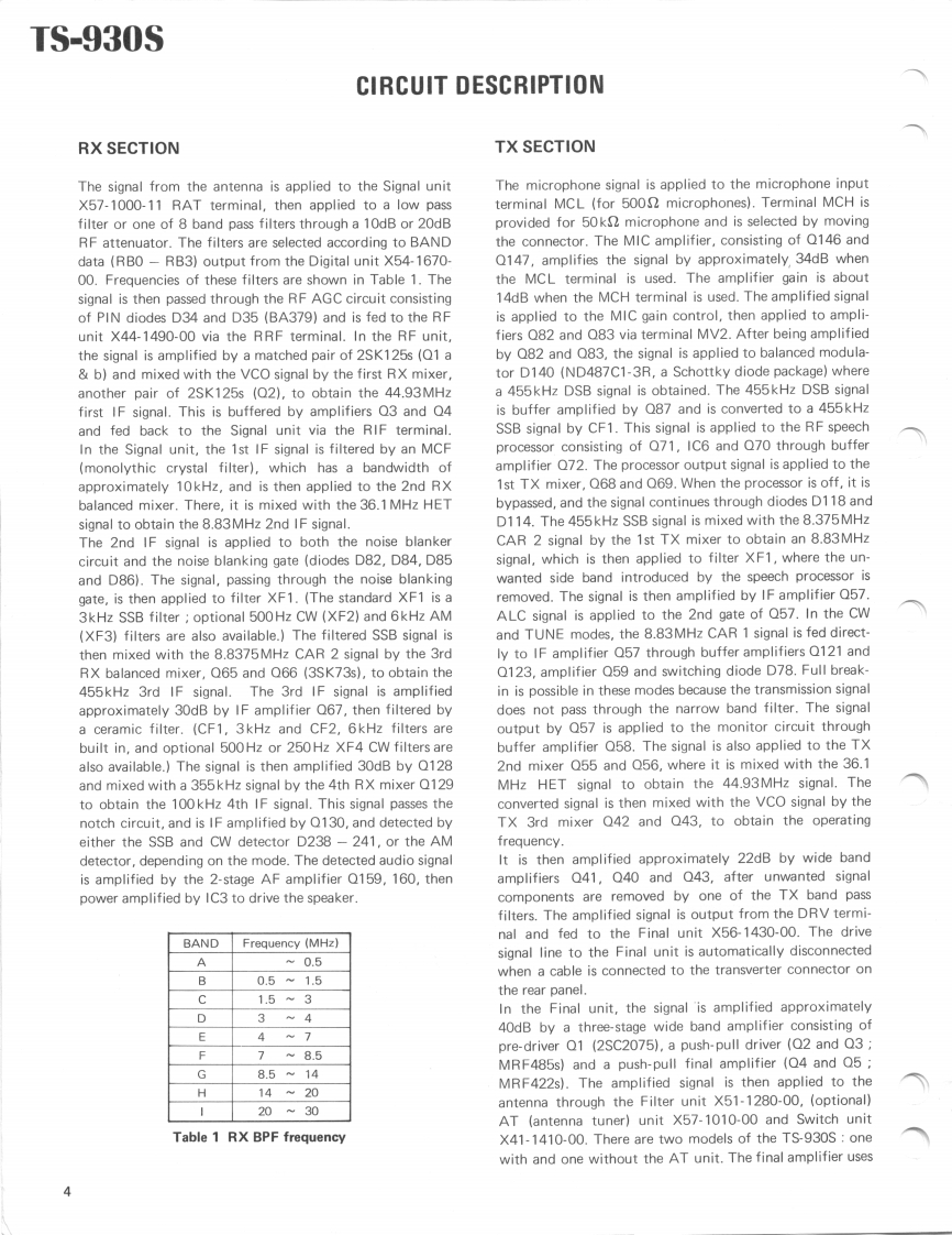 KENWOODSERVICE MANUALTS-930SSP-930,AT-930,S0-1HF TRANSCEIVER6CONTENTSSPECIFICATIONS2RIT ENCODER UNIT (X54-1690-00).35,38CIRCUIT DESCRIPTIONAT UNIT(X57-1010-00).,..,.36,37FILTER DATA..........................20100W FINAL UNIT (X56-1430-00)38SEMICONDUCTOR DATA21SIGNAL UNIT (X57-1000-11).39,40OUTSIDE VIEWS.,.…28PARTSLIST............................41PC BOARD VIEWSPACKING,..,·52SWITCH UNIT (X41-1410-00)29DISASSEMBLY .53POWER SUPPLY UNIT (X43-1430-00)30LEVEL DIAGRAM56RF UNIT(X44-1490-00)..·······%ADJUSTMENT57LPF UN1T(X51-1280-00)31BLOCK DIAGRAM72PLL UNIT(X50-1880-00)32,33SP.93073DIGITAL UNIT (X54-1670-00)34,35AT-93075MAIN ENCODER UNIT (X54-1680-00)35,38S0-1....BACK COVER