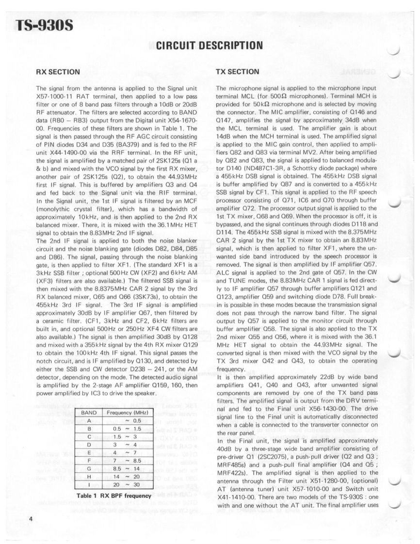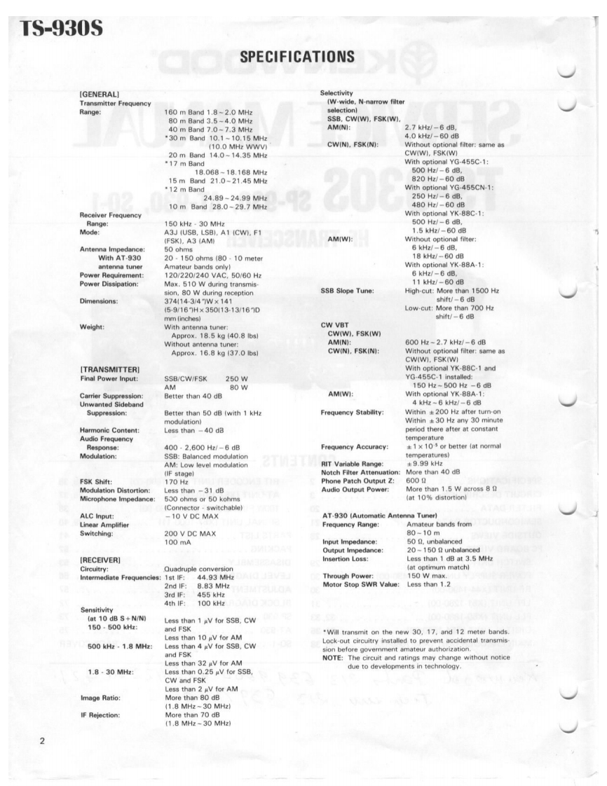 KENWOODSERVICE MANUALTS-930SSP-930,AT-930,S0-1HF TRANSCEIVER990:.CONTENTSSPECIFICATIONS……2RIT ENCODER UNIT (X54-1690-00)..35,38CIRCUIT DESCRIPTION....................ATUN1T(X57-1010-00)....36,37FILTER DATA......20100W FINAL UNIT (X56-1430-00)38SEMICONDUCTOR DATA21SIGNAL UNIT (X57-1000-11)......39,40OUTSIDE VIEWS.,......,··28PARTS LIST,....,.,,.,....41PC BOARD VIEWSPACKING52SW1 TCH UNIT(X41-1410-00).......29DISASSEMBLY...53POWER SUPPLY UNIT (X43-1430-00)30LEVEL DIAGRAM56RF UNIT(X441490-00)..·,····30ADJUSTMENT..57LPF UN1T(X51-1280-00).·..,.·.··,.31BLOCK DIAGRAM72PLL UN1T(X50-1880-00)32,33SP930……73DIGITAL UNIT (X54-1670-00)34,35AT-93075MAIN ENCODER UNIT (X54-1680-00)......35,38SO-1.........................BACK COVERKuWo0lPan21363☑99oo2元k422ou429Tee么b6397140
