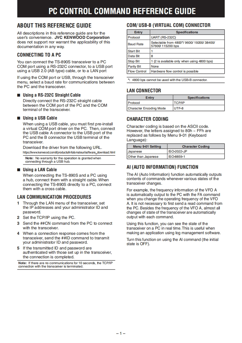 TS-890S_PC_control_使用说明书手册_2019找手册网31天前发布关注私信0.64MB77页045TS-890S_PC_control_使用说明书手册_2019此内容为付费资源,请付费后查看¥19¥21黄金会员免费钻石会员免费登录购买付费资源 第1页 / 共77页 第2页 / 共77页 第3页 / 共77页 第4页 / 共77页 第5页 / 共77页 第6页 / 共77页 第7页 / 共77页 第8页 / 共77页 第9页 / 共77页 第10页 / 共77页 试读已结束,还剩67页,您可下载完整版后进行离线阅读 THE END建武 文本预览 KENWOODTS-890SPC CONTROL COMMANDReference GuideJVCKENWOOD CorporationJanuary/30/2019 查看更多 收起部分 喜欢就支持一下吧收藏