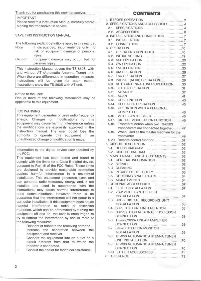 TS-850S_user操作说明书手册找手册网31天前发布关注私信61.66MB85页039TS-850S_user操作说明书手册此内容为付费资源,请付费后查看¥19¥21黄金会员免费钻石会员免费登录购买付费资源 第1页 / 共85页 第2页 / 共85页 第3页 / 共85页 第4页 / 共85页 第5页 / 共85页 第6页 / 共85页 第7页 / 共85页 第8页 / 共85页 第9页 / 共85页 第10页 / 共85页 试读已结束,还剩75页,您可下载完整版后进行离线阅读 THE END建武 文本预览 HF TRANSCEIVERTS-850SINSTRUCTION MANUALKENWOOD CORPORATIONKENWOODCPRINTED IN JAPAN B62-0061-10(K,X)(T)92/12111098765432191/12111098765 查看更多 收起部分 喜欢就支持一下吧收藏