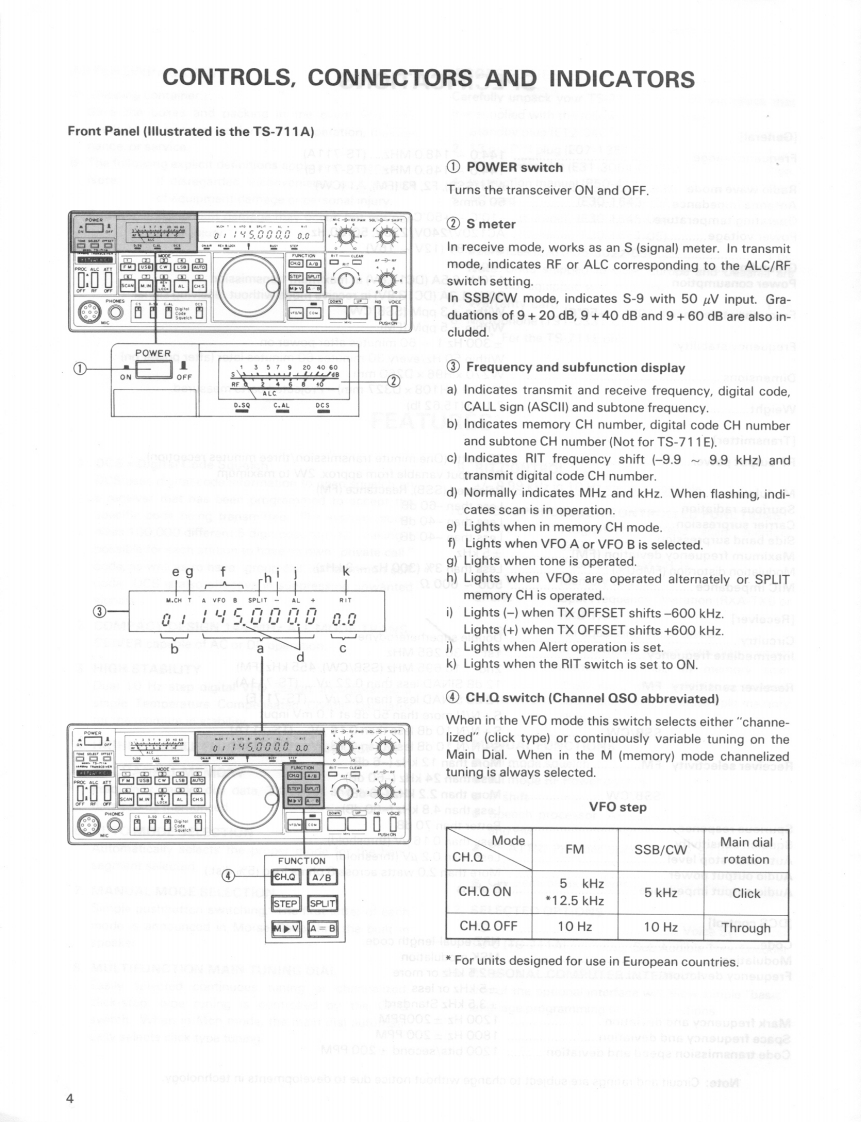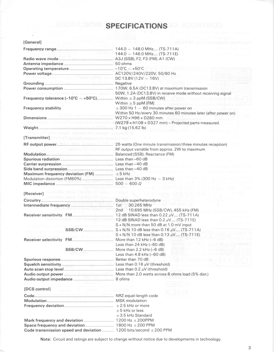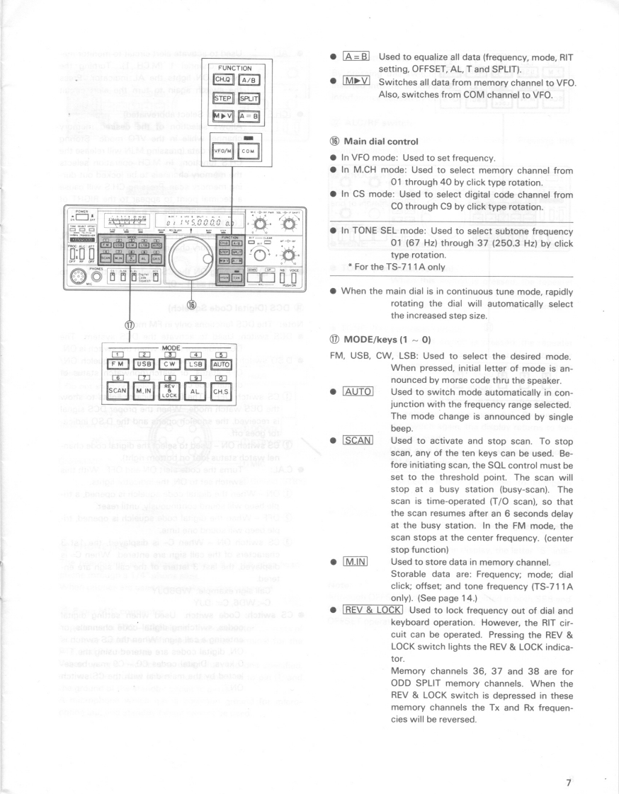 KENWOODTS-711A/E144 MHz ALL MODE TRANSCEIVERINSTRUCTION MANUAL450000ae品品品品品®⊙iii=iIllustrated is the TS-711A version.Thank you for purchasing of our latest product,theTS-711A/E transceiver.Please read this instructionmanual carefully before placing your transceiver inservice.The unit has been carefully engineered andmanufactured to rigid quality standards,and shouldprovide you satisfactory and dependable operationfor many years.CONTENTSACCESSORIES (SUPPLIED)..3FEATURESSPECIFICATIONS.…3CONTROLS,CONNECTORS AND INDICATORS............OPERATIONAUTO MODE SETTING.11DIAL FREQUENCY11INITIAL FREQUENCY SETTING..1CONFIRMATION BY MEANS OF BEEP SOUND........11FM OPERATION.11SSB OPERATION.…12CW OPERATION.........13SATELLITE COMMUNICATIONS.13FUNCTION CONTROLS AND SWITCHES14DIGITAL FUNCTION.15SCAN15ALERT OPERATION.....16DCS SYSTEM FEATURES.....16FIXED STATION OPERATION....1MOBILE INSTALLATION [GENERAL]...19MAINTENANCE AND ADJUSTMENT.0TROUBLESHOOTING.......................22ACCESSORIES (OPTION)23CIRCUIT DESCRIPTION......25BLOCK DIAGRAM....28PLL UNIT SCHEMATIC DIAGRAM.29