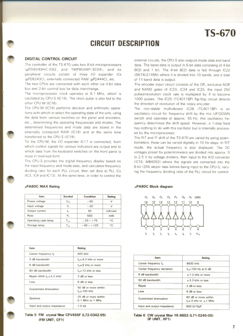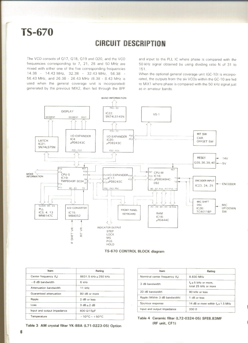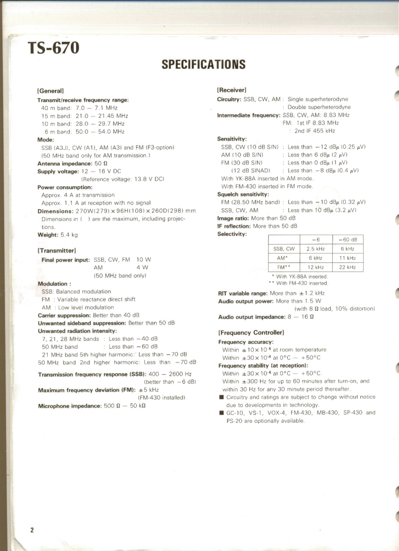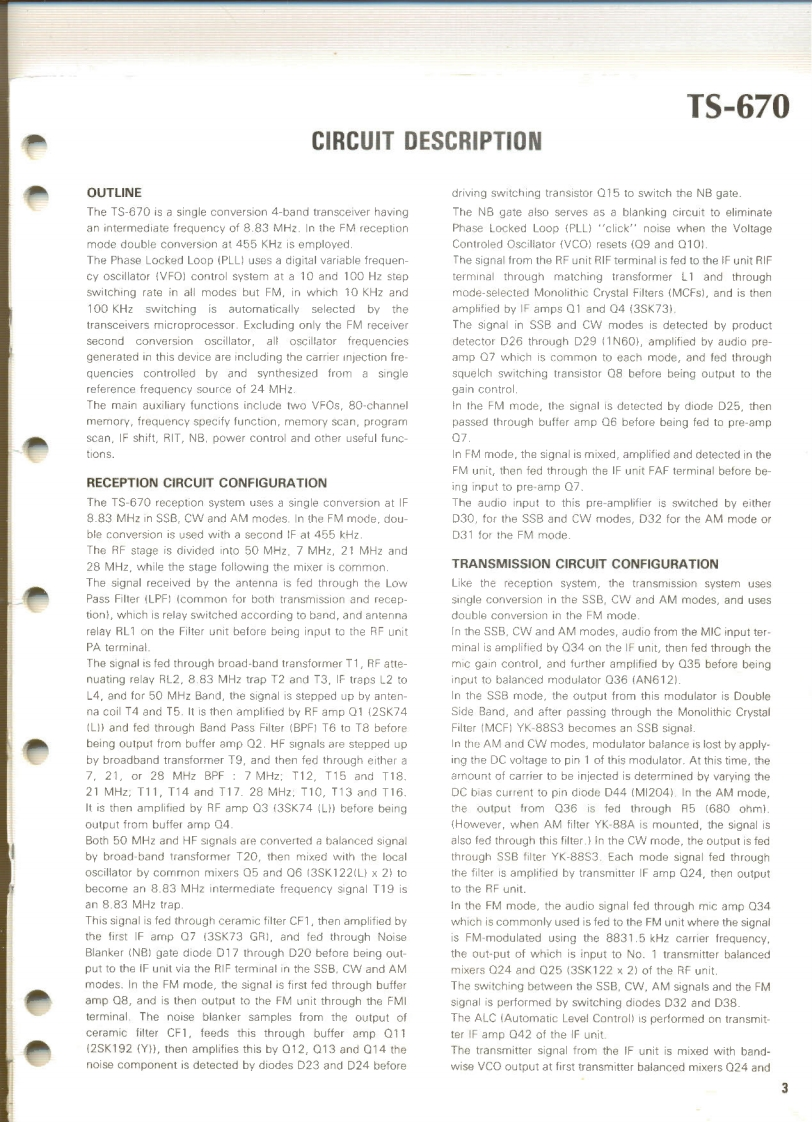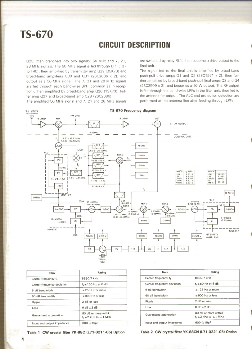 KENWOODSERVICE MANUALModel TS-670FM-430,GC-10,VS-1mALL MODE QUAD BANDE3430or2817SLE050CONTENTSSPECIFICATIONS.2ADJUSTMENT..22CIRCUIT DESCRIPTION.3PACKING3PARTS LIST..LEVELDIAGRAM.34PC BOARD VIEW....................18BLOCK DIAGRAM.35SWITCH UNIT (X41-1550-00)............18DISASSEMBLY ...............36RF UNIT(X44-1580-00).......19TERMINAL FUNCTION.38IFUN1T(X48-1390-00)..200PT0N....42C0 NTROL UNIT(X53-1370-00)..21GC-10..42FINAL UNIT(X45-1350-00..22FM-43046FILTER UNIT(X51-1320-001.22VS-1.48DISPLAY UNIT(X54-1800-00)....22SCHEMATIC DIAGRAM........................47ENCODER UNIT (W02-0328-10).........22