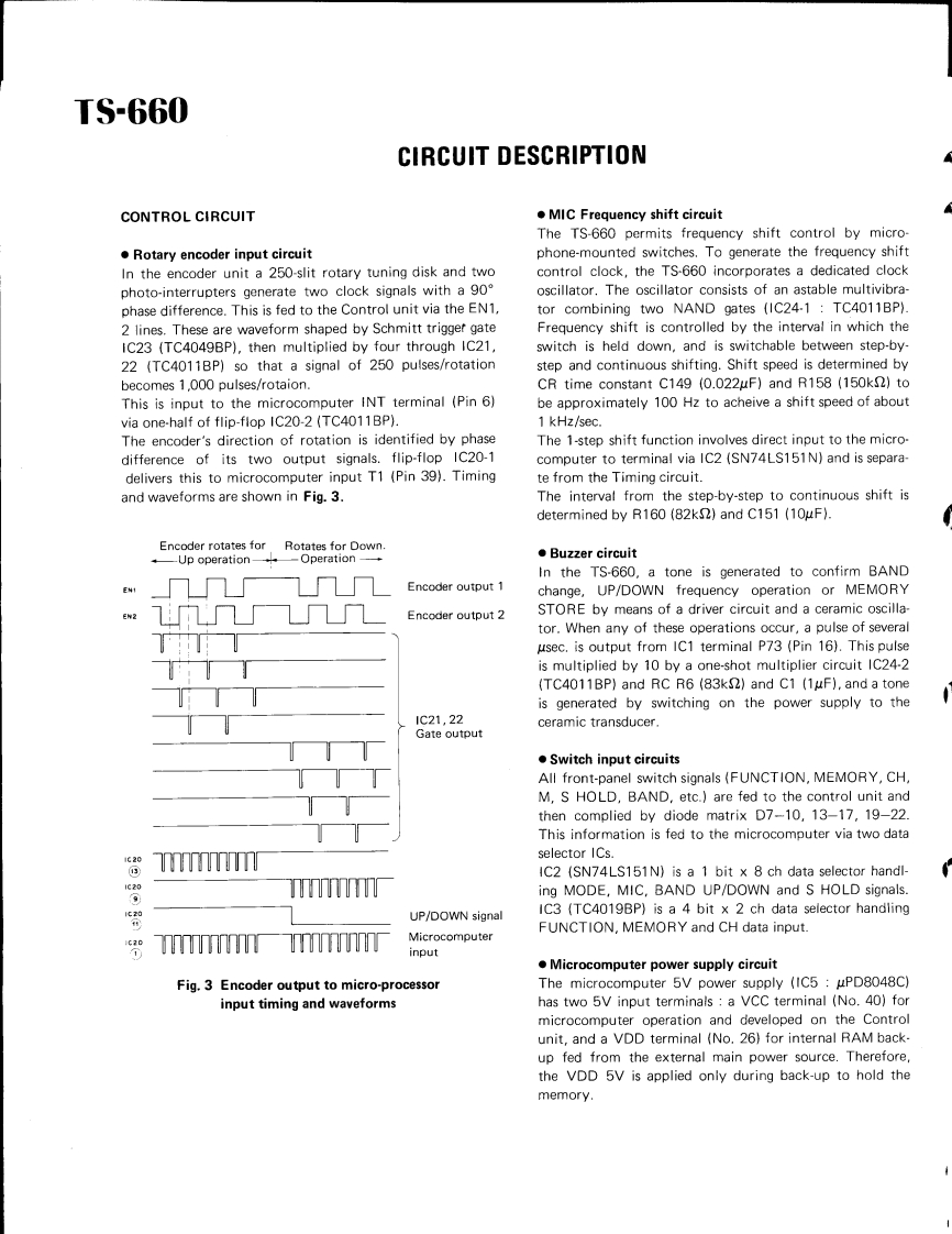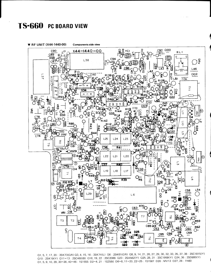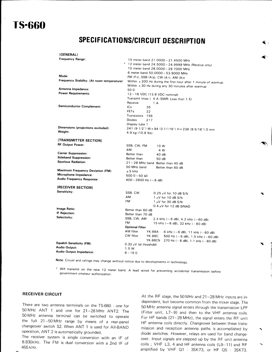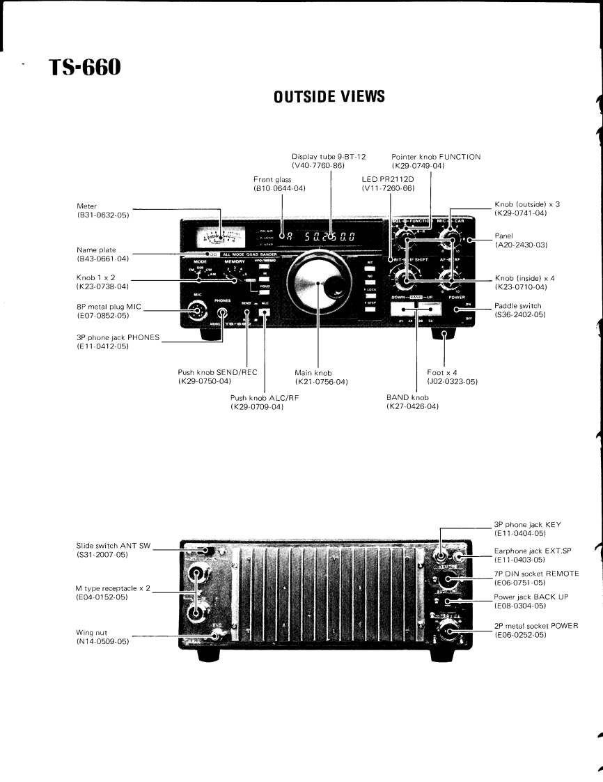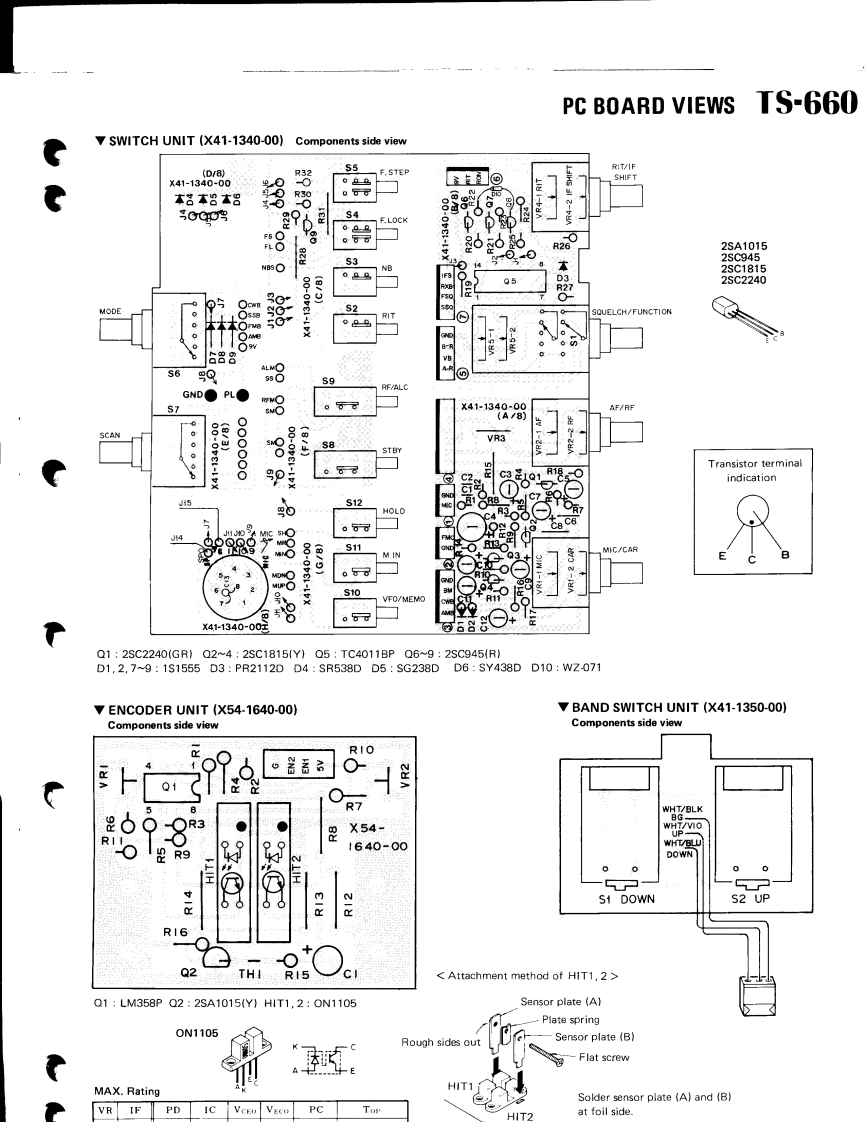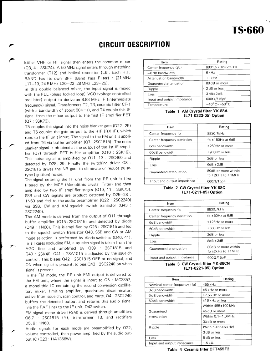 KENWOOD00132SERVICE MANUALMode TS-660V0X-4,SP-120,PS-20,MB-100ALL MODE QUAD BANDER8502500CONTENTSSPECIFICATIONS.........................2DISPLAY UNIT(X54-1630-00)..·......18CIRCUIT DESCRIPTION…,……2PARTS LIST,,19OUTS1 DE VIEWS...,,,,··8DISASSEMBLY27PC BOARDS/CIRCUIT DIAGRAMSLEVEL DIAGRAM.,......······29SW1 TCH UN1T(X41-1340-00}:..····9ADJUSTMENTS30BAND SW1 TCH UNIT(X41-1350-00)..·.·.·.9,15BLOCK DIAGRAM.42ENC0 DER UNIT(X54-1640-00).....9,15V0X4…43RFUN1T(X44-1440-00)........·10TERMINAL FUNCTIONS47FM UNIT(X48-1340-00)11PACKING......,...,.......491FUN1T(X48-1330-00)12,13SCHEMATIC DIAGRAM.··········50CONTROL UNIT (X53-1220-00)14,1551PLL UNIT(X50-1740-00)16PS20……SP-120........................BACK COVERFILTER UNIT (X51-1260-00)17MB-100BACK COVERFINAL UNIT(X561410-00)..·.··.·····17