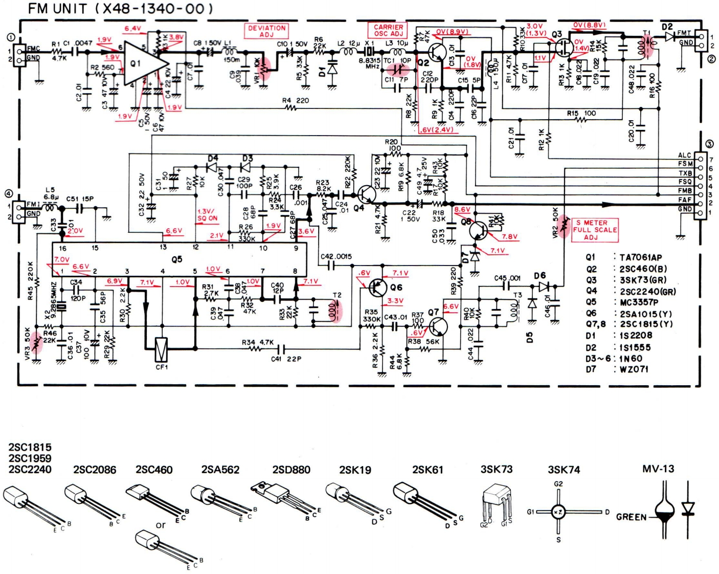 VSWITCH UNIT (X41-1340-00)Components side viewRIT/IF(D/8)R32SHIFTX41-1340-00本8本8本8GGHo鸦S4.LOC2SA1015S32SC9452SC1815815)2SC2240MODES>RITSQUELCH/FUNCTIONS6S9RF/ALOGNDS7X41-1340-00AF/RF(A8)SCANSTBYTransistor terminalindicationJ15S12HOLD02U148s11MIC/CARs10VFO/MEMOX41-1340-00定Q1:2SC2240(GR)Q2~4:2SC1815(Y)Q5:TC4011BPQ6~9:2SC945(R)D1,2,7~9:1S1555D3:PR2112DD4:SR538DD5:SG238DD6:SY438DD10:WZ071VENCODER UNIT (X54-1640-00)VBAND SWITCH UNIT (X41-1350-00)Components side viewComponents side viewR7T/BLKX54-/M01640-00WHT/BLR9DOWNS1DOWN-0608S2 UPRI6Q1:LM358PQ2:2SA1015Y)HIT1,2:ON1105Sensor plate (A)Plate spring0N1105Rough sides outSensor plate (B)Flat screwMAX.RatingHITSolder sensor plate (A)and (B)VR IFPD IC VcEo VEco PCTop.HIT2at foil side.3V50mA75mW20mA30V5V100mW-25-+85℃