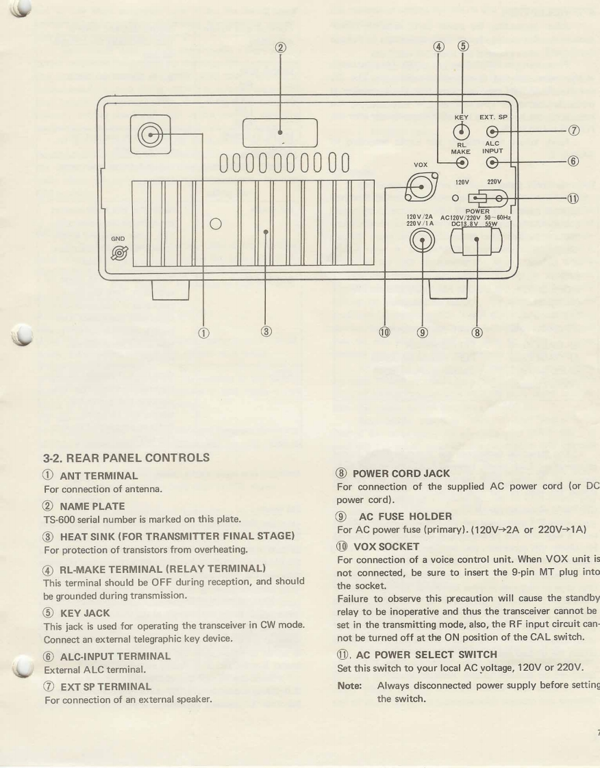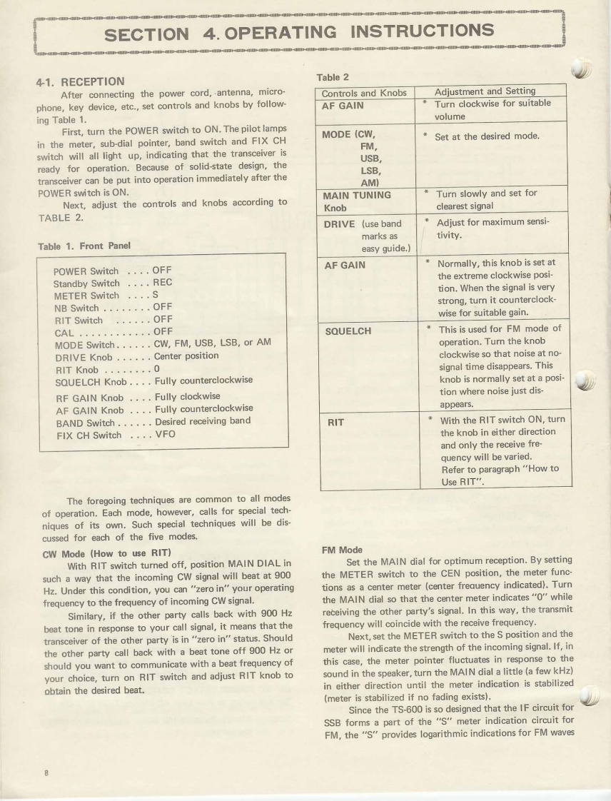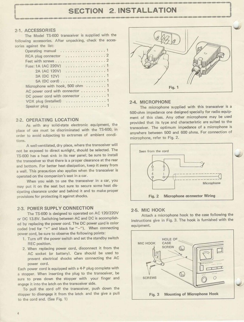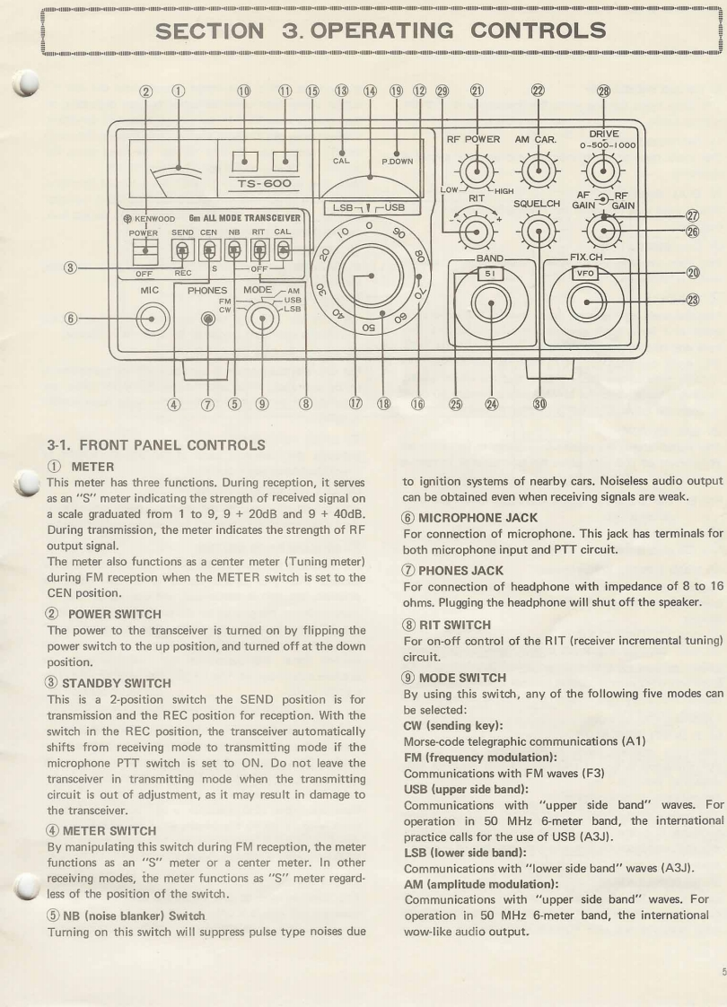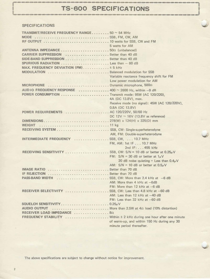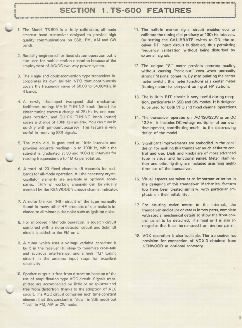 KENWOOD6m ALL MODE TRANSCEIVERModel TS-600OPERATING MANUALCONTENTSSPECIFICATIONS.....SECTION 1.FEATURES........3SECTION 2.INSTALLATION.....42-1.Accessories2-2.Operating Location2-3.Power Supply Connection2-4.Microphone2-5.MIC HookSECTION 3.OPERATING CONTROLS........................53-1.Front Panel Controls3-2.Rear Panel ControlsSECTION 4.OPERATING INSTRUCTIONS ....................84-1.Reception4-2.Transmission4-3.Frequency Calibration4-4.Reading the Frequencies4-5.Operating with Fixed Channels4-6.How to Use RIT4-7.Mobile Operation with External DC Power SupplySECTION 5.ALIGNMENT.................................14TS-600 SCHEMATIC DIAGRAM16