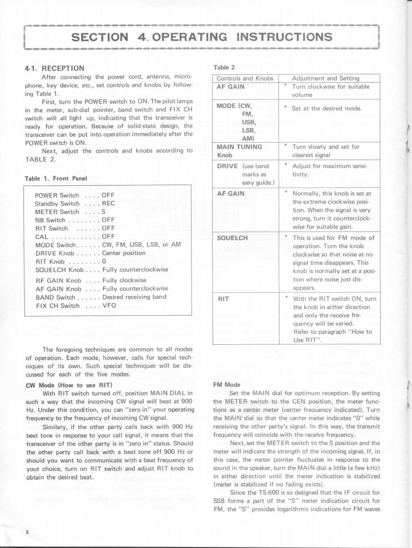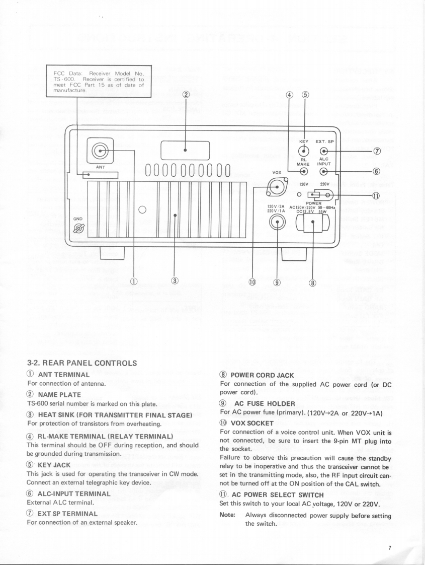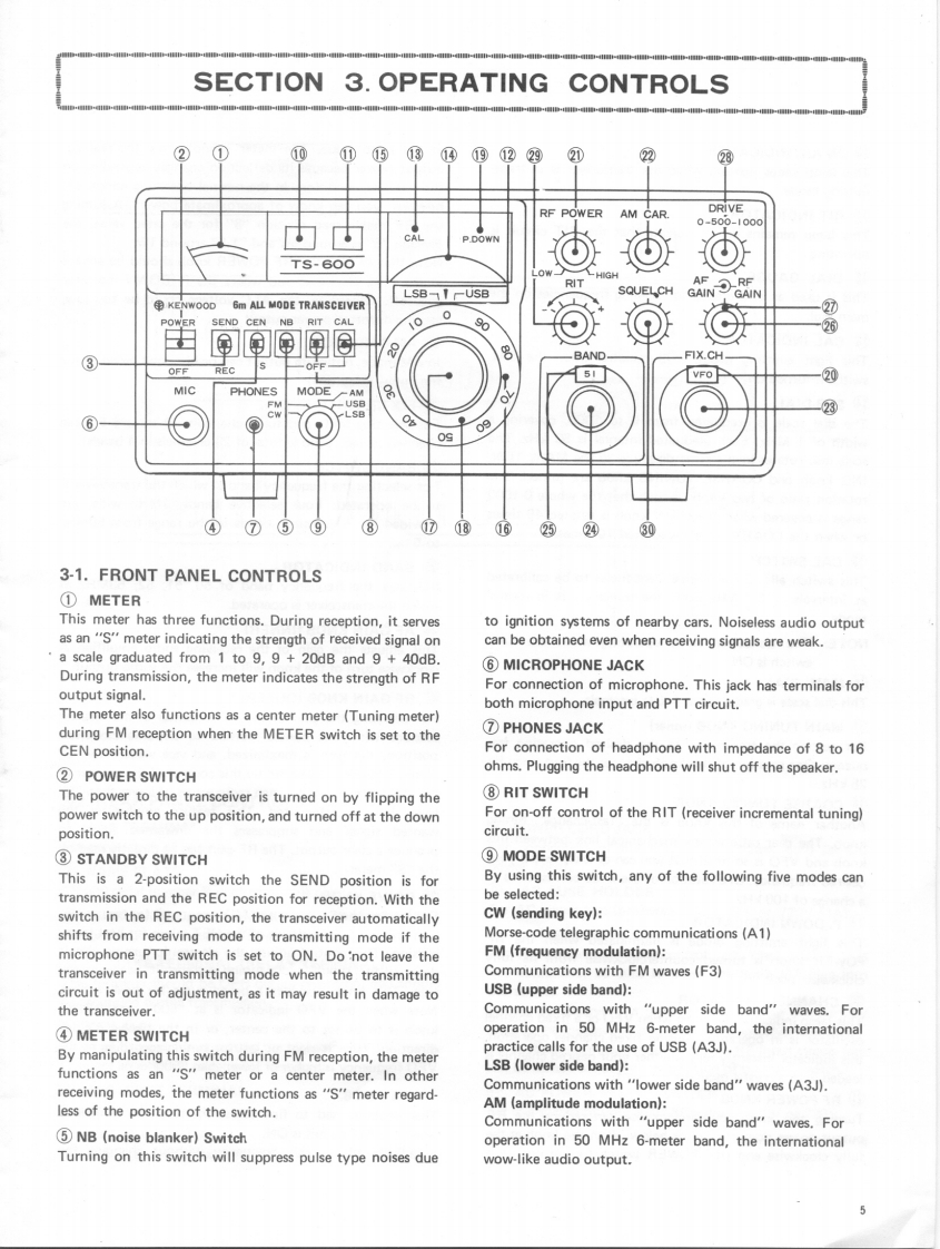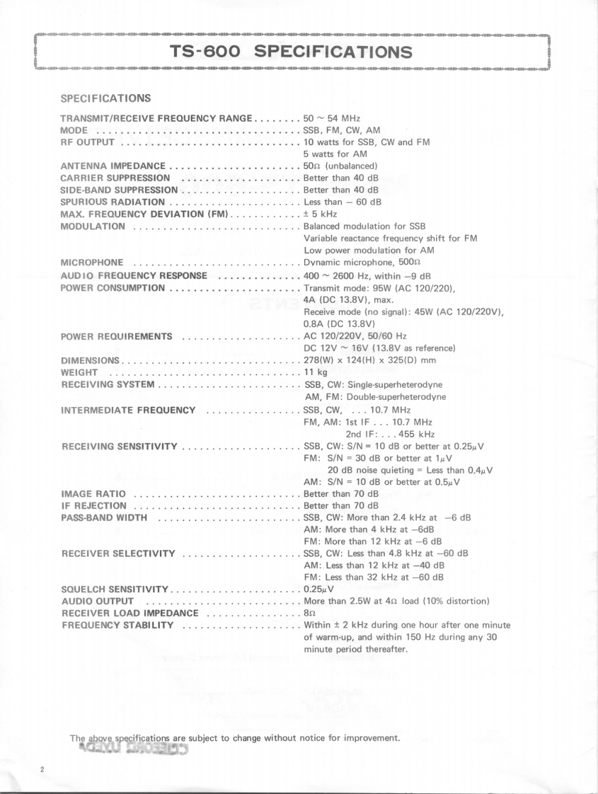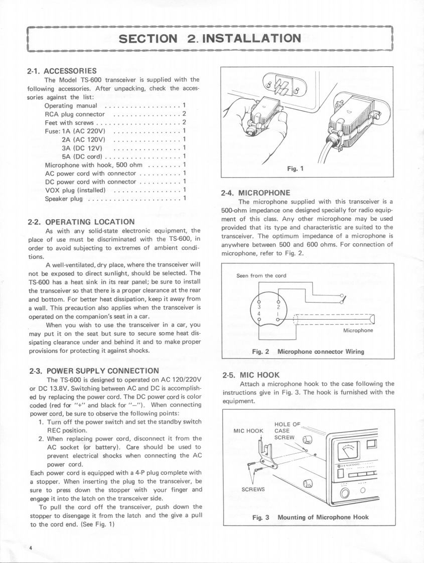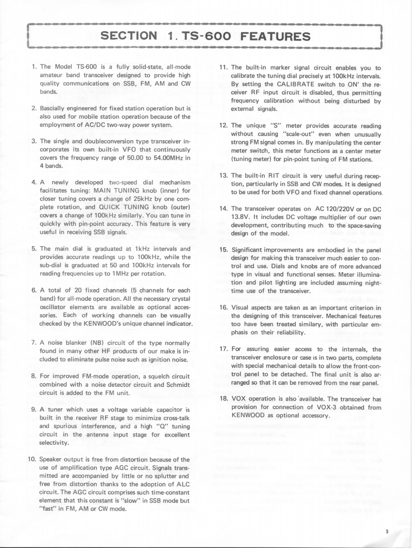 KENWOOD6m ALL MODE TRANSCEIVERModel TS-600OPERATING MANUALCONTENTSSPECIFICATIONSSECTION 1.FEATURES....SECTION 2.INSTALLATION.··2-1.Accessories2-2.Operating Location2-3.Power Supply Connection2-4.Microphone2-5.MIC HookSECTION 3.OPERATING CONTROLS ........................53-1.Front Panel Controls3-2.Rear Panel ControlsSECTION 4.OPERATING INSTRUCTIONS....................84-1.Reception4-2.Transmission4-3.Frequency Calibration44.Reading the Frequencies4-5.Operating with Fixed Channels4-6.How to Use RIT4-7.Mobile Operation with External DC Power SupplySECTION 5.ALIGNMENT.................................14TS-600 SCHEMATIC DIAGRAM.15BLOCK DIAGRAM.............................161