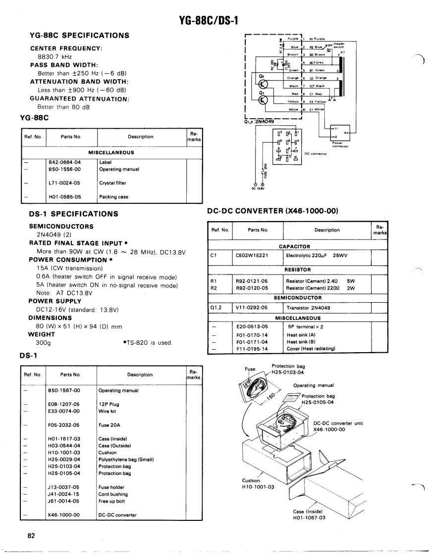 DS-1ADC-DC CONVERTER (OPTION)PurpleR1 PurpleR2 Blue90 FF Heat棉7switchDS-1ABlue2PTBrown3B2 BrownBCT GreyGreenB1 GreenplateQ2Orange6C2 OrangeBlackCCT Black01RedC1 RedYellowE2 YellowWhite0E1 White0,2T20A6Yellow的o12RedBlackFinal enclosureconnectorOrangeGreenBrownBluenSalboandPower transformerc138VSPECIFICATIONS1.SemiconductorsT20A6(2)2.Rated final stage inputMore than 90W at CW(1.8~28 MHz),DC13.8V3.Power consumption15A (CW transmission)0.6A (heater switch OFF insignal receive mode)5A (heater switch ON in no-signal receive mode】Note:At DC13.8V4.Power supplyDC12-16V (standard:13.8V)80(W)x39(H)x94(D)mm5.Dimensions6.Weight300g52