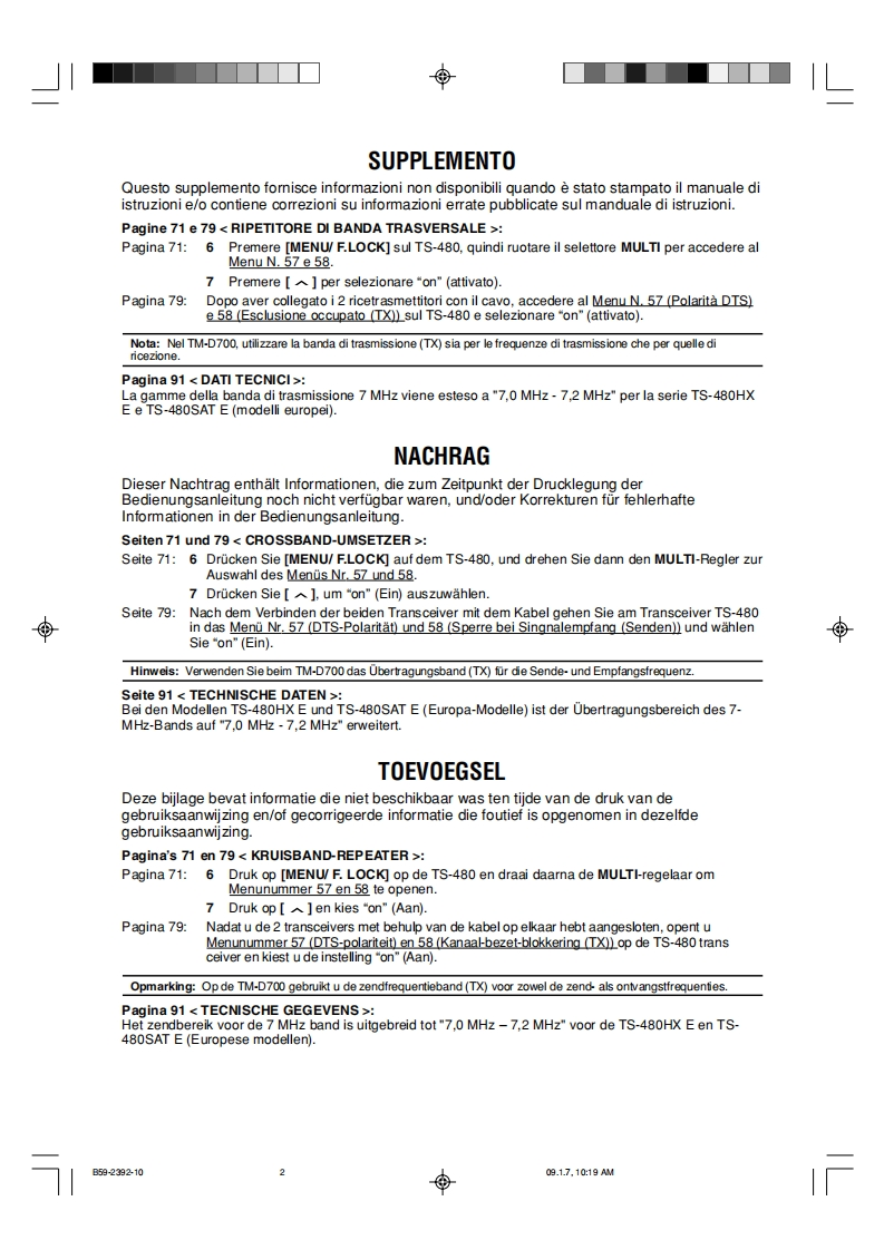 威ADDENDUMThis supplement provides information not available at the time the instruction manual wasprinted and/or corrects erroneous information appearing in the instruction manual.Pages 71 and 79:Pege 71:6 Press [MENU/F.LOCK]on the TS-480,then turn MULTI control to access Menu Nos.57and 58.7 Press [to select "on".Pege 79:After connecting the 2 transceivers with the cable,access Menu No.57 (DTS polarity)and 58(Busy lockout)on the TS-480 transceiver and select "on".Note:On the TM-D700,use the transmission(TX)band for both the transmission and reception frequencies.Page 91:The 7 MHz band transmission range is expanded to"7.0 MHz-7.2 MHz"for the TS-480HX E and TS-480SAT E (European models).SUPPLEMENTCe supplement contient des informations qui n'etaient pas disponibles au moment deI'impression du mode d'emploi et/ou corrige des informations erronees contenues dans ce moded'emploi.Pages 71 et 79:Pege 71:6 Appuyez sur [MENU/F.LOCK]sur le TS-480 et tournez la commande MULTI pour accederau numero 57 et 58 du menu.7 Appuyez sur []pour selectionner"on"(activee).Pege 79:Apres avoir connecte les 2 emetteurs-recepteurs au moyen du cable,accedez au numero 57(Polarite DTS)et 58_(Blocage sioccupe (TX))du menu sur le TS-480 pour selectionner "on"®(active).Remarque:Sur le TM-D700,utilisez la bande de transmission (TX)pour les frequences de transmission et dereception.Page 91 FICHE TECHNIQUE >La plage de transmission de la bande 7 MHz est etendue a"7.0 MHz-7,2 MHz"pour le TS-480HX E etTS-480SAT E(modeles europeens).SUPLEMENTOEste suplemento contiene informacion no disponible en la fecha que se imprimio el manual deinstrucciones y/o corrige informacion erronea que aparecia en dicho manual.Pginas 71 y 79:Pagina 71:6 Pulse [MENU/F.LOCK]en el TS-480,luego gire el control MULTI para acceder el Menu_N57y_58.7 Pulse[入]para seleccionar“on"(activado).Pagina 79:Luego de conectar los 2 transceptores con el cable,acceda al Menu Ne57 (Polaridad DTS)y_58(Bloqueode ocupade (TX))en el transceptor TS-480 y seleccione "on"(activado).Nota:En el TM-D700,utilice la banda de transmision (TX)tanto para las frecuencias de transmision como de recepcion.Pgina 91 ESPECIFICACIONES >La gama de transmision de la banda de 7 MHz se amplia a"7.0 MHz-7,2 MHz"para los TS-480HX Ey TS-480SAT E(modelos europeos).B59-2392.10B5923921009.1.7,10:19AM