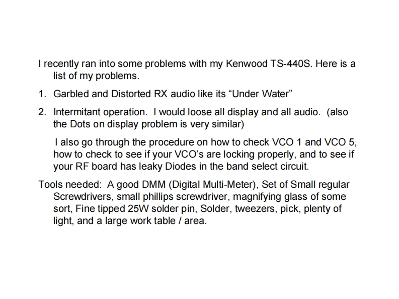TS440S Repair FAQI take no responsibility for any damage you cause to your TS-440S.I assume you haveexcellent soldering skills and a good DMM.This is just a report on how I fixed my TS-440with info directly from the Yahoo Group KENWOOD TS-440S.I am not a expert nor acertified Electrician.Just a average Ham like you who likes to leam.I take no credit for thesolutions.All credit goes to Bill Leahy "coorsbill"from Denver Colorado who answered allmy questions about this radio.Thanks Bill!Good Luck and I hope this file helps at least one person.10-29-02 by Mike Freeman KC8QNOFeel free to email me about this file or its contents.If there are errors,please let me know and I will fix them when I can.