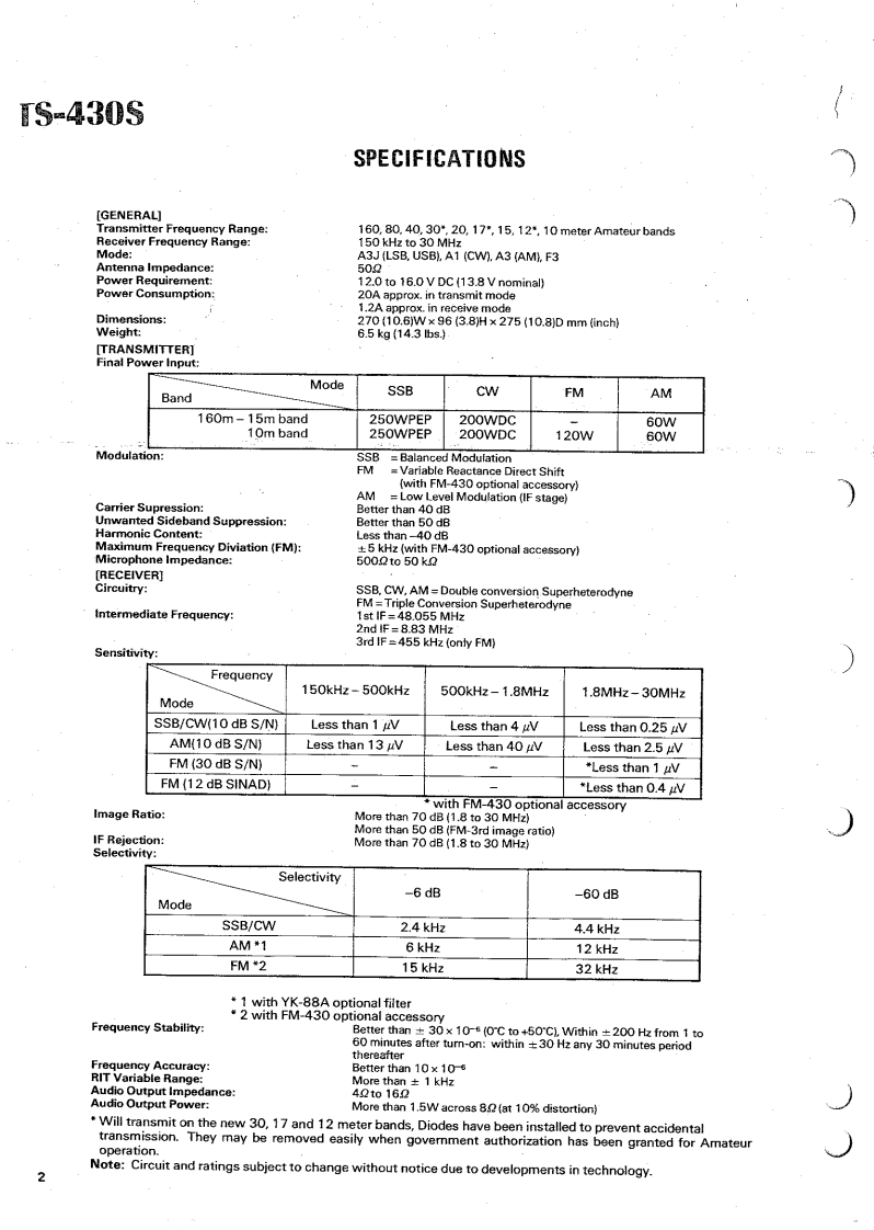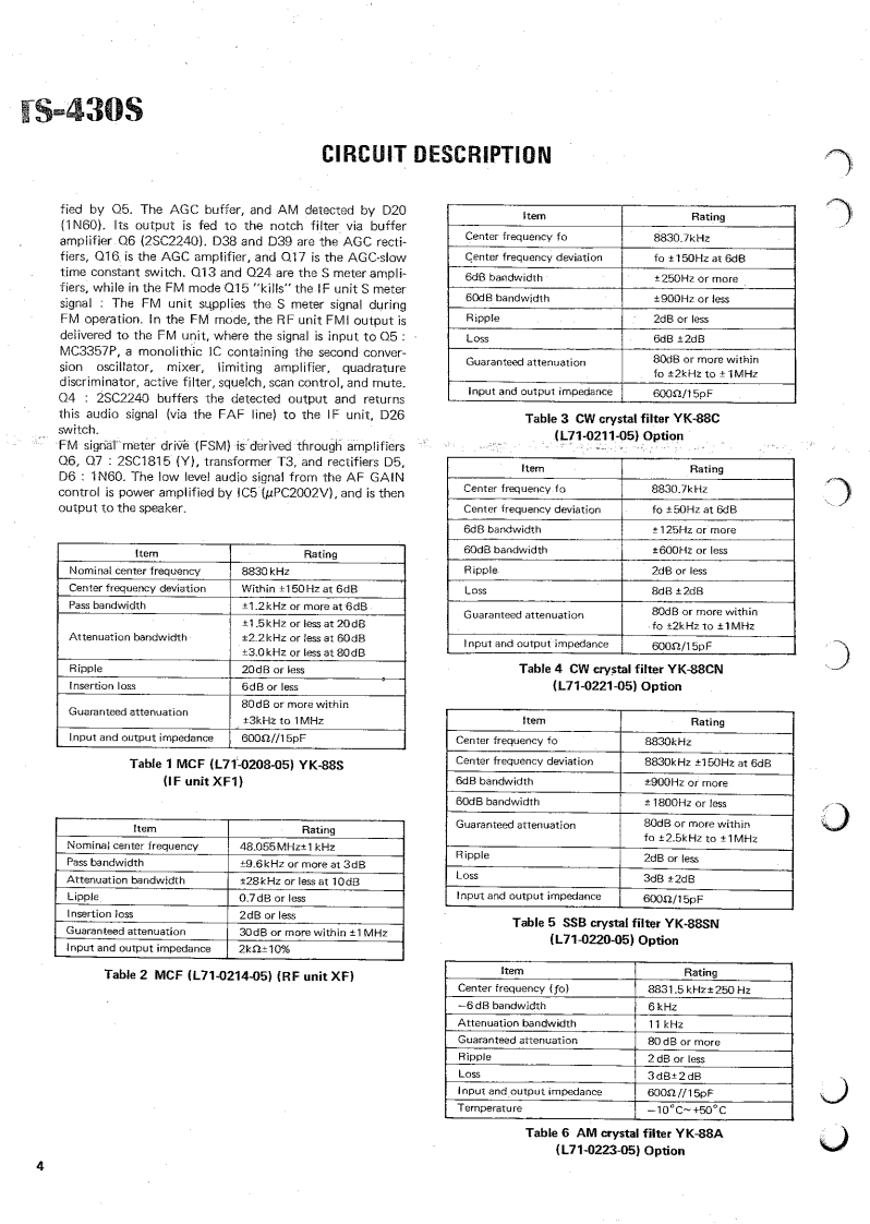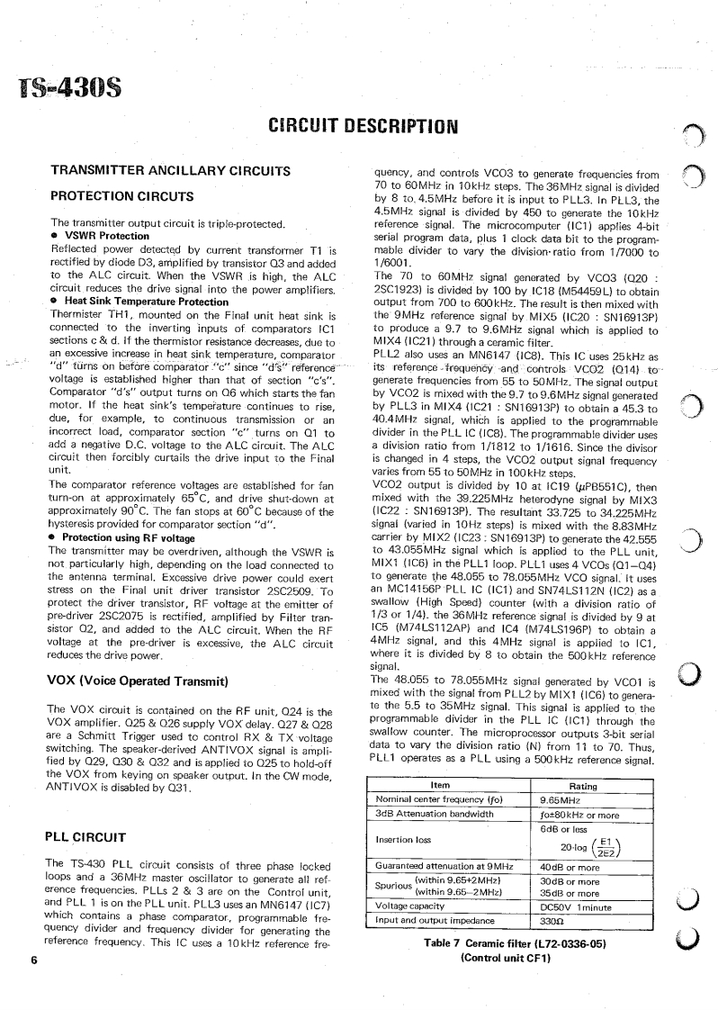 KENWOODTS-430SFM-430,M08-430,SP-430,PS-430HF TRANSCEIVERCONTENTSSPECIFICATIONCONTROL UNIT (X53-1290-00)·32,33CIRCUIT DESCRIPTION.3100W FINAL UNIT (X45-1280-00)34SEMICONDUCTOR DATA...................9100W FILTER UNIT (X51-1290-00134PARTS LIST.,·:·,·····16DISASSEMBLY35PC BOARD VIEWS/CIRCUIT DIAGRAMSPACKING.·38SWITCH UNIT (X41-1470-00)24ADJUSTMENT3RELAY BOARD.,..,..........25LEVEL DIAGRAM.·····…··5ENCODER ASSY (J25-3141-04)25BLOCK DIAGRAM51DISPLAY UNIT (X54-1710-00)25FM-43052RE UNIT(X44-1510-11)....····26.27PS-430541FUN1T{X48-1370-00)28,29MB-430BACK COVERPLL UNIT{X50-1910-00)··30.31SP.430BACK COVERn纳