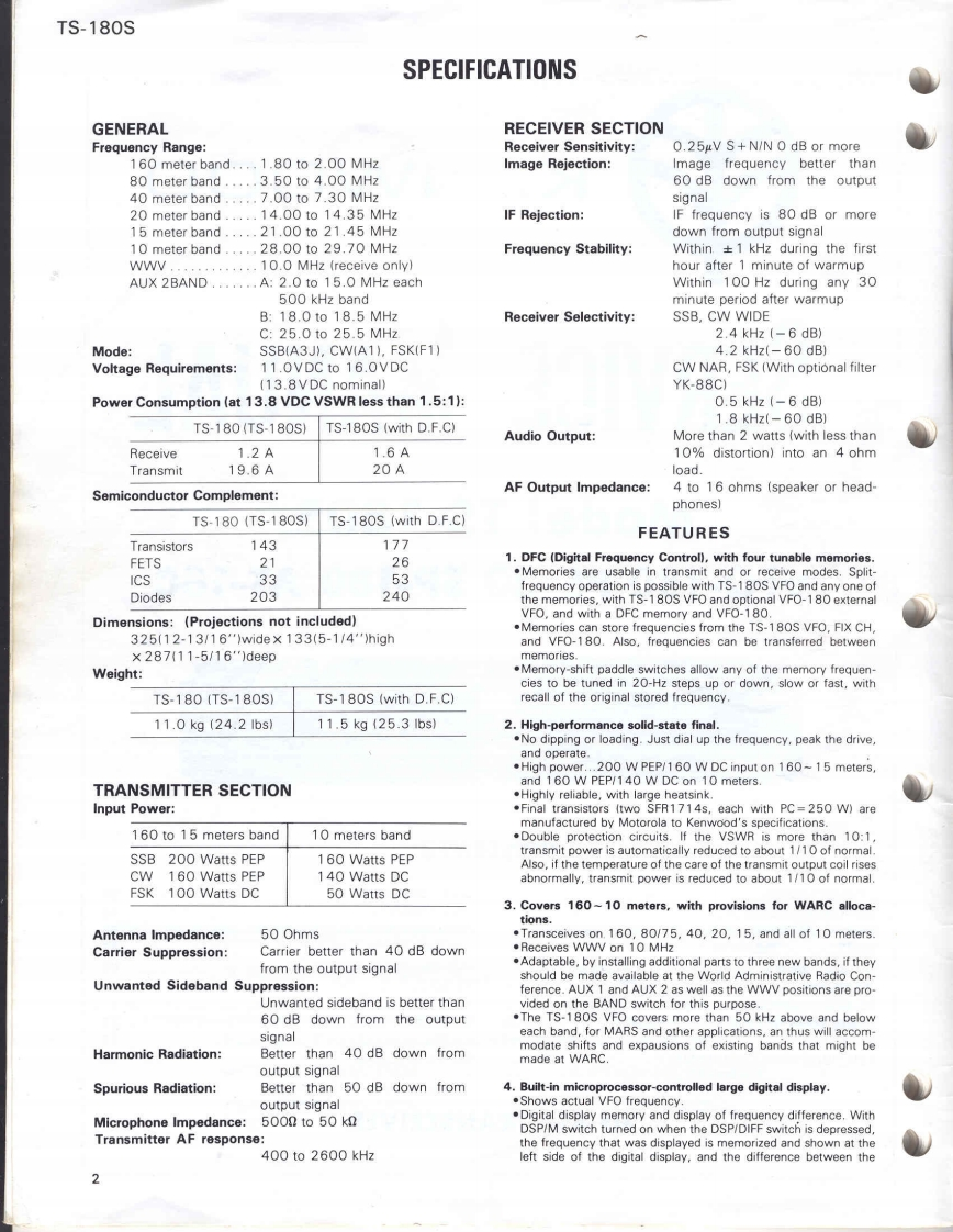 KENWOODSERVICE MANUALModel TS-180SVFO-180PS-30SP-180AT-180CONTENTSSPECIFICATIONS1LEVEL DIAGRAM…2FEATURES..............................................2ADJUSTMENTS.........CIRCUIT DESCRIPTION3WIRE HARNESS65SEMICONDUCTOR DATA13Vf0-180 PARTS LIST…67OUTSIDE VIEWS17VFO-180 SCHEMATIC.........69INSIDE VIEWS.....18PS-30…70PC BOARD/CIRCUIT DIAGRAM......................19PS-30/SP-180 PARTS LIST71PARTS LIST...................38SCHEMATIC DIAGRAM.....72PACKING..5AT-18073EXPLODED VIEW/DISASSEMBLY....51BLOCK DIAGRAM...75HF SSB TRANSCEIVER心9A