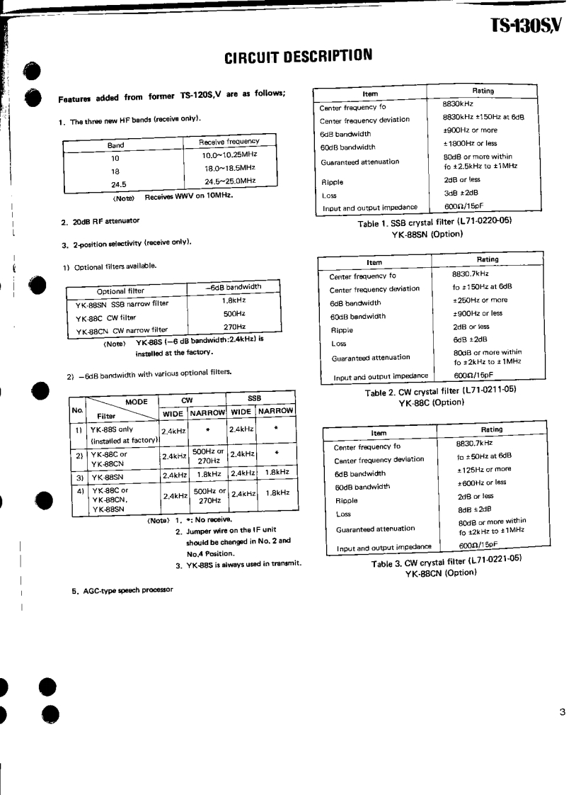 KENWOODSERVICE MANUALTS-130S,V/VF0-120/AT-130HF SSB TRANSCEIVERr2888TS-130 SVF0-120AT.130CONTENTSSPECIFICATIONSAF.GEN UNIT(X49-1110-01........16CIRCUITDESCRIPTION......................3FILTER UNIT (X51-1240-00)S TYPE.........17SPECIAL COMPONENTS DATA..·..·....6FILTER UNIT (X51-1250-00)V TYPE.........17OUTSIDEVIEW (STYPE)....................7FINAL UNIT (X56-1300-00)VTYPE..........18PC BOARDS/CIRCUIT DIAGRAMSFINAL UNIT((X56-135000)S TYPE.·..181fUN1T(X48-1300-00,-01)........8.9PARTSLIST.............................1PR0CESS0RUN1T(X54-1550-001.........8PACKING .............................28PLL UNIT(X50-1700-00).........10,11DISASSEMBLY.........................C0 UNTER UNIT(X541560-00)......12,13LEVELDIAGRAM.........................31RF UNIT(X44-1380-001..........14ADJUSTMENTS...........................32VF0UNT(×40-1170-00).........15AT-130....241CAR UNIT(X50-1500-00)...........15SCHEMATIC DIAGRAM V TYPE...............42RELAY UNIT(X41-130000).......16VF0-120.3SWITCH(A)UNIT(X41-1310-00)......16SCHEMATIC DIAGRAM S TYPE:,····6SW1TCH(B)UN1T(X41-1320-00).......16BLOCK DIAGRAM...····.···BACK COVERA product ofTRIO-KENWOOD CORPORATION6-17.3-chome.Aobadai.Meguro-ku.Tokyo 153.JapanTRIO-KENWOOD COMMUNICATIONS,INC.1111.West Walnut Street.ComptonCalifornia.90220.U.S.ATRIO-KENWOOD COMMUNICATIONS,GmbHD-6374 Steinbach TS.Industriestrasse 8A.West GermanyTRIO-KENWOOD(AUSTRALIA)PTY.LTD.30 Whiting Street.Artarmon.Sydney N.S.W.Australia 2064