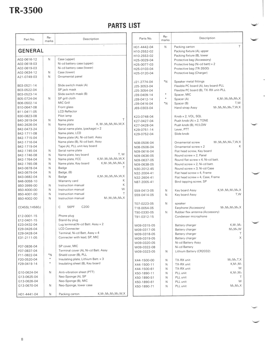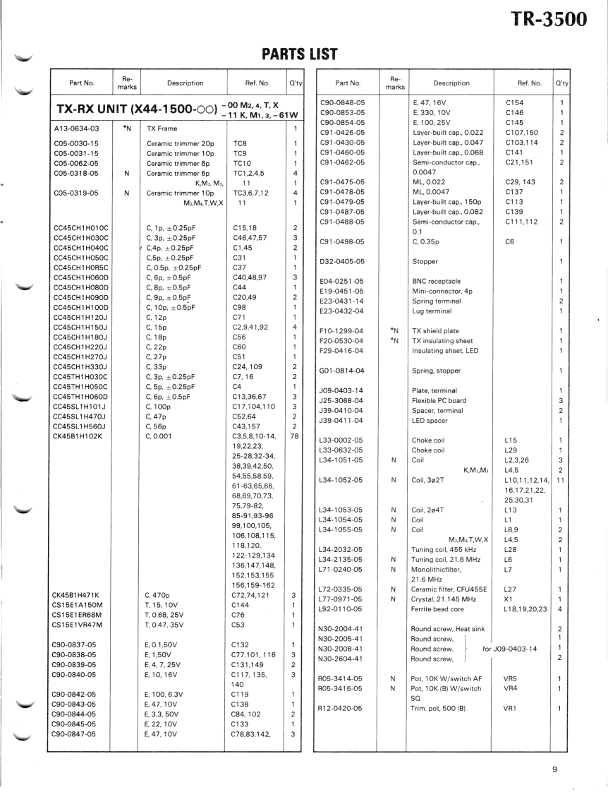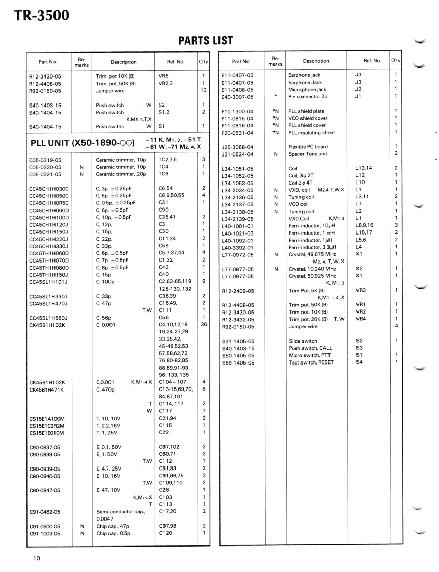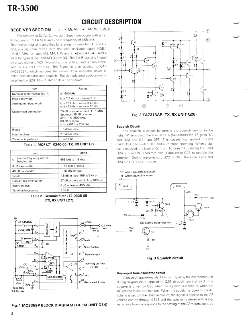 KENWOODSERVICE MANUALTR-3500BT-1,MS-1,PB-25,SC-4,ST-2SMC-25,TU-35A/TU-35B,TU-170 CM FM SYNTHESIZED HAND-HELD TRANSCEIVERSPECIFICATIONS[GENERAL]Weight.With Ni-Cd battery:540 g(1.2 lbs.)Frequency Range.......440.000-449.995 MHz (K M1.M3)With manganese battery:530 g(1.2 Ibs.)430.000-439.995MHz[TRANSMITTER](M2.M4.T.W.X)RF Output Power.......HI.1.5 WFrequency Step..........5 kHzLOW=0.3 W approxMemory Channels....10 CHModulation.VariablereactancedrectshifMode.EM(F3)Frequency Tolerance.Less than±20×10Operating voltage.....8.4VDC±25%(-10C+50CPower Requirement..8.4 V.400 mAH [Ni-Cd battery pack)Ma×imum F0 quencyPOWER/VOL9V AA manganese or alkaline (not Ni-Cd)6Deviation.±5kHzpcs.(battery case optionallSpurious Radiation....Less than-60 dBBack-up Power Re-[RECEIVER]quirement...CR2032 Lithium battery (supplied)444Double conversion superheterodyneCurrent Drain.Approx 35 mA in receive mode with no in-Intermediate Fre-put signalquency..1st IF =21.6 MHzApprox 700 mA in Hl transmit mode (at2nd IF =455 kHz8.40Sensitivity.Better than 1uV for S/N 30 dBApprox.350 mA in Low transmit mode (atLess than 0.25uV for 12 dB SINAD8.4MPass-Band Width.......12 kHz (More than-6 dB)Approx 1A for memory back-upSelectivity.44424 kHz (Better than-45 dB)Grounding.NegativeSpurious月0 sponse..:Better than 50dBOperating Tempera-Squelch Sensitivity...Less than 0.25 uV(threshold)ture.....-20Cto+50CAudio Output Power..More than 400mW(at 10%distorAntenna Impedance..50tion and 8 load)MicrocomputerICs6Transistors49KM0.5251(W)Note:Circuit and ratings may change without notice due to deve-Diodes45K.MX1.43Tlopments in technology41/W)LCDLEDDimensionsWith Ni-Cd battery:66 (2.6)Wx 168SC-4:Except USA market6.7H×40(1.6)D mm (inch)TU-1:Available onty for USAWith manganese battery:66(2.6)W×176(7.0H×40(1.6)D mm(inchCONTENTSCIRCUIT DESCRIPTION224PARTSLIST..........ST-2aaa25DISASSEMBLY.a…27TR-35DOSMC-25.4PACKING......13BT-1,PB-25,SC-4..PC BOARD VIEWSTU-35A.TU-35B...29TX.RX UNIT (X44-1500-014LEVEL DIAGRAM...PLL UNIT(X50-1890-00).............16REFERENCE DATA.32ADJUSTMENT.20BLOCK DIAGRAM..33MS-23SCHEMATIC DIAGRAM (K M)........................34SCHEMATIC DIAGRAM (W,T)................35