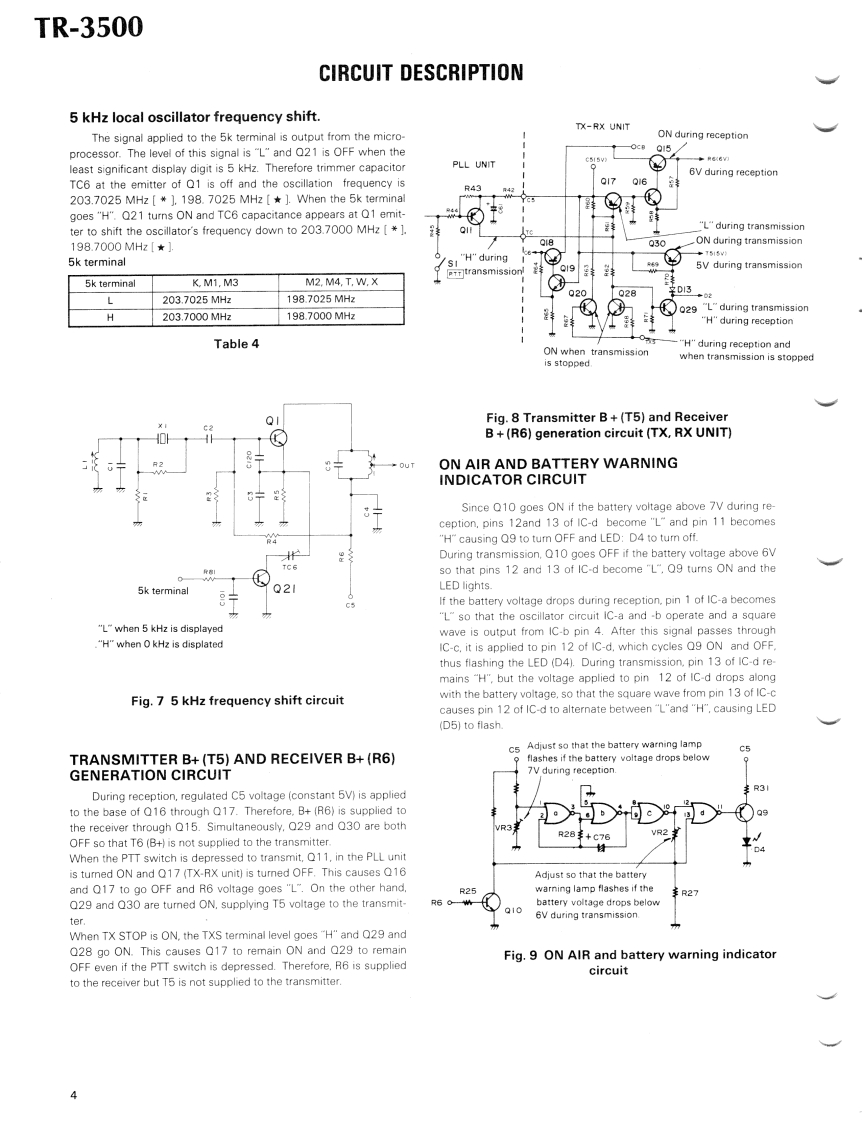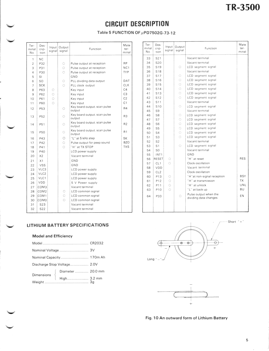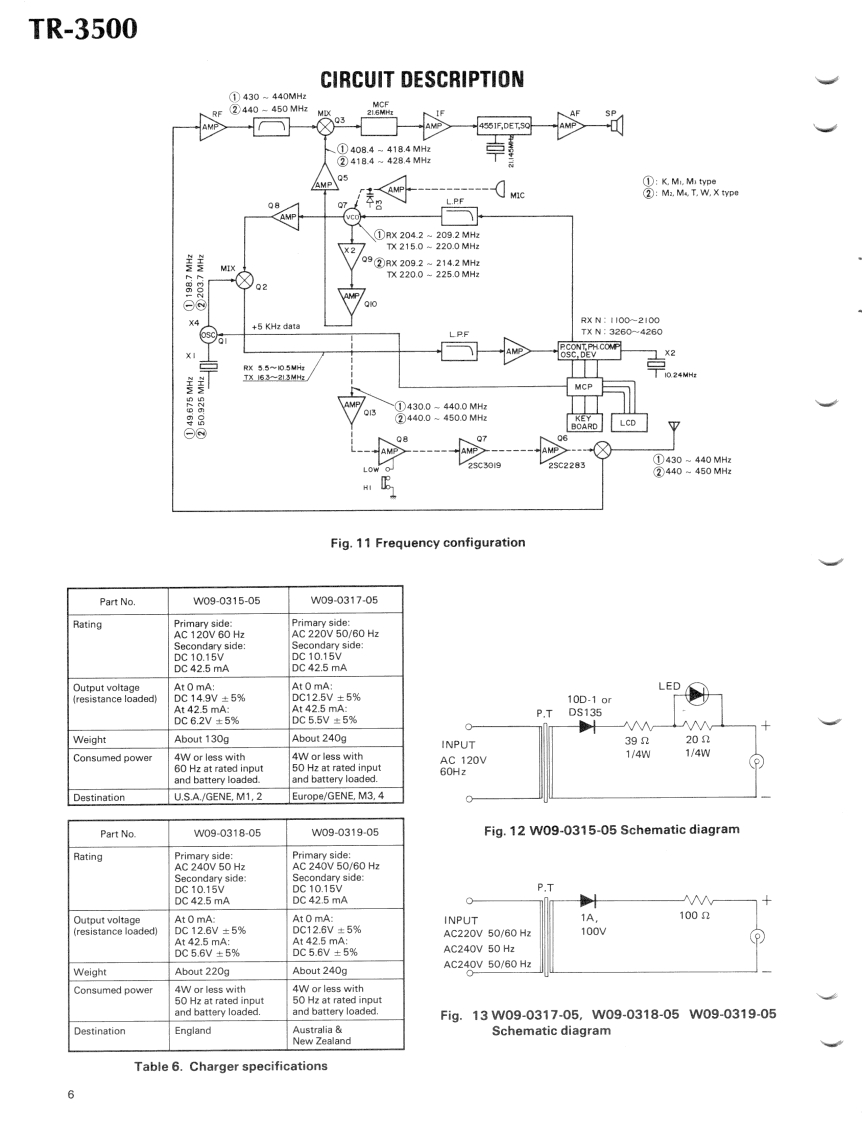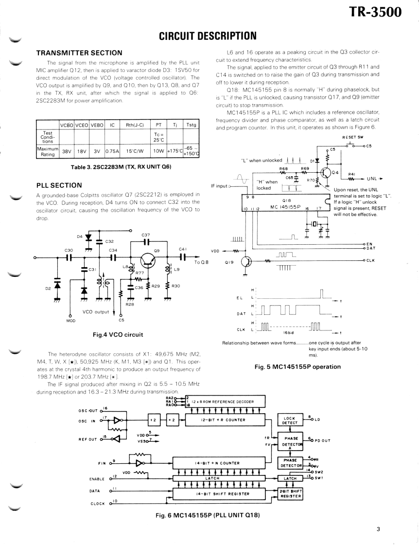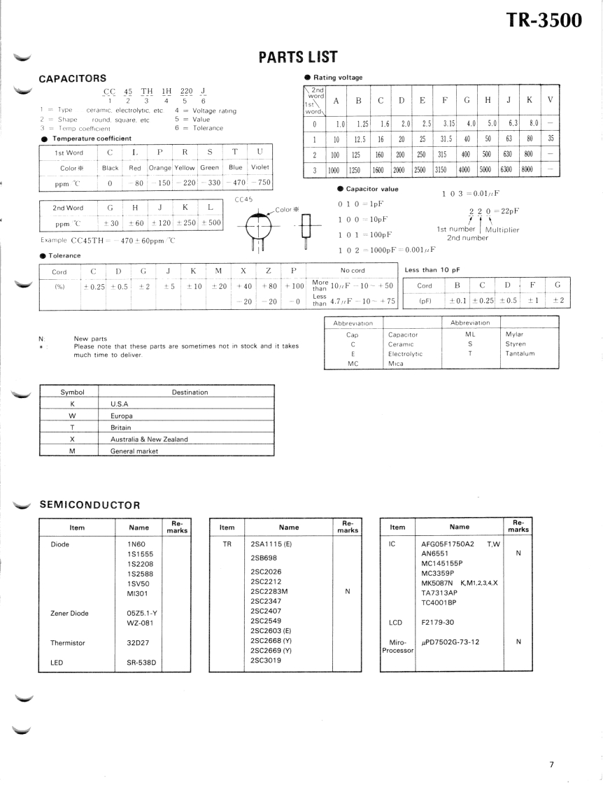 KENWOODSERVICE MANUALTR-3500BT-1,MS-1,PB-25,SC-4,ST-2SMC-25,TU-35A/TU-35B,TU-170 CM FM SYNTHESIZED HAND-HELD TRANSCEIVERSPECIFICATIONS[GENERAL]Weight.With Ni-Cd battery:540 g(1.2 lbs.)Frequency Range.......440.000-449.995 MHz (K M1.M3)With manganese battery:530 g(1.2 Ibs.)430.000-439.995MHz[TRANSMITTER](M2.M4.T.W.X)RF Output Power.......HI.1.5 WFrequency Step..........5 kHzLOW=0.3 W approxMemory Channels....10 CHModulation.VariablereactancedrectshifMode.EM(F3)Frequency Tolerance.Less than±20×10Operating voltage.....8.4VDC±25%(-10C+50CPower Requirement..8.4 V.400 mAH [Ni-Cd battery pack)Ma×imum F0 quencyPOWER/VOL9V AA manganese or alkaline (not Ni-Cd)6Deviation.±5kHzpcs.(battery case optionallSpurious Radiation....Less than-60 dBBack-up Power Re-[RECEIVER]quirement...CR2032 Lithium battery (supplied)444Double conversion superheterodyneCurrent Drain.Approx 35 mA in receive mode with no in-Intermediate Fre-put signalquency..1st IF =21.6 MHzApprox 700 mA in Hl transmit mode (at2nd IF =455 kHz8.40Sensitivity.Better than 1uV for S/N 30 dBApprox.350 mA in Low transmit mode (atLess than 0.25uV for 12 dB SINAD8.4MPass-Band Width.......12 kHz (More than-6 dB)Approx 1A for memory back-upSelectivity.44424 kHz (Better than-45 dB)Grounding.NegativeSpurious月0 sponse..:Better than 50dBOperating Tempera-Squelch Sensitivity...Less than 0.25 uV(threshold)ture.....-20Cto+50CAudio Output Power..More than 400mW(at 10%distorAntenna Impedance..50tion and 8 load)MicrocomputerICs6Transistors49KM0.5251(W)Note:Circuit and ratings may change without notice due to deve-Diodes45K.MX1.43Tlopments in technology41/W)LCDLEDDimensionsWith Ni-Cd battery:66 (2.6)Wx 168SC-4:Except USA market6.7H×40(1.6)D mm (inch)TU-1:Available onty for USAWith manganese battery:66(2.6)W×176(7.0H×40(1.6)D mm(inchCONTENTSCIRCUIT DESCRIPTION224PARTSLIST..........ST-2aaa25DISASSEMBLY.a…27TR-35DOSMC-25.4PACKING......13BT-1,PB-25,SC-4..PC BOARD VIEWSTU-35A.TU-35B...29TX.RX UNIT (X44-1500-014LEVEL DIAGRAM...PLL UNIT(X50-1890-00).............16REFERENCE DATA.32ADJUSTMENT.20BLOCK DIAGRAM..33MS-23SCHEMATIC DIAGRAM (K M)........................34SCHEMATIC DIAGRAM (W,T)................35