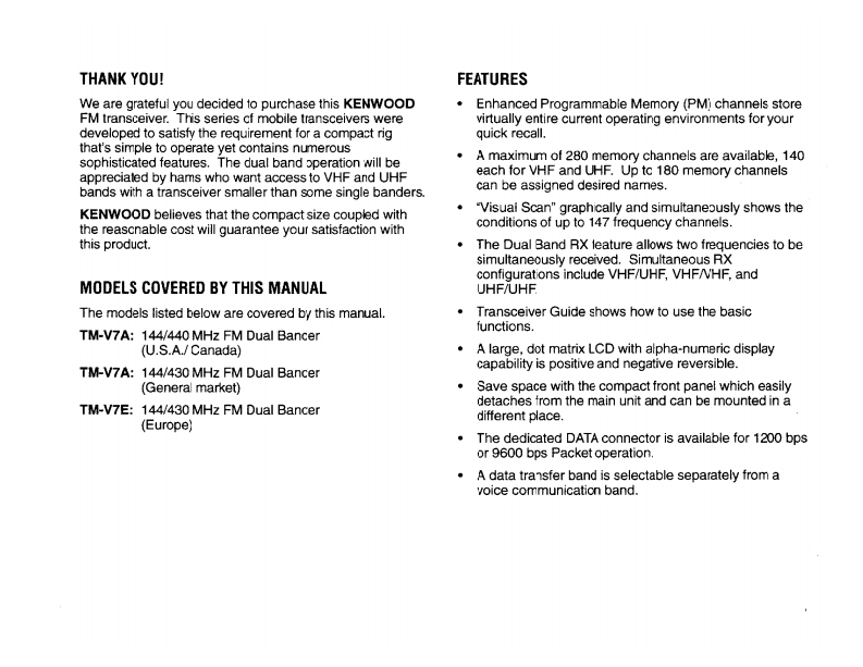TM-V7E_使用说明书手册找手册网30天前发布关注私信4.87MB100页022TM-V7E_使用说明书手册此内容为付费资源,请付费后查看¥19¥21黄金会员免费钻石会员免费登录购买付费资源 第1页 / 共100页 第2页 / 共100页 第3页 / 共100页 第4页 / 共100页 第5页 / 共100页 第6页 / 共100页 第7页 / 共100页 第8页 / 共100页 第9页 / 共100页 第10页 / 共100页 试读已结束,还剩90页,您可下载完整版后进行离线阅读 THE END建武 文本预览 144/440 MHz FM DUAL BANDERTM-V7A144/430 MHz FM DUAL BANDERKENWOODTM-V7A144/430 MHz FM DUAL BANDERTM-V7EINSTRUCTION MANUALKENWOOD CORPORATION@B62-0678-00K,E,M009080706050403020100 查看更多 收起部分 喜欢就支持一下吧收藏