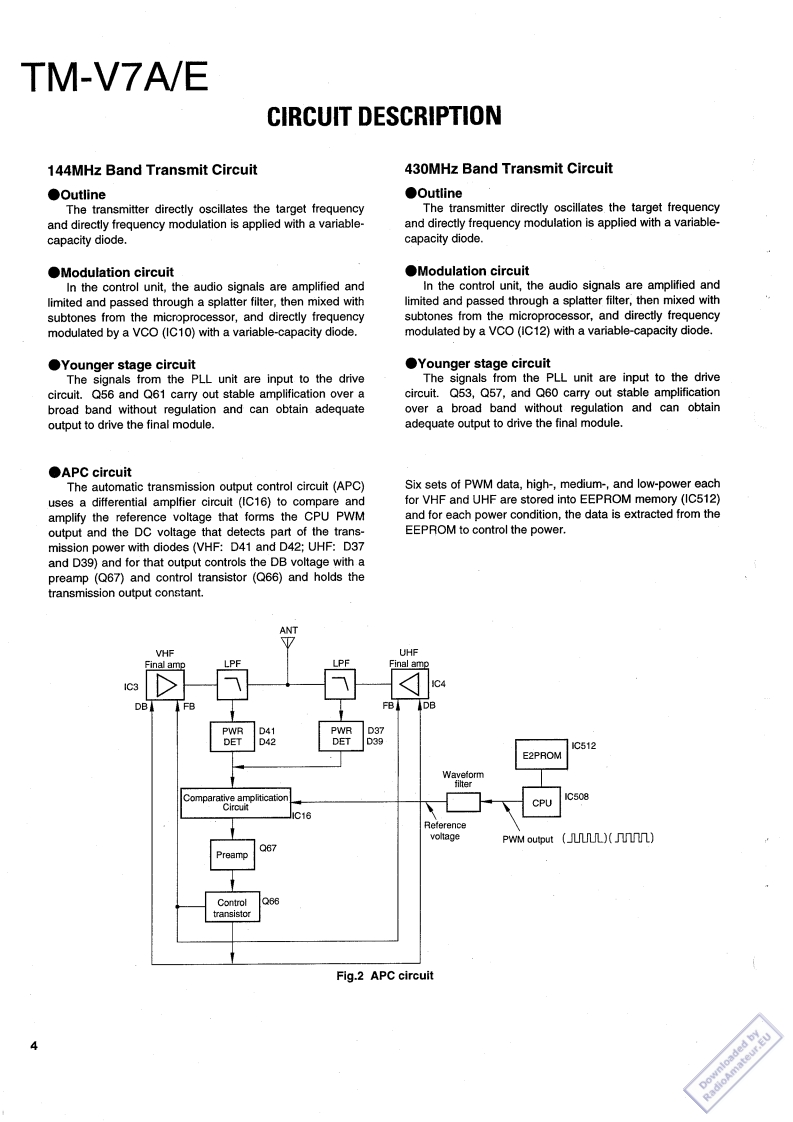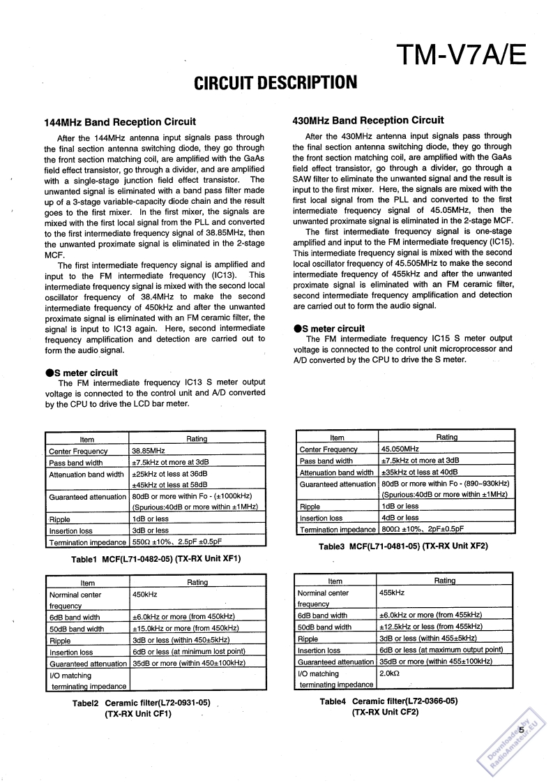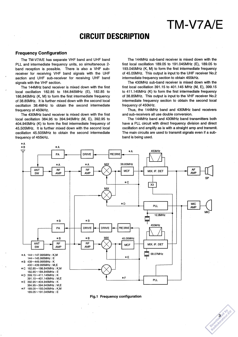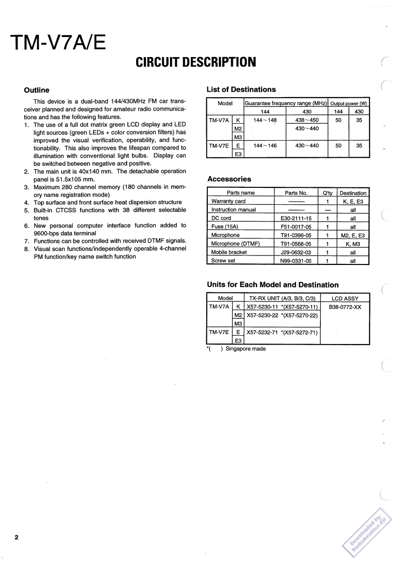 144/430MHz FM DUAL BANDERKENWOODTM-V7A/ESERVICE MANUAL1996-11 PRINTED IN JAPANB51-8348-00(B)1100Microphone assy(T91-0568-05):K,M3Metallic cabinet(Upper)(A01-2122-13)Knob(PM)(K27-3168-23)KENWOOD FM DUAL TM-VKnob(MNU)Knob (VFO)_(K27-3169-33)(K27-3166-23)Knob (MR)(K27-3167-23)46970448525Cover (DIN 6P)(f07-1428-23)Sub panelKnob(MAIN)Panel assyKnob (VOL)Knob (SQL)(A22-0798-11)(K29-5133-03)(A62-0492-33)(0K29-5134-03)(K29-5135-03)Button knob (MAIN,PUSH)(K273172-03)Photo is K TypeCONTENTSCIRCUIT DESCRIPTION..2PC BOARD VIEWSEMICONDUCTOR DATA.........19LCD ASSY(B38-0772-15)…52DESCRIPTION OF COMPONENTS...........23TX-RX UNIT (X57-52XX-XX)(A/3)..........53TERMINAL FUNCTION.26TX-RX UNIT (X57-52XX-XX)(B/3)..........57PARTS LIST…29TX-RX UNIT (X57-52XX-XX)(C/3).........59EXPLODED VIEW..40SCHEMATIC DIAGRAM.....61PACKING…41BLOCK DIAGRAM.69ADJUSTMENT........2WIRING DIAGRAM71LEVEL DIAGRAM…72OPTIONS(DFK-3C/DFK-4C/DFK-7C)........73SPECIFICATIONS.....coverded.EUDo