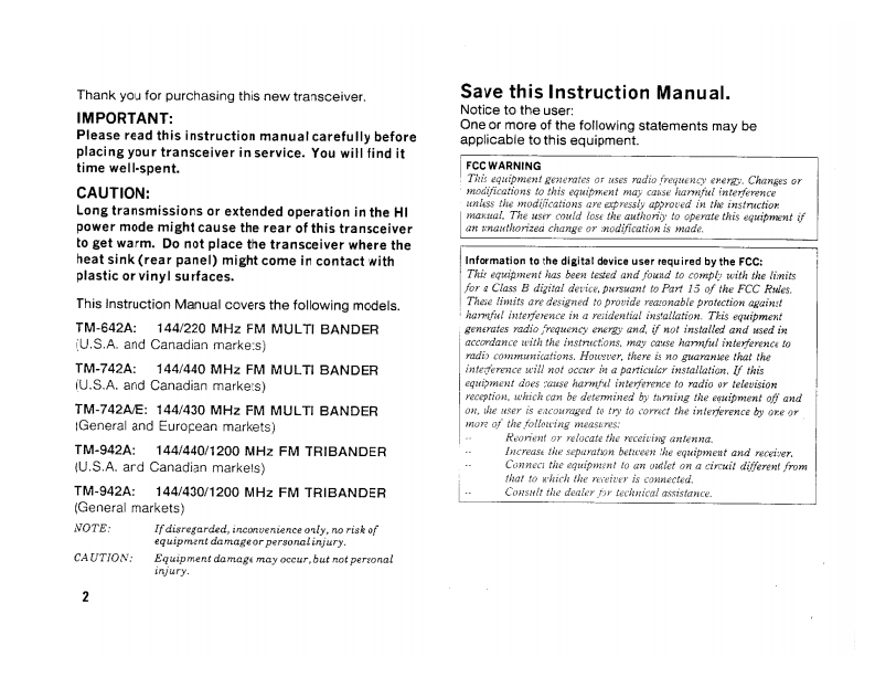 144/440/1200 MHz FM TRIBANDER144/430/1200 NHz FM TRIBANDERTM-942A144/440 MHz FM MULTI BANDERKENWOODTM-742A44/430 MHz FM MULTI BANDERTM-742A/E44/220 MHz FM MULTI BANDERTM-642AINSTRUCTION MANUALKENWOOD CORPORATIONOPRINTED IN JAPAN B62-0287-70(KPMJO)(MC)95/121110987654