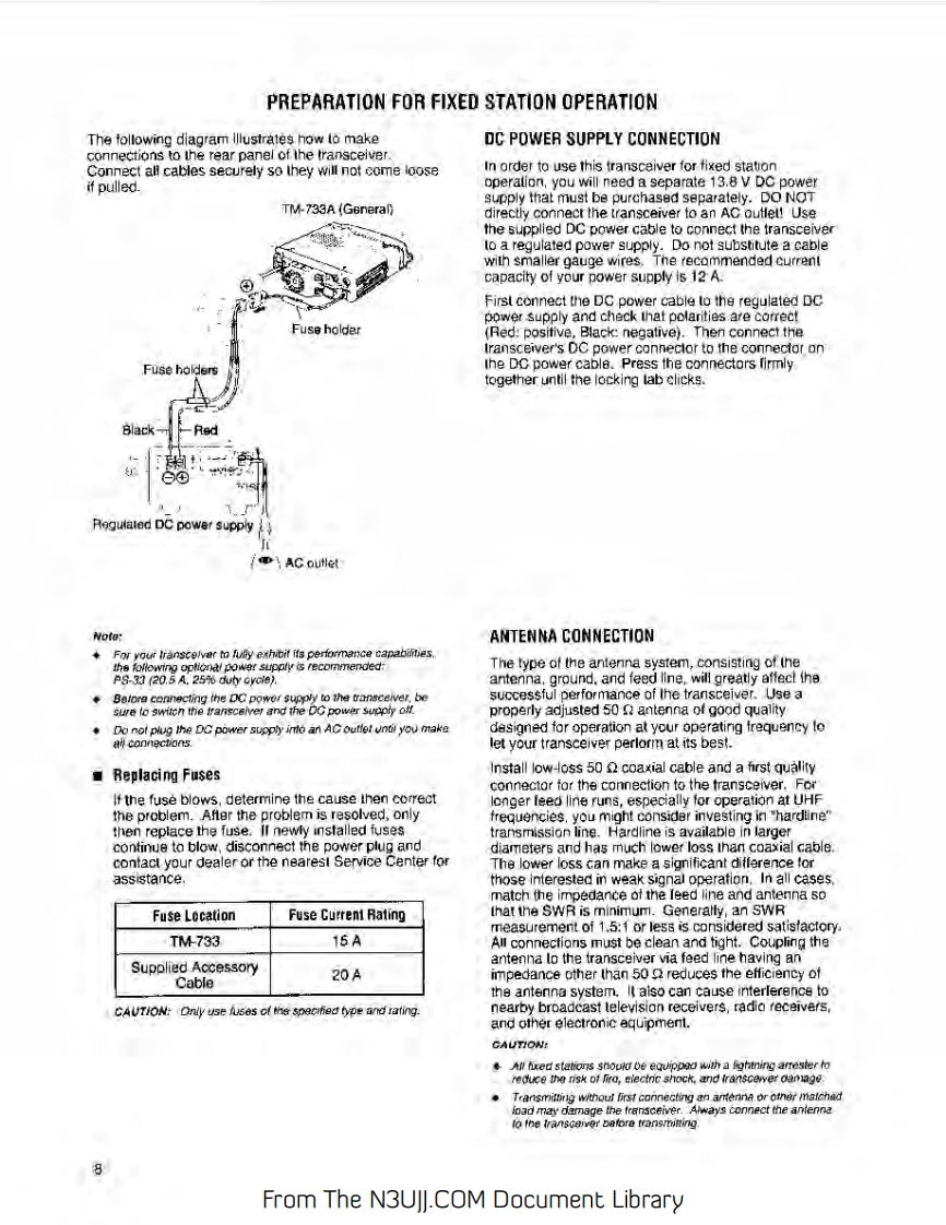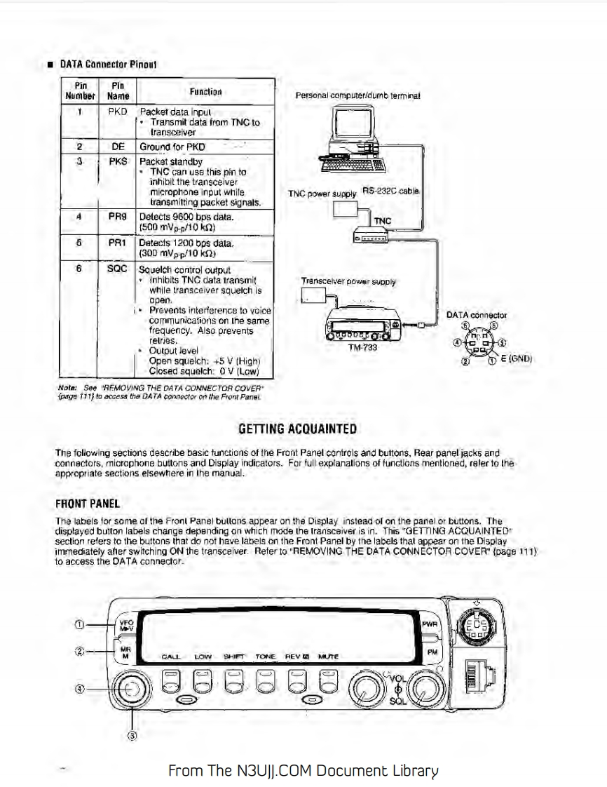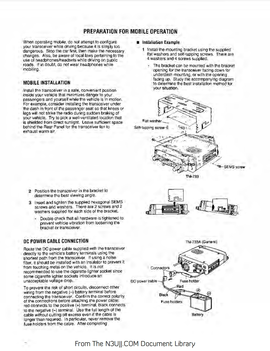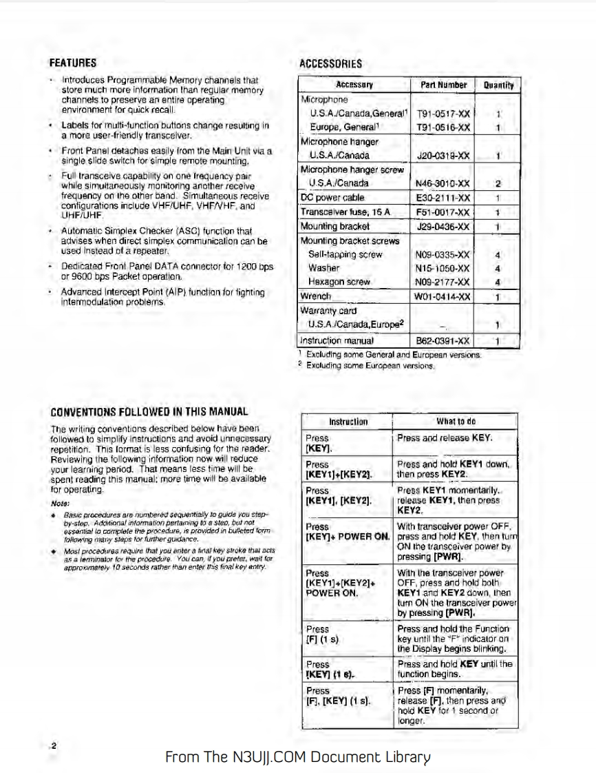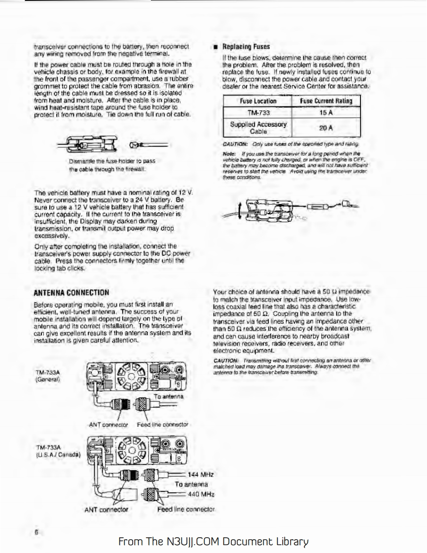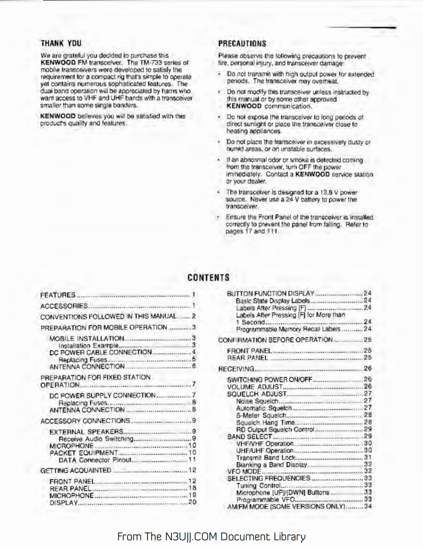 144/440 MHZ FM DUAL BANDERTM-733AKENWOOD144/430 MHz FM DUAL BANDERTM-733A144/430 MHz FM DUAL BANDERTM-733EINSTRUCTION MANUALKENWOOD CORPORATIONCPRINTED IN JAPAN B62-0391-60(K.P.E,M](MC)951211109876543Notice to the user:Models Covered by this ManualOne or more of the following statements may beTM-733A:144/440 MHz FM Dual Banderapplicable to this equipment.(U.S.A./Canada)TM-733E:144/430 MHz FM Dual BanderFCC WARNING(Europe)This equipment generates or uses raoo frequency gnergy.TM-733A:144/430 MHz FM Dual BanderChanges or modficabons to this equipmerd may cause harmtul(General)nterference unless the modfications are expressly approved in iheinstructon manual The user could lose the authority to operete tsequipment if an uneuthorited change or modification is made.Note:Functions requiring te microphone keyped,such as RemoteControl,cannat be used without a keypad-equpped microphone.This type of microphone is optonal for certain transrever versions.INFORMATION TO THE DIGITAL DEVICE USER REQUIRED BYTHE FCCThis equlpment hes beon tested and found to comoly with the lrtsfor a Ciass B digital device,pursuant to Part 15of the FCC Rules.These mits are desipned to provide reasonable protecton agnstharmfu interterancs in a residential instafiation.Ths equpment gensrates,uses and can gonerate radio Fequencyenergy and.话ot installed and used in accordance w价hensrucons,may cause narmful niererence to taocommurcations.However.thers is no guarantee that theequrpment does cause harmful interference to radio or felevisionreception.which can be determined by tuming the aqupment offand on,the user is encouraged to fry lo correct the interference byRgorient or relocate the receiving antenna.Increase the separation between the egupment and rgceiverConnect the aqupment lo an outet on a croul diferent fromthat to whach the recerver is connecied.Consut the deoler for technical assistance.From The N3UJJ.COM Document Library