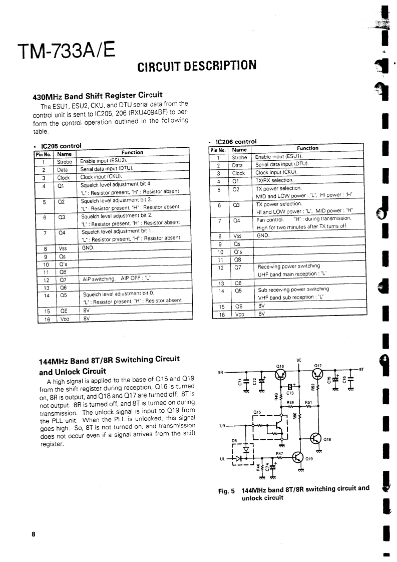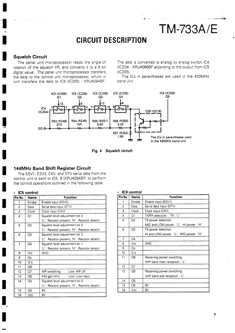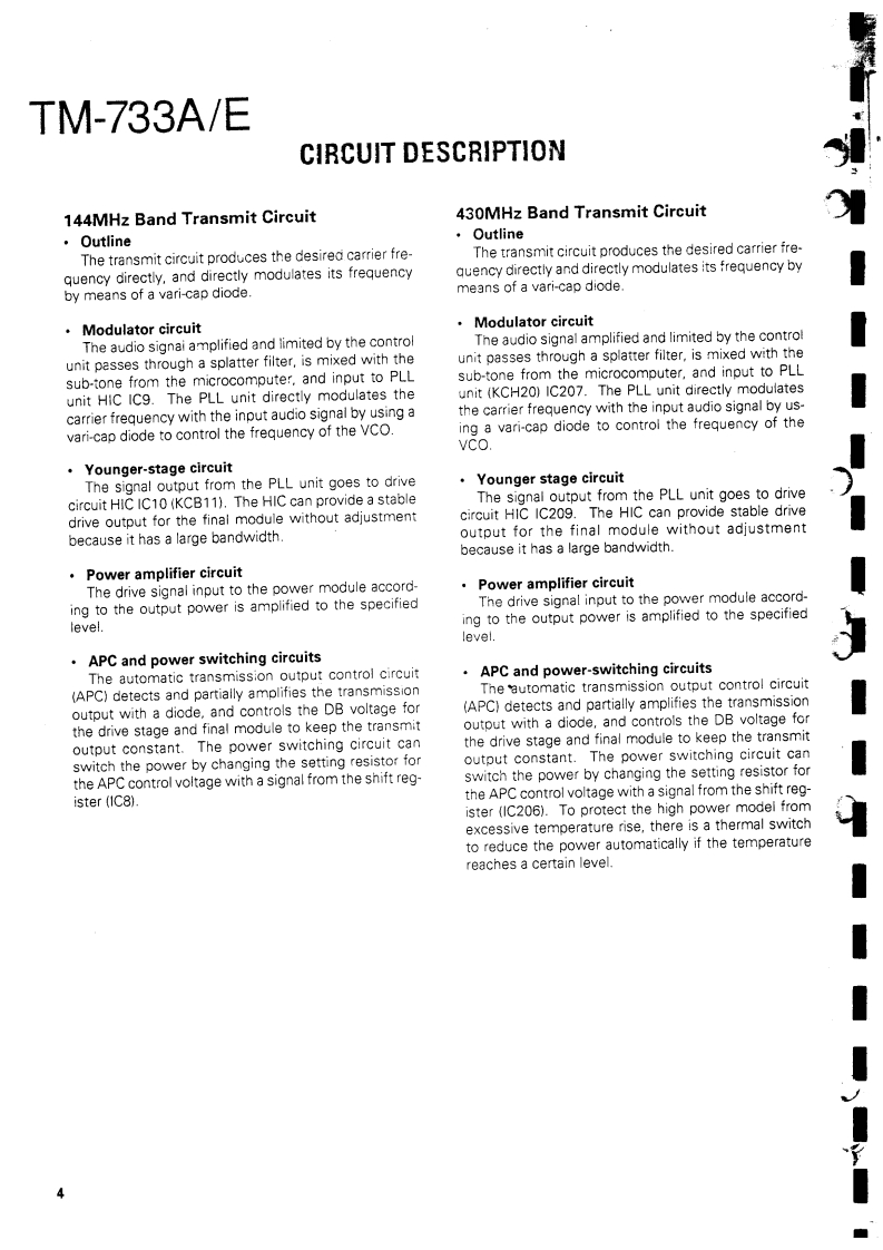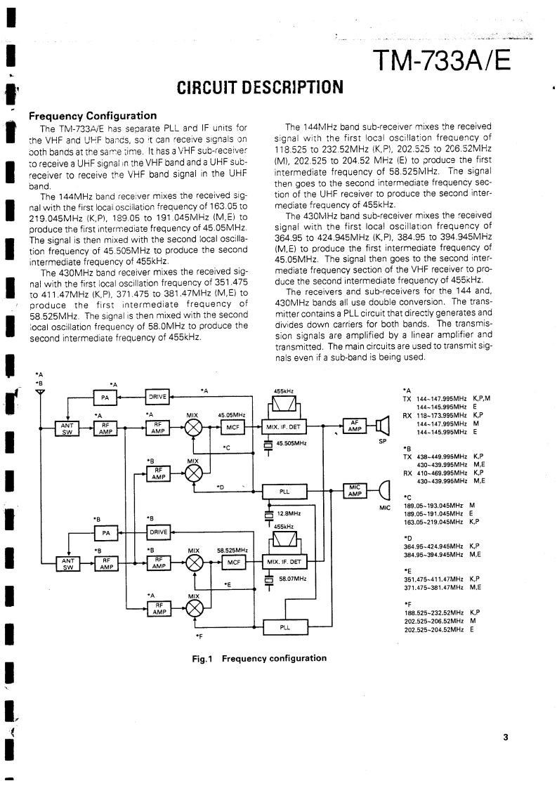 ■144/44CMHz FM DUAL BANDERKENWOODTM-733A/ESERVICE MANUAL1994-3 PRINTED IN JAPAN651-8254-004N1501KnobKnobPanel ASSYMetallic cabinet (TOP)[K27-3142.04)(A62-0281-231(A01-2083-03}(K27-3144-04)KnobCover (DIN)Knob(K27-3141-04)(K27.3143-04)(F07-1376-0415coSHIFKnobKnob(K27-3146-041(K29-4888-04)×2KnobKnob(K29.4887-041(K29-4839-041×2CONTENTSCIRCUIT DESCRIPTIONTX-RX UNIT (X57-436X-XX)(B/4,D/4)...........69SEMICONDUCTOR DATA..23TX-RX UNIT(X57-436X-XX(C/4到…73DESCRIPTION OF COMPONENTS ...26LCD ASSY (B38-070X-25).74PARTSSCHEMATIC DIAGRAM.75BLOCK DIAGRAM..97PACKING.5LEVEL DIAGRAM.........79ADJUSTMENT.….52TERMINAL FUNCTION......80PC BOARD VIEWS/CIRCUIT DIAGRAMSOPTION(DFK-3B/4B/7B)81TX-RX UNIT (X57-436X-XX)(A/4)...................6SPECIFICATIONS............BACK COVER