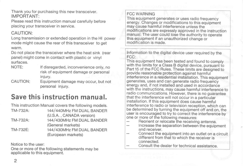 tm732ae_使用说明书手册找手册网30天前发布关注私信8.90MB79页026tm732ae_使用说明书手册此内容为付费资源,请付费后查看¥19¥21黄金会员免费钻石会员免费登录购买付费资源 第1页 / 共79页 第2页 / 共79页 第3页 / 共79页 第4页 / 共79页 第5页 / 共79页 第6页 / 共79页 第7页 / 共79页 第8页 / 共79页 第9页 / 共79页 第10页 / 共79页 试读已结束,还剩69页,您可下载完整版后进行离线阅读 THE END建武 文本预览 144/440 MHz FM DUAL BANDERTM-732A144/430 MHz FM DUAL BANDERKENWOODTM-732A144/430 MHz FM DUAL BANDERTM-732EINSTRUCTION MANUALKENWOOD CORPORATIONCPRINTED IN JAPAN B62-0201-00(K)(MC)92/12111098765432191/1211 查看更多 收起部分 喜欢就支持一下吧收藏