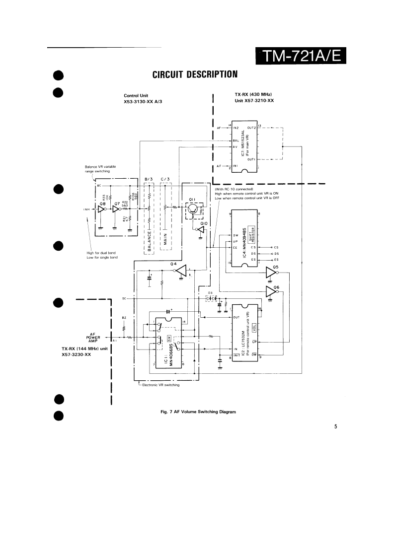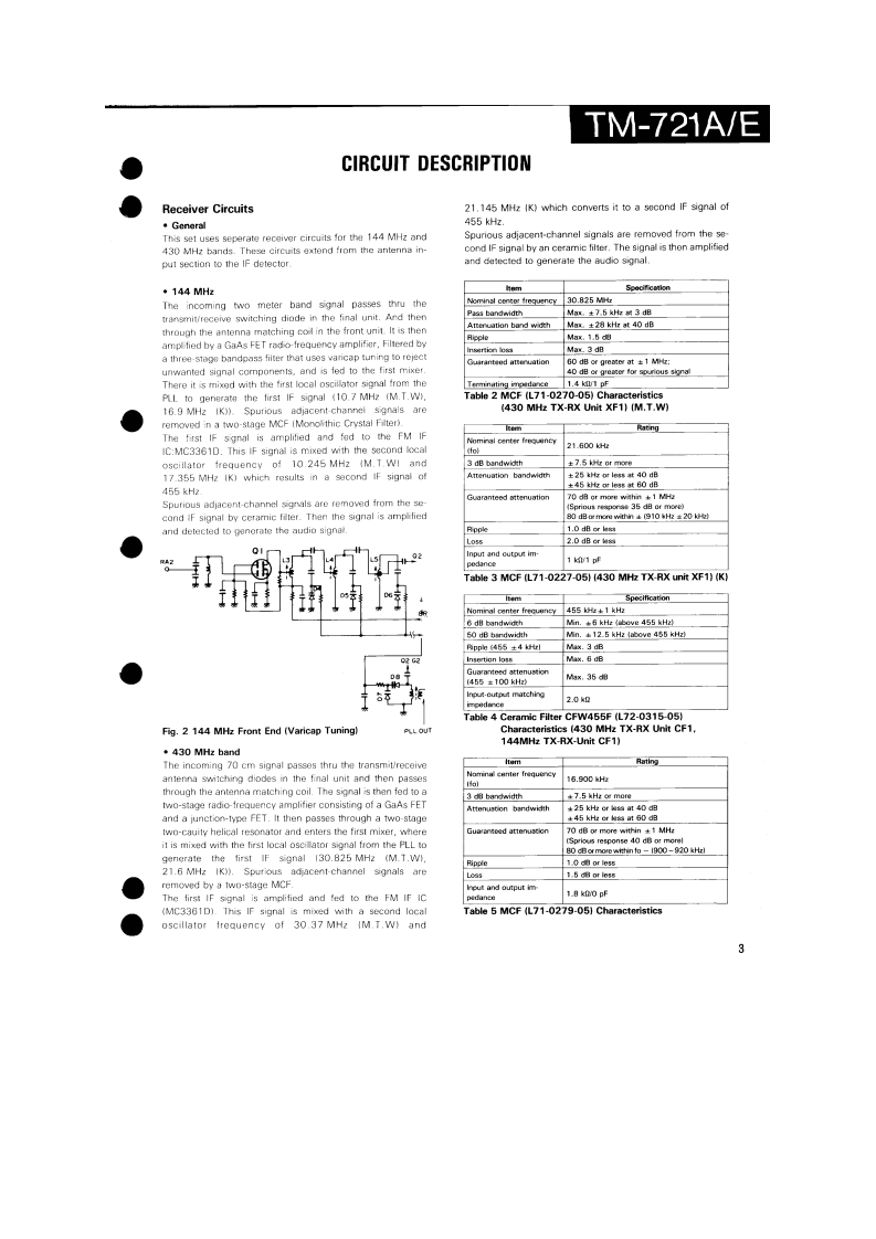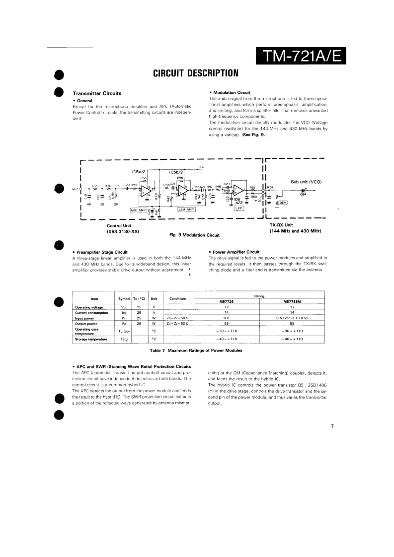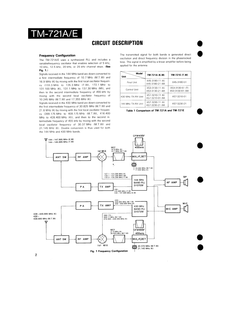 144/430MHz FM DUAL BANDERTM-721A/EKENWOODSERVICE MANUALC1988-2 PRINTED IN JAPANB51-3476-00T)864Knob (Main)Knob(F月Metallic cabinet (Top)Knob (SG](K29-3060-041K29-314304){A01-1047-021K29-3116-04Panel ass'y'A20-1Knob (AF)K29-3115-04KnobKnobKnob (DUAL)(K29-3111-04K29-3112-04)×5(K29-3113-04)×3Pancl*Microphone*x3A20-91KENWOOD146.9709B525Knob (Sub-Encoder)Knob (Button)Metallic cabinet (Bottom)K29-3145-041(K27-3026-041×24A01-1048-021Knob [Up/Down)Knob IButton)Knob (LOW)(K29-3114-04)×2K27-3028-041K29314404*Refer to parts list on page 25.CONTENTSPhoto is TM-721A.CIRCUITCONTROL UNIT (X53-3130-XX).............................61DESCRIPTION OF ELEMENTS..........17144 MHz TX-RX UNIT (X57-3230-XX).....................63PARTS LIST....25430 MHz TX-RX UNIT(X57-3210-XX)......65EXPLODED VIEW46FINAL UNIT (430 MHz)(X45-3180-XX)....................67PACKING.......................................48FINAL UNIT (144 MHz)(X45-3180-XX).........68ADJUSTMENT.….49SCHEMATIC DIAGRAM............................................69TERMINAL FUNCTIONS..................56LEVELDIAGRAM.3PC BOARD VIEW/SCHEMATIC DIAGRAMBLOCK DIAGRAM….75144 MHz VC0UNT(X58-3340-00).59TSU-6 (CTCSS UNIT)..........6430 MHz VC0UNT(X58-3330-00).....60SPECIFICATIONS.........................Back cover