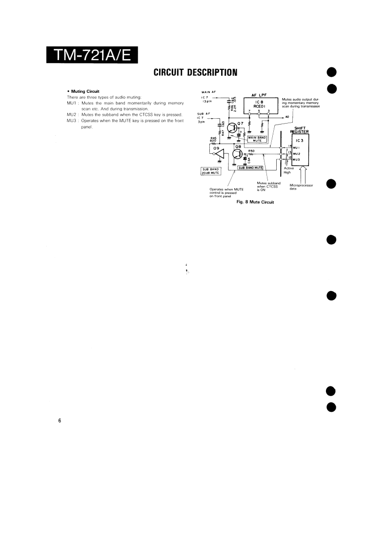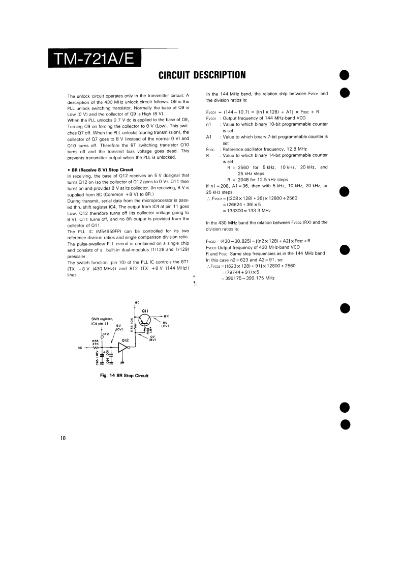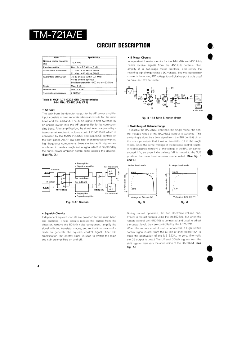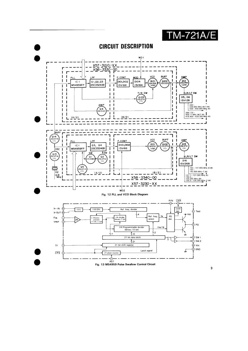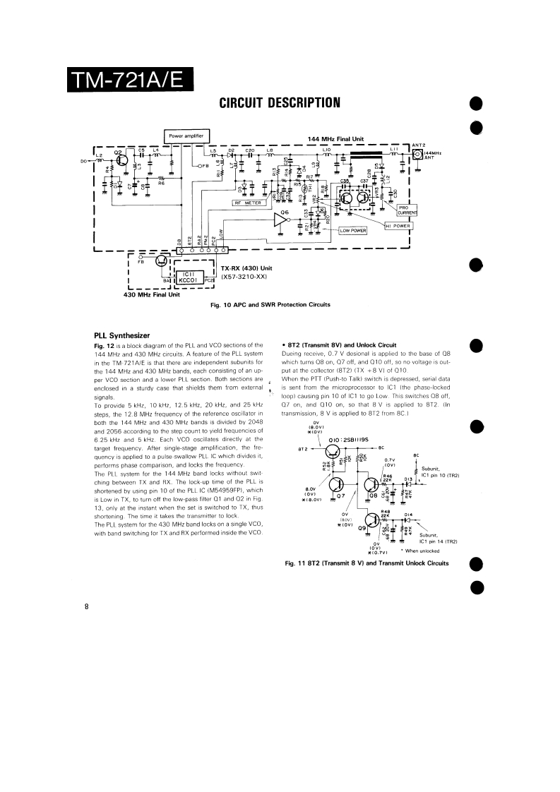 144/430MHz FM DUAL BANDERTM-721A/EKENWOODSERVICE MANUALC1988-2 PRINTED IN JAPANB51-3476-00T)864Knob (Main)Knob(F月Metallic cabinet (Top)Knob (SG](K29-3060-041K29-314304){A01-1047-021K29-3116-04Panel ass'y'A20-1Knob (AF)K29-3115-04KnobKnobKnob (DUAL)(K29-3111-04K29-3112-04)×5(K29-3113-04)×3Pancl*Microphone*x3A20-91KENWOOD146.9709B525Knob (Sub-Encoder)Knob (Button)Metallic cabinet (Bottom)K29-3145-041(K27-3026-041×24A01-1048-021Knob [Up/Down)Knob IButton)Knob (LOW)(K29-3114-04)×2K27-3028-041K29314404*Refer to parts list on page 25.CONTENTSPhoto is TM-721A.CIRCUITCONTROL UNIT (X53-3130-XX).............................61DESCRIPTION OF ELEMENTS..........17144 MHz TX-RX UNIT (X57-3230-XX).....................63PARTS LIST....25430 MHz TX-RX UNIT(X57-3210-XX)......65EXPLODED VIEW46FINAL UNIT (430 MHz)(X45-3180-XX)....................67PACKING.......................................48FINAL UNIT (144 MHz)(X45-3180-XX).........68ADJUSTMENT.….49SCHEMATIC DIAGRAM............................................69TERMINAL FUNCTIONS..................56LEVELDIAGRAM.3PC BOARD VIEW/SCHEMATIC DIAGRAMBLOCK DIAGRAM….75144 MHz VC0UNT(X58-3340-00).59TSU-6 (CTCSS UNIT)..........6430 MHz VC0UNT(X58-3330-00).....60SPECIFICATIONS.........................Back cover