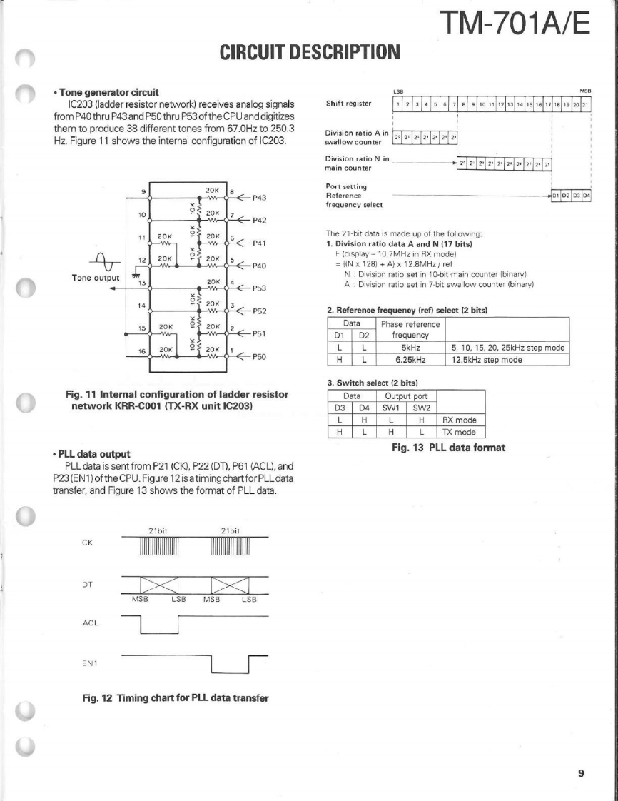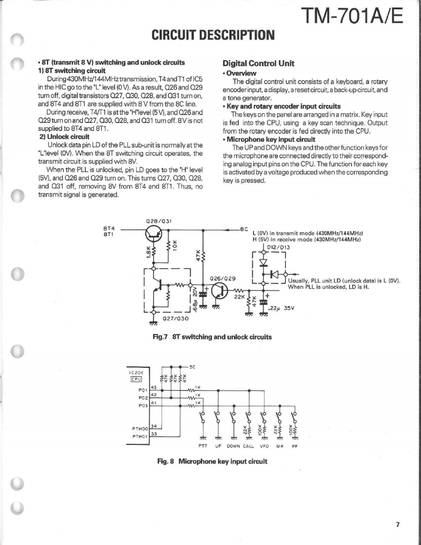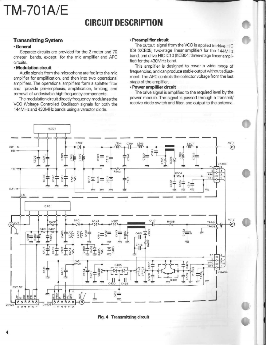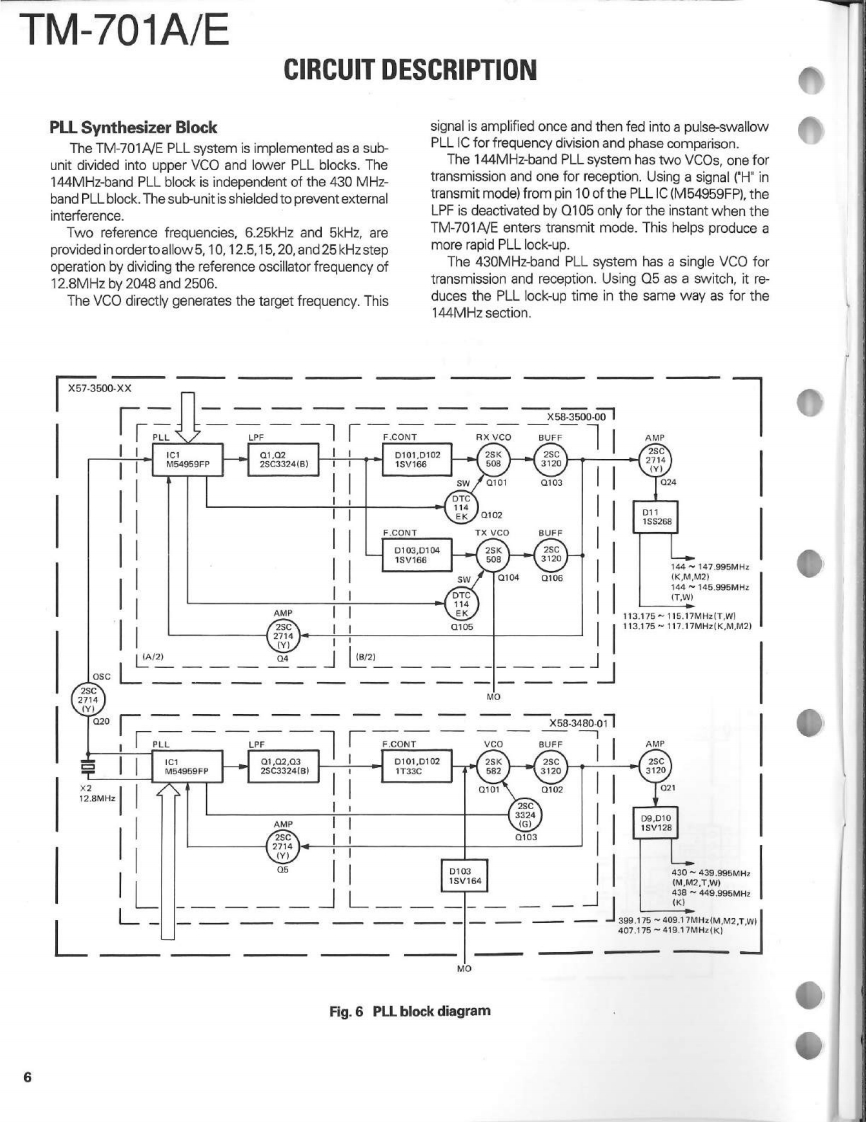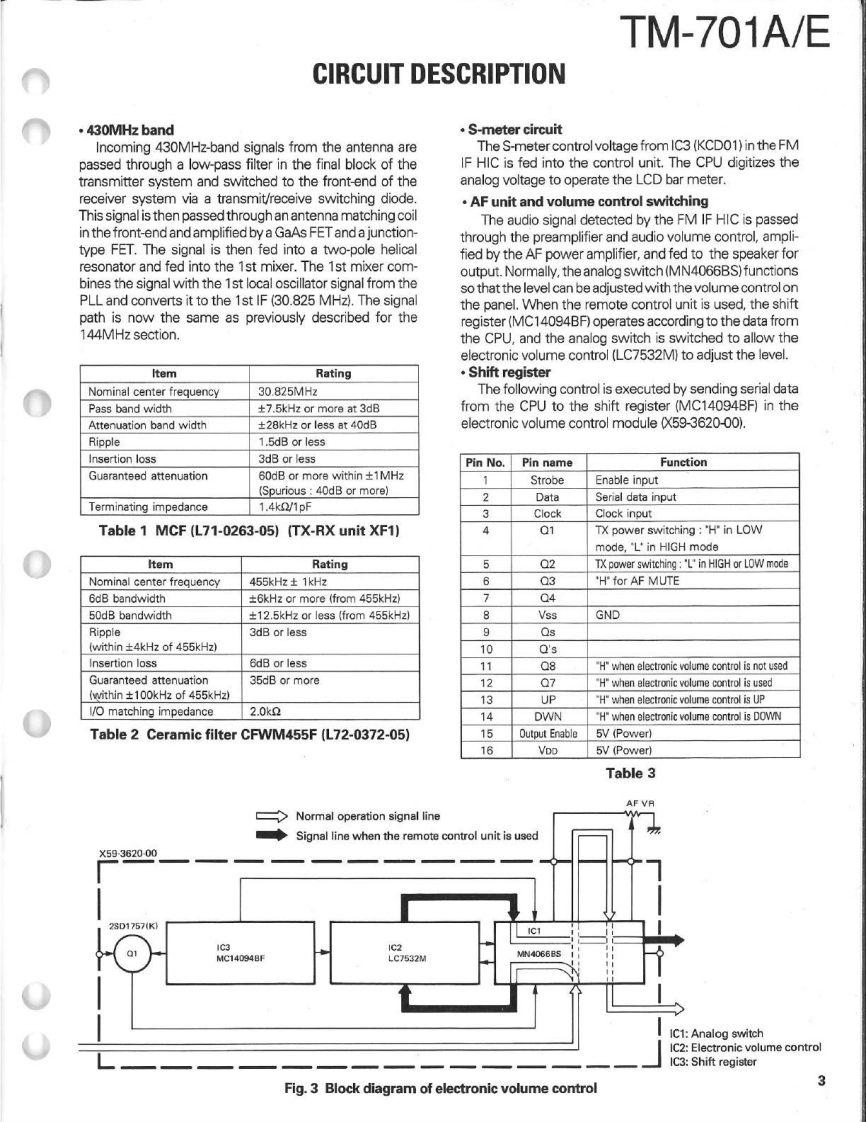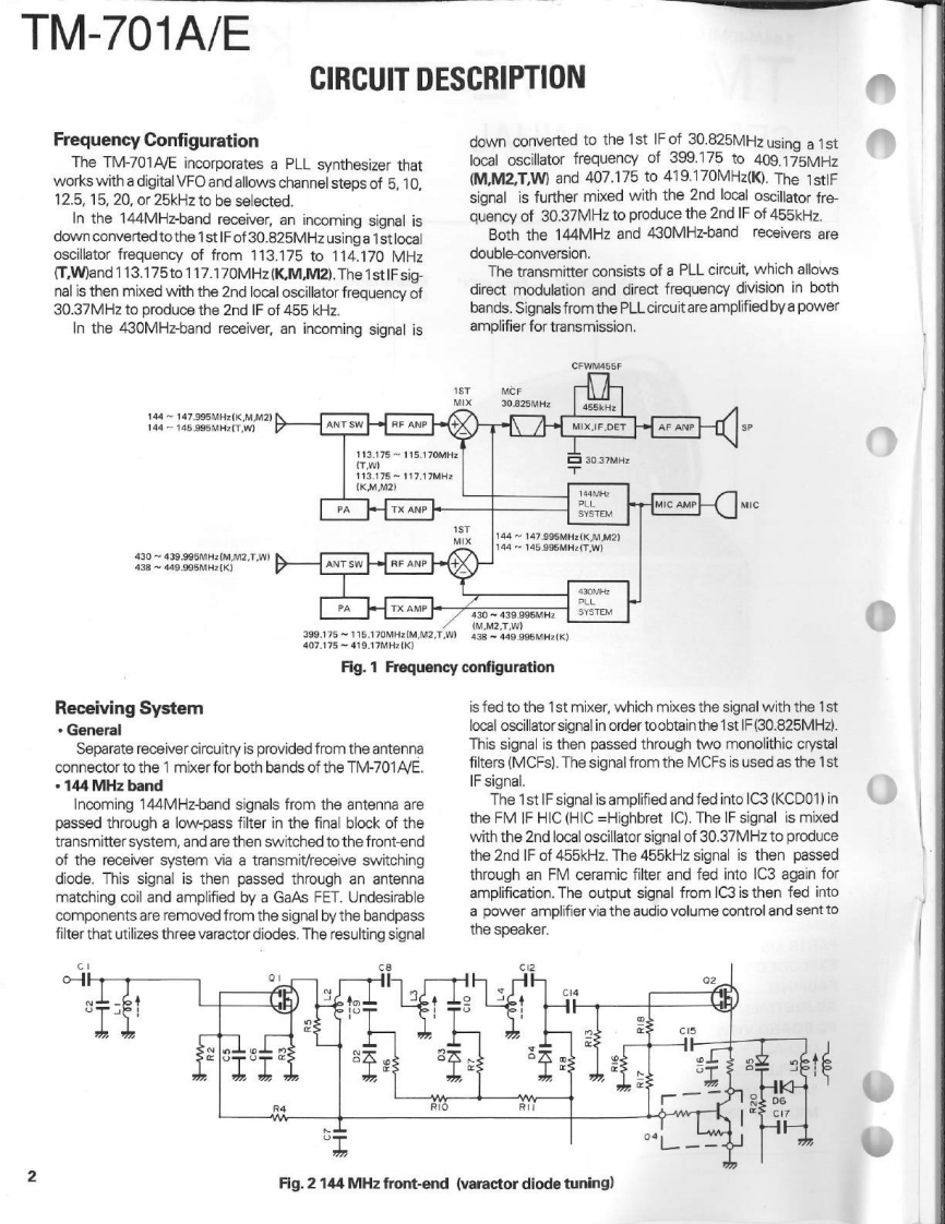 144/440MHz FM DUAL BANDERKENWOODTM-701A/Em●ute nc.SERVICE MANUAL1057 East 2100 SouthP.0.B0x6338Bal Lake Clty.UT 84106B51-8004-00d156813Knob(VFO,MR,MHz)Microphone*Panel ass'y*Metallic cabinet(K27-3035-04)X3(T91-)(A20-】(A01-1067-03)Knob (LOW)(K27-3037-04)6Knob (POWER)(K27-3038-04)61y6.97020Knob(MAIN)Knob (VOL,SQL)Cylindrical receptacle (MIC)(K29-3156-04)(K29-3157-04)X2(E06-0858-15)Knob (CALL,F,SHIFT,TONE,REV,BAND)(K27-3036-04)X6Photo is TM-701A.*Refer to parts list on page 18.CONTENTSCIRCUIT DESCRIPTION......ELEV0L(X59-3620-00).44DESCRIPTION OF COMPONENTS12TX RX UNIT (X57-3350-XX).46SEMICONDUCTOR DATA..17SCHEMATIC DIAGRAM.........51PARTS LIST........18TERMINAL FUNCTIONS54EXPLODED VIEW.。32BLOCK DIAGRAM.55LEVEL DIAGRAM...57ADJUSTM作NT34MC-44(MULTI FUNCTION MICROPHONE).........58PC BOARD VIEWS/CIRCUIT DIAGRAMMC-44DM/MC-44DMELCD ASS'Y(B38-0311-05)39(MULTI FUNCTION MICROPHONE WITH AUTOPATCH)..59430PLL(X58-3480-01)…40MC-44E(MULTI FUNCTION MICROPHONE).......60144PLL(X58-3500-00)…42TSU-6 (CTCSS UNIT)..........61MIC AMP (X59-3610-00).44SPECIFICATIONS.........BACK COVER