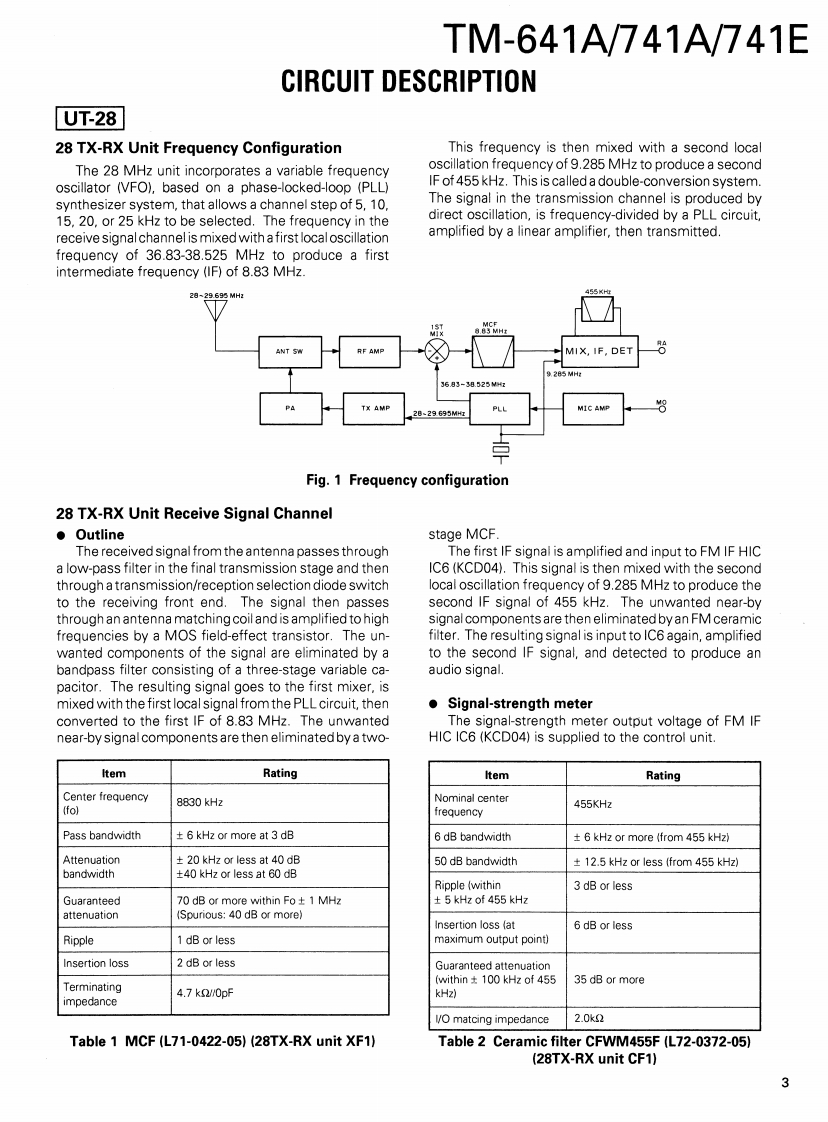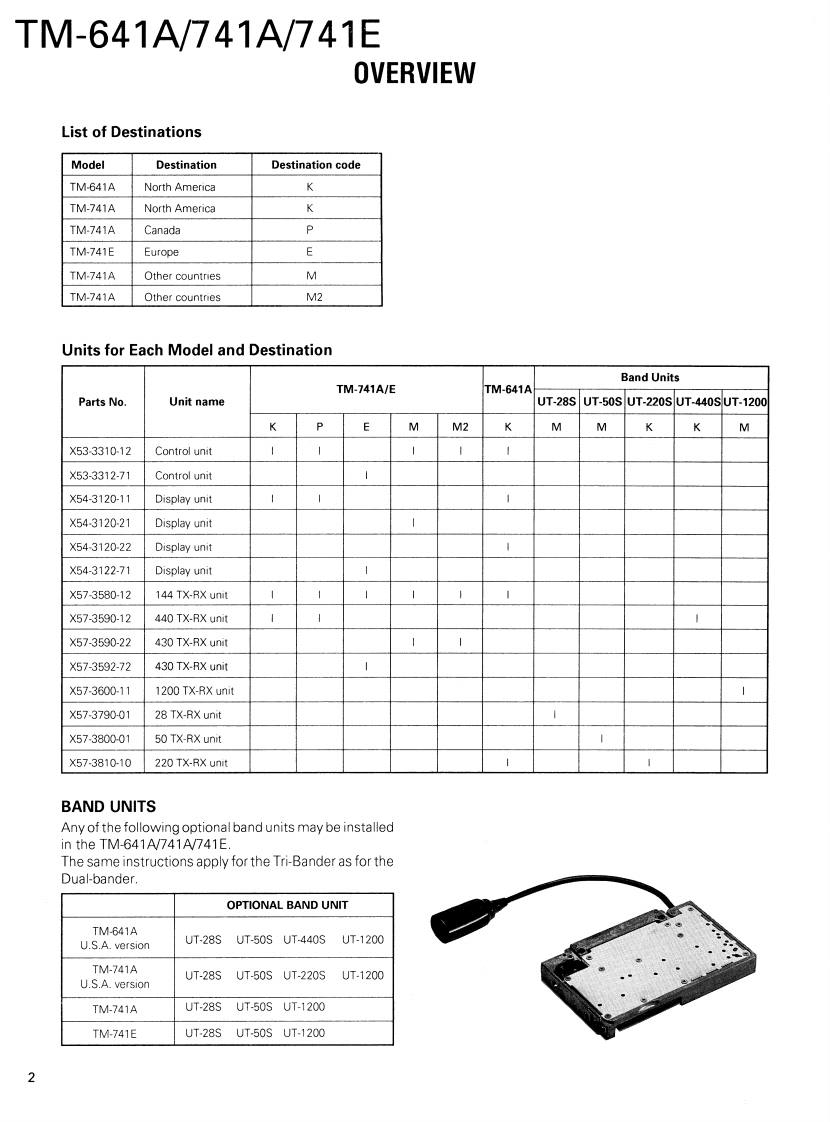 144/220 MHz,144/430 MHz FM MULTI BANDERKENWOODTM-641ABRYan Fields wacrTM-741A/EERaM®3RYan Fielo5.ntSERVICE MANUAL1991-9 PRINTED IN JAPANB51-8139-00(A)1599MICROPHONE(T91-)KENWOODFM MULT电ANCER TM-B4IAKNOB (VFO)-PANEL ASSY(K27-3078-04)器(A62-JKNOB (MR)K27-3079-04)1295界6970224980KNOB(MHz}S9ug四99装ul(K27-3080-04]KNOB (POWER)(K27-3108041KNOB-(K29-3156-04)KNOB (RELEASE)(K27-3092-04)DRESSING PLATEKNOB (SQL)KNOB (VOL)B03-0562-04)(K294576-04)K29-4575-040KNOB (CALL)KNOB (SHIFT)KNOB(REV)KNOBILOW)AK27-3110-04K27-3118-04K27-3114-04K27-3116-04KNOB (F)KNOB (TONE)KNOB (DTSS)KNOB (MUTE)K27-3111-04K27-3113-04K27-3115-04K27-3117-04Refer to parts list on page 62Photo is TM-641ACONTENTSOVER VIEW…2144MTX-RX UNIT (X57-3580-12).143CIRCUIT DESCRIPTION3220MTX-RX UNIT (X57-3810-10).147DESCRIPTION OF COMPONENTS41430/440M TX-RX UNIT (X57-359X-XX)151SEMICONDUCTOR DATA581200MTX-RX UNIT (X57-3600-11)...155PARTS LIST ........61BLOCK DIAGRAM..............159EXPLODED VIEW.105LEVELDIAGRAM................167PACKING…110DTU-2 (DTMF UNIT).171ADJUSTMENT ..113TSU-7(CTCSS UNIT)......173PC BOARD VIEWS SCHEMATIC DIAGRAMMC-45(MULTI FUNCTION MICROPHONE).....175CONTROL UNIT (X53-331X-XX)16MC-45DM (MULTI FUNCTION MICROPHONEDISPLAY UNIT (X54-312X-XX)128WITH AUTOPATCH).....176SCHEMATIC DIAGRAM.............................129PK-4K/L (PANEL SEPARATE KIT K:4M,L:7M).17728M TX-RX UNIT (X57-3790-01)..............133UT-28S/50S/1200 SPECIFICATION...............17850MTX-RX UNIT(X57-3800-01).......139SPECIFICATION.........................B.ACK COVER