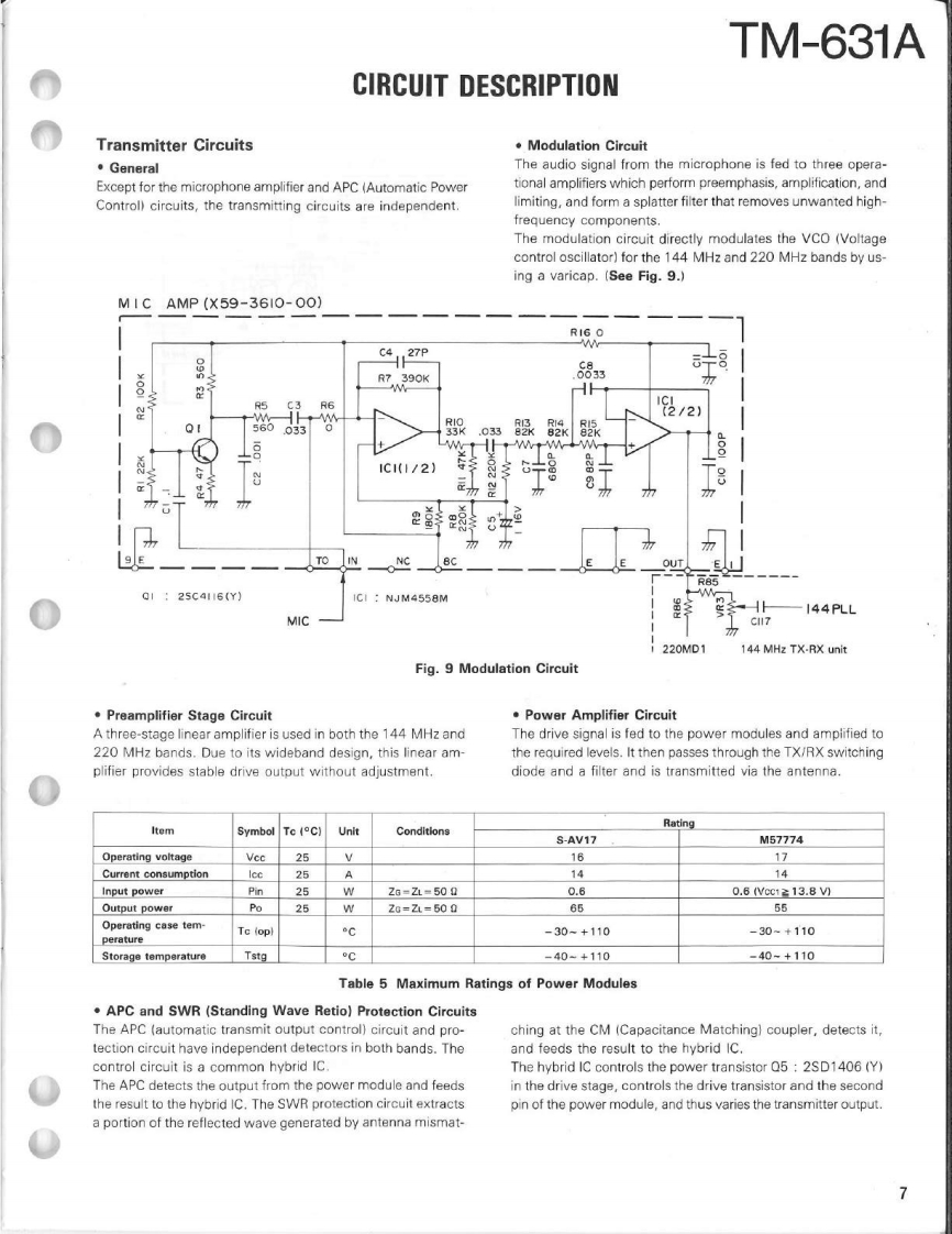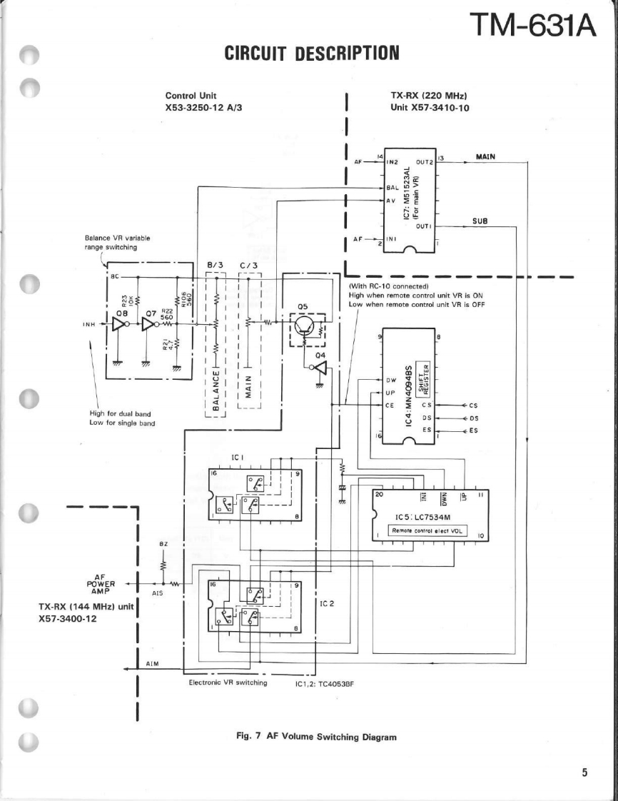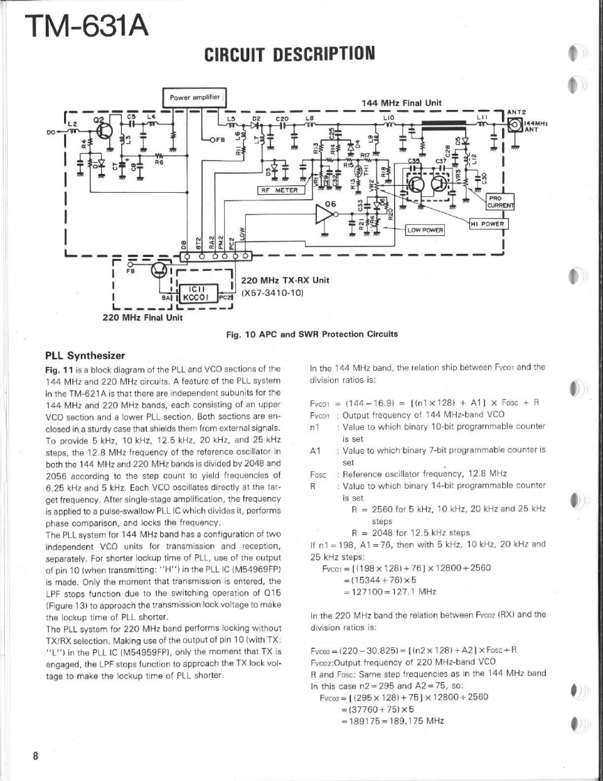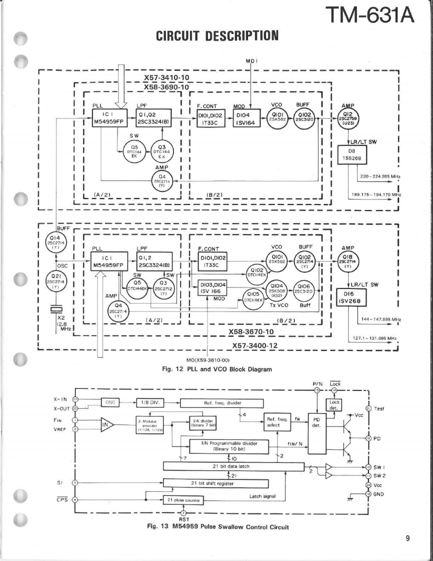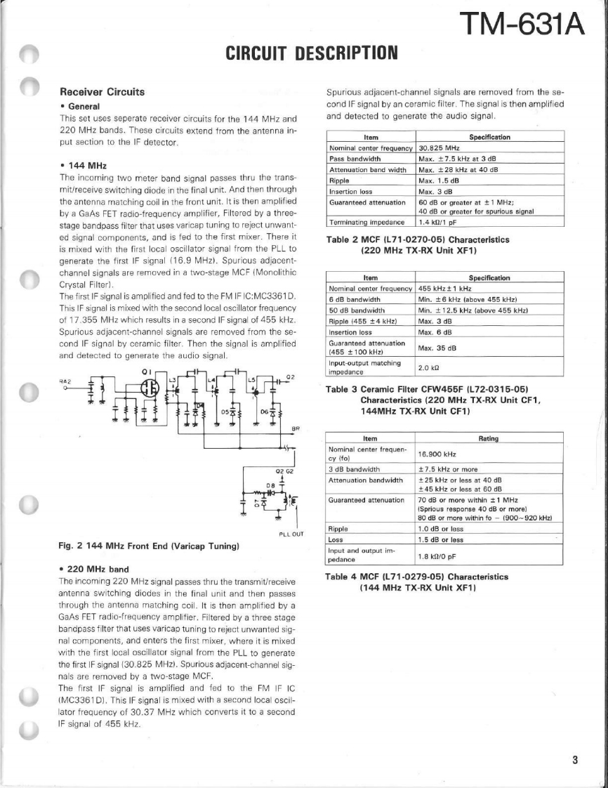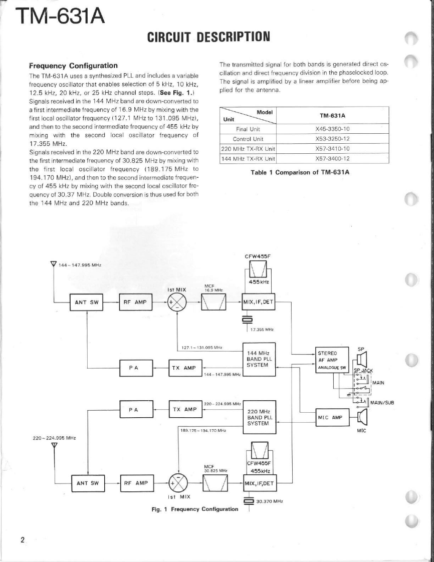144/220MHz FM DUAL BANDERTM-631AKENWOODSERVICE MANUALC1989-8 PRINTED IN JAPANB51-8016-00T)633KnobK29-3111-04×3Microphone(T91-0380-25)Panel ass'y(A20-701402Knob (SQ)(K29-3116-04)Knob (AF月(K293115-041Metallic cabinet (Top)Panel{A01-1048-02)(A20-7021-02)KENWOODKnob (MAIN)K29-3060-041y6.9704980Knob (SCAN,MUTE)(K29-3112-041×5Knob (Up/Down)K29-3114-04)×2Knob (F)Knob (Sub-Encoder)Knob (DUAL)(K29-3145-04)K29-3143-04)K29-3113-04)×3Knob (Button)(K27-3026-04)×2Knob (Low)Knob (Button)K29-3144041K27-3028-04Metallic cabinet (Bottom)(A01-1076-021CONTENTSCIRCUIT DESCRIPTION............2C0 NTROL UNIT(X53-3250-12)..61DESCRIPTION OF ELEMENTS..............17144 MHz TX-RX UNIT (X57-3400-12)63PARTS LIST.....25220 MHz TX-RX UNIT (X57-3410-10).........65EXPL0 DED VIEW…6FINAL UNIT (220 MHz)(X45-3350-10)..................67PACKING48FINAL UNIT (144 MHz)(X45-3350-10)..................68ADJUSTMENT..49SCHEMATIC DIAGRAM............69TERMINAL FUNCTIONS........56LEVEL DIAGRAM..73PC BOARD VIEW/SCHEMATIC DIAGRAMBLOCK DIAGRAM....5144 MHz PLL UNIT(X58-3670-10)..59TSU-6 (CTCSS UNIT).............................76220 MHz PLL UNIT(X58-3690-10)..60SPECIFICATIONS......................Back cover