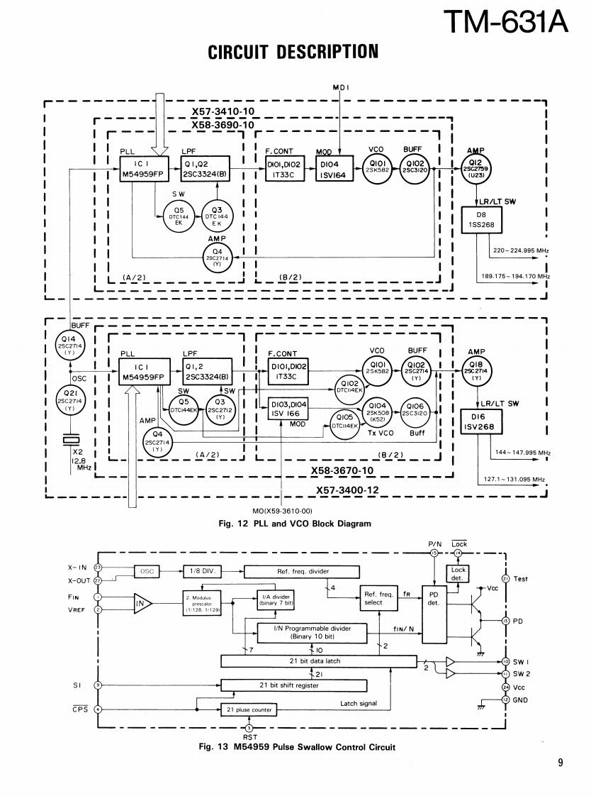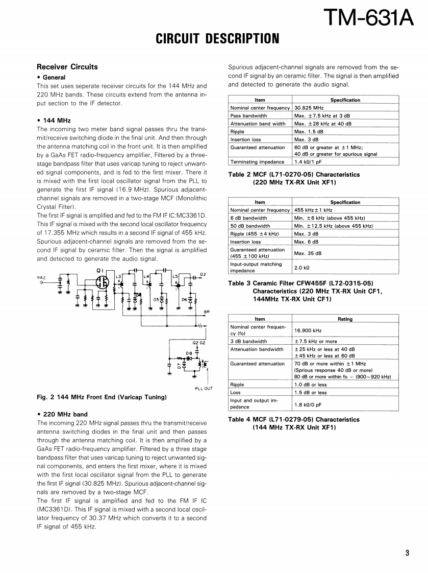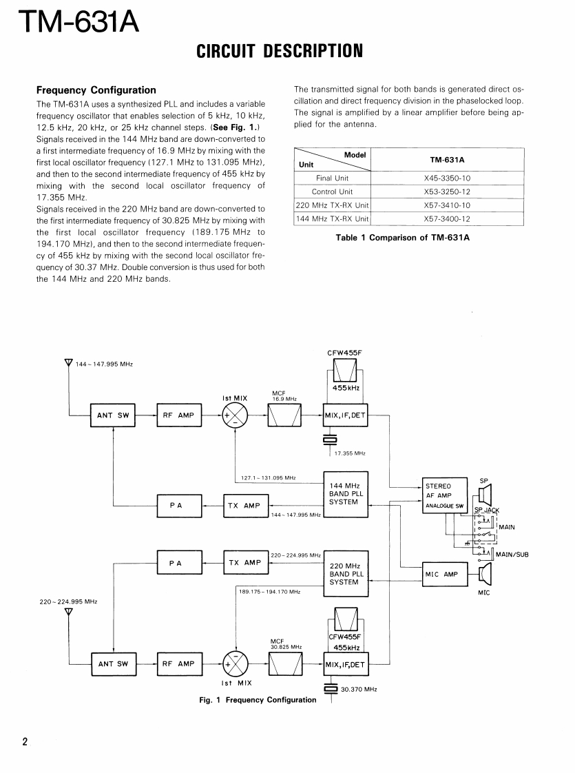 144/220MHz FM DUAL BANDERTM-631AKENWOODBRyan Fields WqcRSERVICE MANUALBRYan@Bryan Fells.netC1989-8 PRINTED IN JAPANB51-8016-00(T633KnobMicrophoneK29-3111-04)×3(T91-0380-25Panel ass'yA20-7014-021Knob (SQ](K29-3116-041Knob(AF月Metallic cabinet (Top)K29-3115-041 Panel{A01-1048-02)(A20-7021-021FM CUALKnob (MAIN)K29-3060-041469702298Knob (SCAN,MUTE)K29-3112-041×5Knob (Up/Down)K29-3114-04)×2Knob (F)Knob (Sub-Encoder)Knob (DUAL](K29-3143-04K29-3145-04K29-311304}×3Knob (Button)(K27-3026-041×2Knob [Low)Knob (Button)K29-3144-04)K27.3028-04)Metallic cabinet (Bottom)A01-1076-02CONTENTSCIRCUIT DESCRIPTION........3C0 NTROL UNIT(X53-3250-12)..61DESCRIPTION OF ELEMENTS.................17144 MHz TX-RX UNIT(X57-3400-12)..63PARTS LIST...............25220 MHz TX-RX UNIT(X57-3410-10)65EXPLODED VIEW.46FINAL UNIT (220 MHz)(X45-3350-10)...................67PACKING..48F1 NAL UNIT(144MHz)(X45-3350-10)68ADJUSTMENT.49SCHEMATIC DIAGRAM....................69TERMINAL FUNCTIONS..................56LEVEL DIAGRAM..3PC BOARD VIEW/SCHEMATIC DIAGRAMBLOCK DIAGRAM.........75144 MHz PLL UNIT(X58-3670-10)....59TSU-6 (CTCSS UNIT)........76220 MHz PLL UNIT(X58-3690-10)..60SPECIFICATIONS..............Back cover