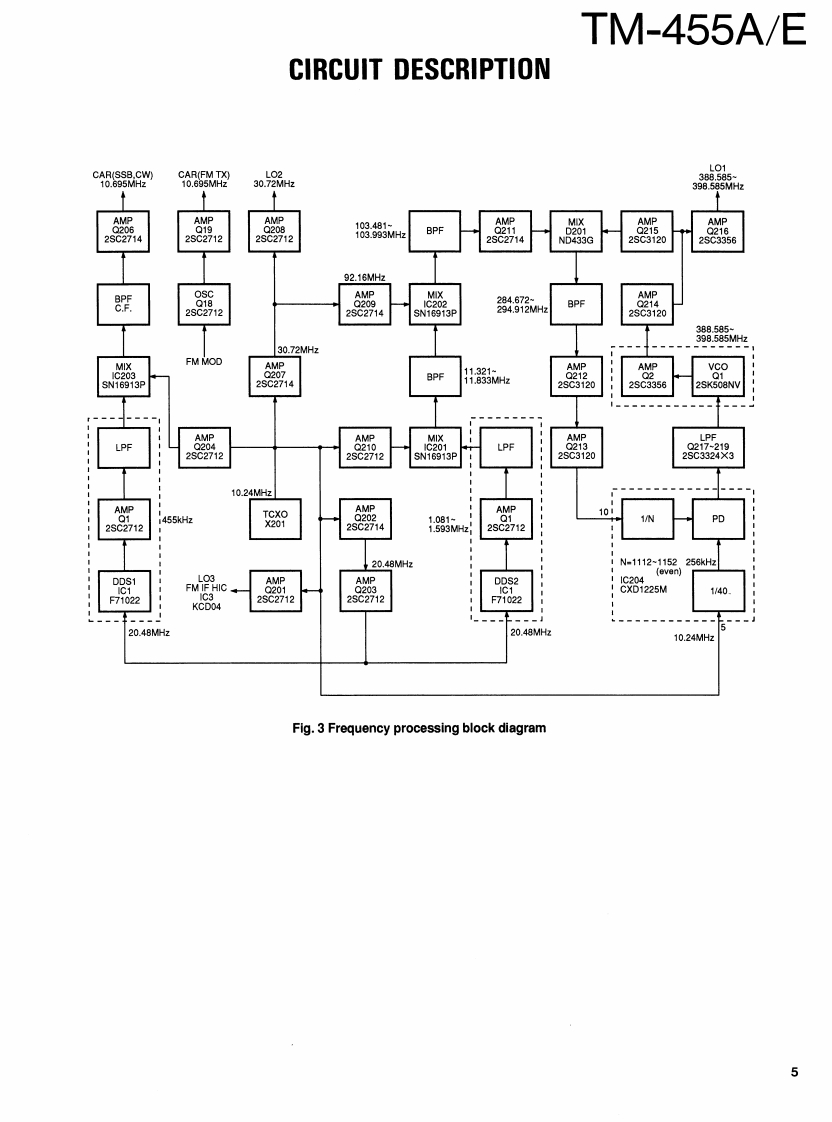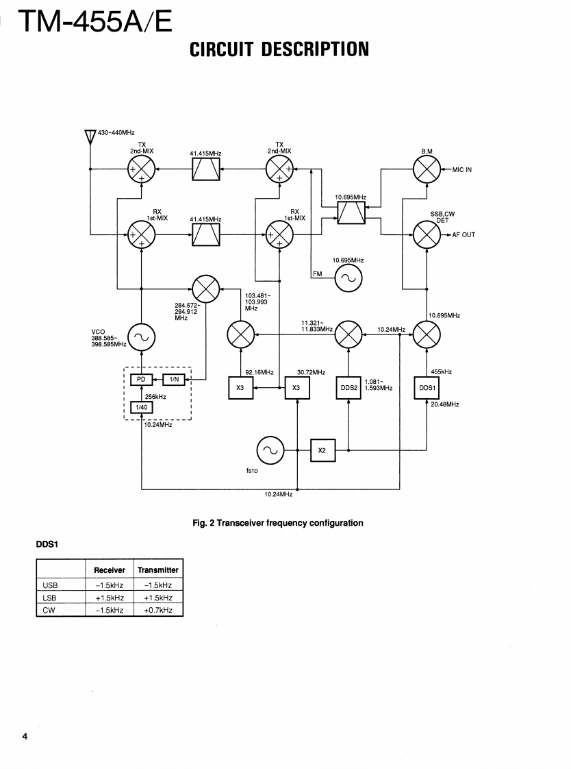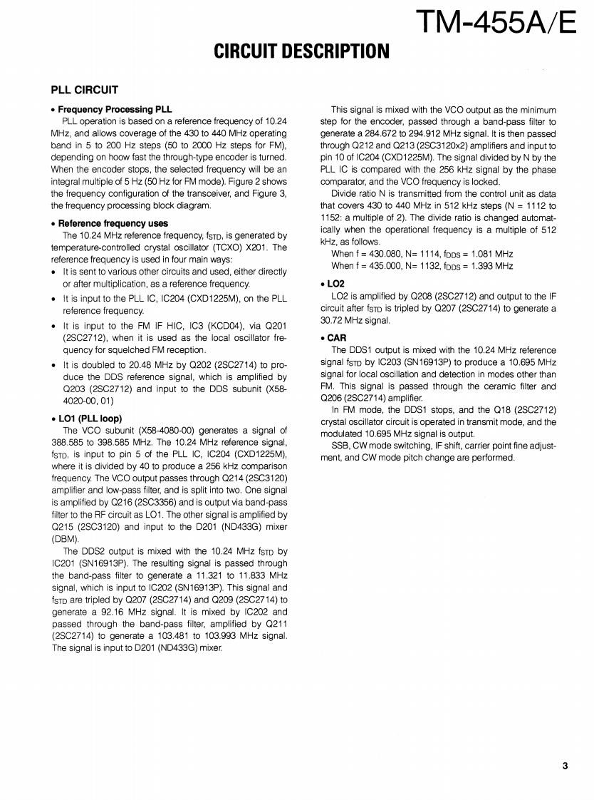 430MHz ALL MODE TRANSCEIVERKENWOODTM-455A/EBnyan FieldsW9C RSERVICE MANUALBran③Brion Fiel5.net1993-12 PRINTED IN JAPANB51-8250-00(S)1060MicrophonePanel(A62-0300-03):455AKnob(MODE)81880831:4eA62-0301-03):455E(K-29-487004)Metallic cabinet (UPPER)(A01-2077-02)KENWOODKnob (MODE)(K29-4870-04Knob(FUNCTION)(K29-4871-04)KENWOODKnob (M.CH)(K29-3156-04)435800.Knob (MAIN)K21-0793-04Panel (BASE)(A62-0265-03Knob(POWER)(K27-3091-04)Foot InsulationJ02-0441-05Knob (MR)Knob(A/B)Knob(MHz)KnobKnob(F)Knob(SHIFT)(K29-4858-14)(K29-4859-14)(K29-4860-14)(AF·VOL.RITT(K29-4862-04)(K29-491604K29-4809-04)Knob(RIT)Knob(M.IN)Knob (M>V)Knob(TONE)Knob (REV)(K29-4861-14)(K29-4864-14)(K29-4865-14)Knob (SQL,SHIFT)(K29-4868-04)(K29-4869-04)K29-4810-04)Knob (SCAN)Knob (CLR)(K29-4866-14)(K29-4867-14PHOTO is TM-455ECONTENTSCIRCUIT DESCRIPTION......................2SUB UNIT(X58-4020-0X0..96SEMICONDUCTOR DATA.......27TX-RX UNIT(X57-4510-XX)(A/5)97DESCRIPTION OF COMPONENTS.......................34CONTROL UNIT (X53-351X-XX)(A/2)..........101PARTS LST..40VC0UNT(X58-4080-00).103EXPLODED VIEW.........66FAN UNIT(X59-4020-00)..104EXPLODED VIEW (CONTROL)...............67LCD ASSY(B38-0701-25).105PACKING.0SCHEMATIC DIAGRAM......107ADJUSTMENT........69TERMINAL FUNCTION......119PC BOARD VIEWSBLOCK DIAGRAM.........125CONTROL UNIT (X53-351X-XX)(B/2)..............90WIRING DIAGRAM..........127TX-RX UNIT(X57-4510-XX))(D/5)..90LEVEL DIAGRAM........129TX-RX UNIT(X57-4510-XX)(E/5).91DFK-7A (PANEL SEPARATE KIT).................131TX-RX UNIT(X57-4510-XX)(B/5).92SPECIFICATIONS...............BACK COVERTX-RX UNIT(X57-4510-XX)(C/5).94DESTINATION LISTTypeUnitDestinationFreq.rangeTransmit(Guaranteed specification)powerTM-455AKY52-3170-11North430.0to439.999995MHz35WAmericaTM-455EEY52.3172.71Europe430.0to439.999995MHz35W