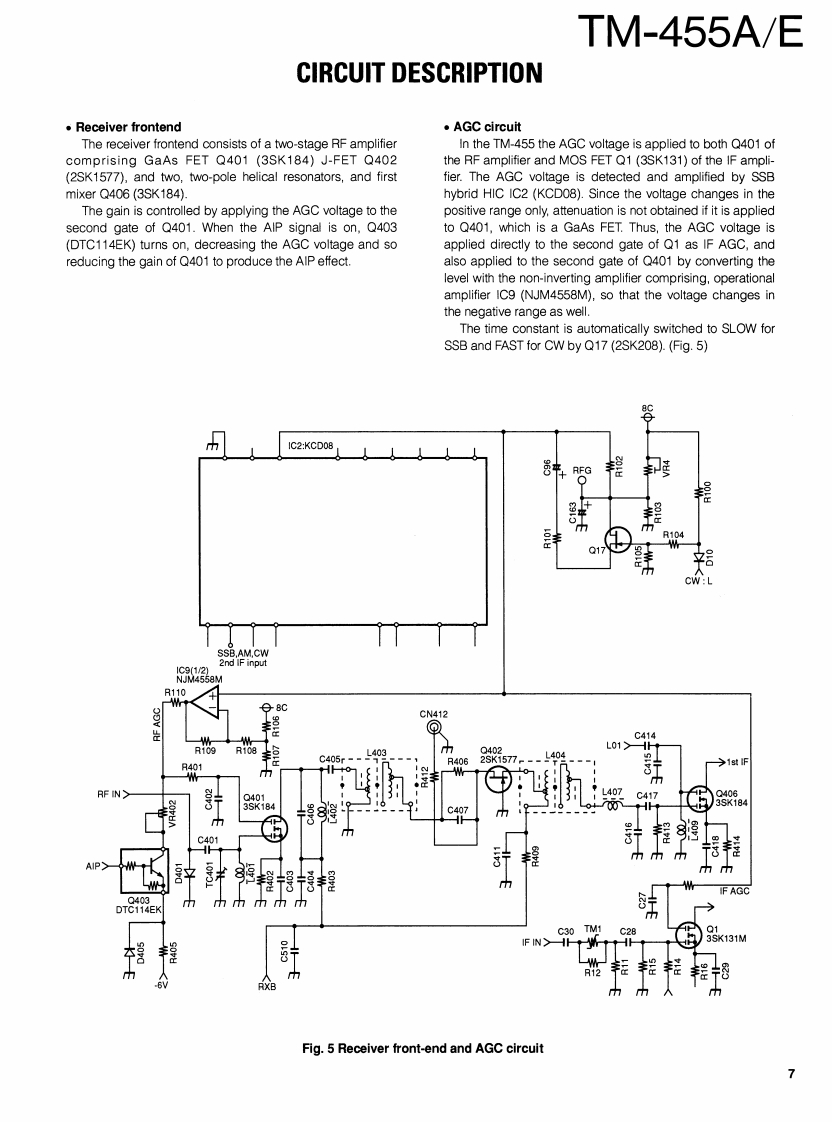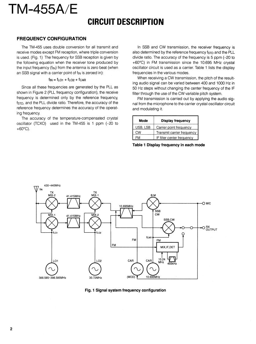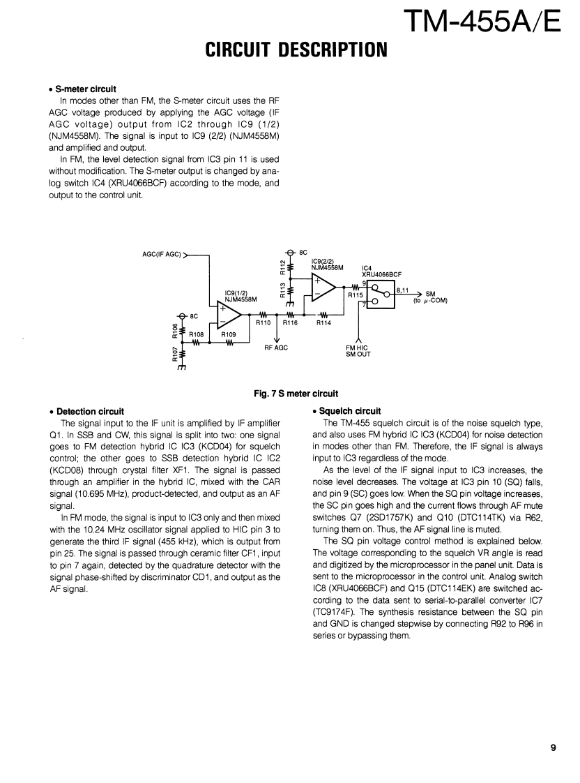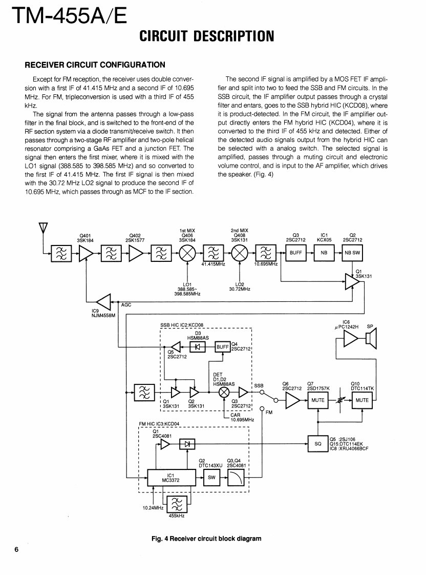430MHz ALL MODE TRANSCEIVERKENWOODTM-455A/EBnyan FieldsW9C RSERVICE MANUALBran③Brion Fiel5.net1993-12 PRINTED IN JAPANB51-8250-00(S)1060MicrophonePanel(A62-0300-03):455AKnob(MODE)81880831:4eA62-0301-03):455E(K-29-487004)Metallic cabinet (UPPER)(A01-2077-02)KENWOODKnob (MODE)(K29-4870-04Knob(FUNCTION)(K29-4871-04)KENWOODKnob (M.CH)(K29-3156-04)435800.Knob (MAIN)K21-0793-04Panel (BASE)(A62-0265-03Knob(POWER)(K27-3091-04)Foot InsulationJ02-0441-05Knob (MR)Knob(A/B)Knob(MHz)KnobKnob(F)Knob(SHIFT)(K29-4858-14)(K29-4859-14)(K29-4860-14)(AF·VOL.RITT(K29-4862-04)(K29-491604K29-4809-04)Knob(RIT)Knob(M.IN)Knob (M>V)Knob(TONE)Knob (REV)(K29-4861-14)(K29-4864-14)(K29-4865-14)Knob (SQL,SHIFT)(K29-4868-04)(K29-4869-04)K29-4810-04)Knob (SCAN)Knob (CLR)(K29-4866-14)(K29-4867-14PHOTO is TM-455ECONTENTSCIRCUIT DESCRIPTION......................2SUB UNIT(X58-4020-0X0..96SEMICONDUCTOR DATA.......27TX-RX UNIT(X57-4510-XX)(A/5)97DESCRIPTION OF COMPONENTS.......................34CONTROL UNIT (X53-351X-XX)(A/2)..........101PARTS LST..40VC0UNT(X58-4080-00).103EXPLODED VIEW.........66FAN UNIT(X59-4020-00)..104EXPLODED VIEW (CONTROL)...............67LCD ASSY(B38-0701-25).105PACKING.0SCHEMATIC DIAGRAM......107ADJUSTMENT........69TERMINAL FUNCTION......119PC BOARD VIEWSBLOCK DIAGRAM.........125CONTROL UNIT (X53-351X-XX)(B/2)..............90WIRING DIAGRAM..........127TX-RX UNIT(X57-4510-XX))(D/5)..90LEVEL DIAGRAM........129TX-RX UNIT(X57-4510-XX)(E/5).91DFK-7A (PANEL SEPARATE KIT).................131TX-RX UNIT(X57-4510-XX)(B/5).92SPECIFICATIONS...............BACK COVERTX-RX UNIT(X57-4510-XX)(C/5).94DESTINATION LISTTypeUnitDestinationFreq.rangeTransmit(Guaranteed specification)powerTM-455AKY52-3170-11North430.0to439.999995MHz35WAmericaTM-455EEY52.3172.71Europe430.0to439.999995MHz35W