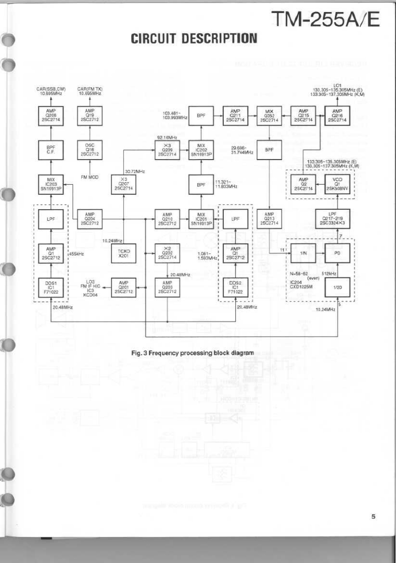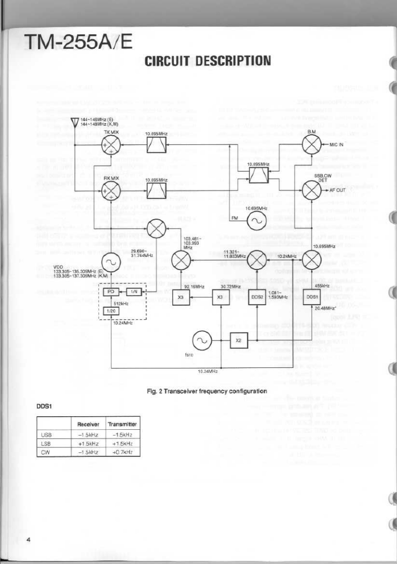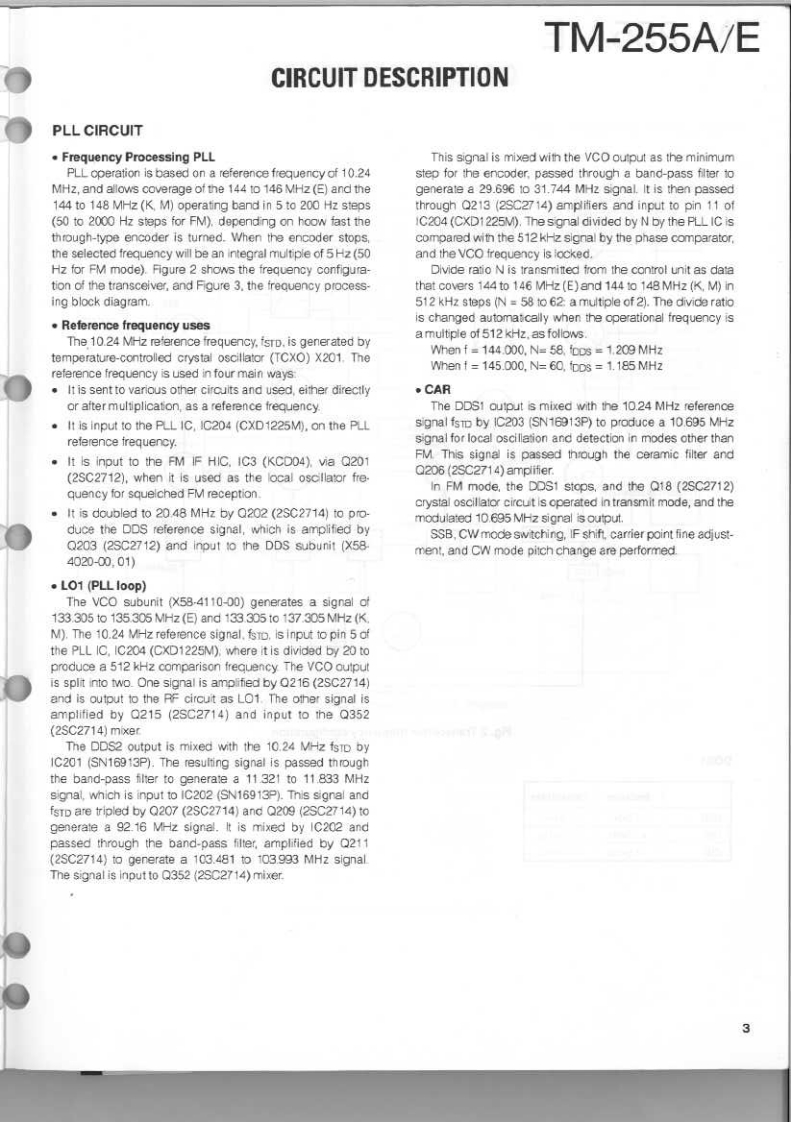 144MHz ALL MODE TRANSCEIVERKENWOODTM-255A/ESERVICE MANUALO 1994-2 PRINTED IN JAPANB51-8266-00(B)1095PanelKnobKnobMetallic cabinet (UPPER)(A62-0339-03):255A(K29-4870-04)(K294870-04(A01-207702)A62-0340-03:255EKnob(K294871-04)Knob (M.CH)(K29-3156-04146.9700a22684Panel(BASE)Knob(POWER)(A62-026503(0K27309104)Foot Insulation(02-0441-05)1路给器密4Knob(AF·VOL,RTKncb (F)Knob (SHIFT)(K294882-04K29-4916-04Knob (RIT)Knob (M.IN)K29-4809-04Knob(M>V)(K29-4861-14)(K29-4864-14)K29-4865-14Knob (TONE)Knob (REV)(K29-4868-04K29-4869-041Knob(SQL,SHIFT)K294310-04PHOTO is TM-255ECONTENTSCIRCUIT DESCRIPTION...….2SUB UNIT(DDS)(X58-4020-0X)94SEMICONDUCTOR DATA..............27TX-RX UNIT (X57-4530-XX)(A/5)......95DESCRIPTION OF COMPONENTS...............34CONTROL UNIT (X53-351X-XX)(A/2)..............99PARTS LIST...............4.40SUB UNIT(VCO)(X58-4110-00)…101EXPLODED VIEW..….64MODULE UNIT(FAN)(X59-4020-00)102EXPLODED VIEW (CONTROL)...........65LCD ASSY(B38-0701-25)4n.103PACKING**4.66SCHEMATIC DIAGRAM.........105ADJUSTMENT.........67TERMINAL FUNCTION.117PC BOARD VIEWSBLOCK DIAGRAM........123CONTROL UNIT (X53-351X-XX)(B/2).............88WIRING DIAGRAM.125TX-RX UNIT(X57-4530-X0(D5).88LEVEL DIAGRAM.......127TX-RX UNIT(X57-4530-X0(E5.….89DFK-7A(PANEL SEPARATE KIT).129TX-RX UNIT (X57-4530-XX)(B/5).......90PG-5A (DATA CABLE).129TX-RX UNIT(CX57-4530-X0(C/5)..92SPECIFICATIONS............BACK COVERDESTINATION LISTTypeUnitDestinationFreq.rangeTransmit(Guaranteed speciflcalion)powerTM-255AKY52-3190-11North America144.0b147999395MH240wTM-255AMY32.3190-21GeneralMarket14d.0b147999995MHz40WTM-255EY52-3192.71Euroge144.0to.145992995MH240wTM-255EEgY52-3192-72Frarce144.0tD145999995NHz40w