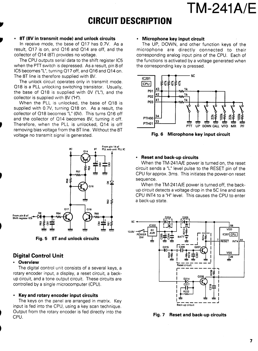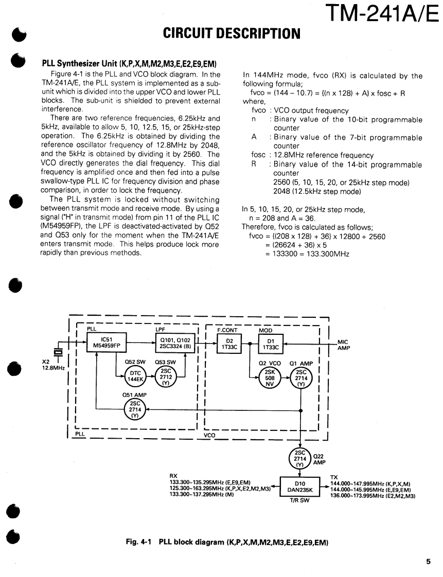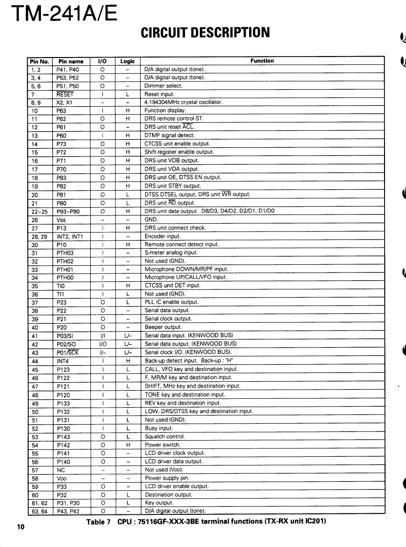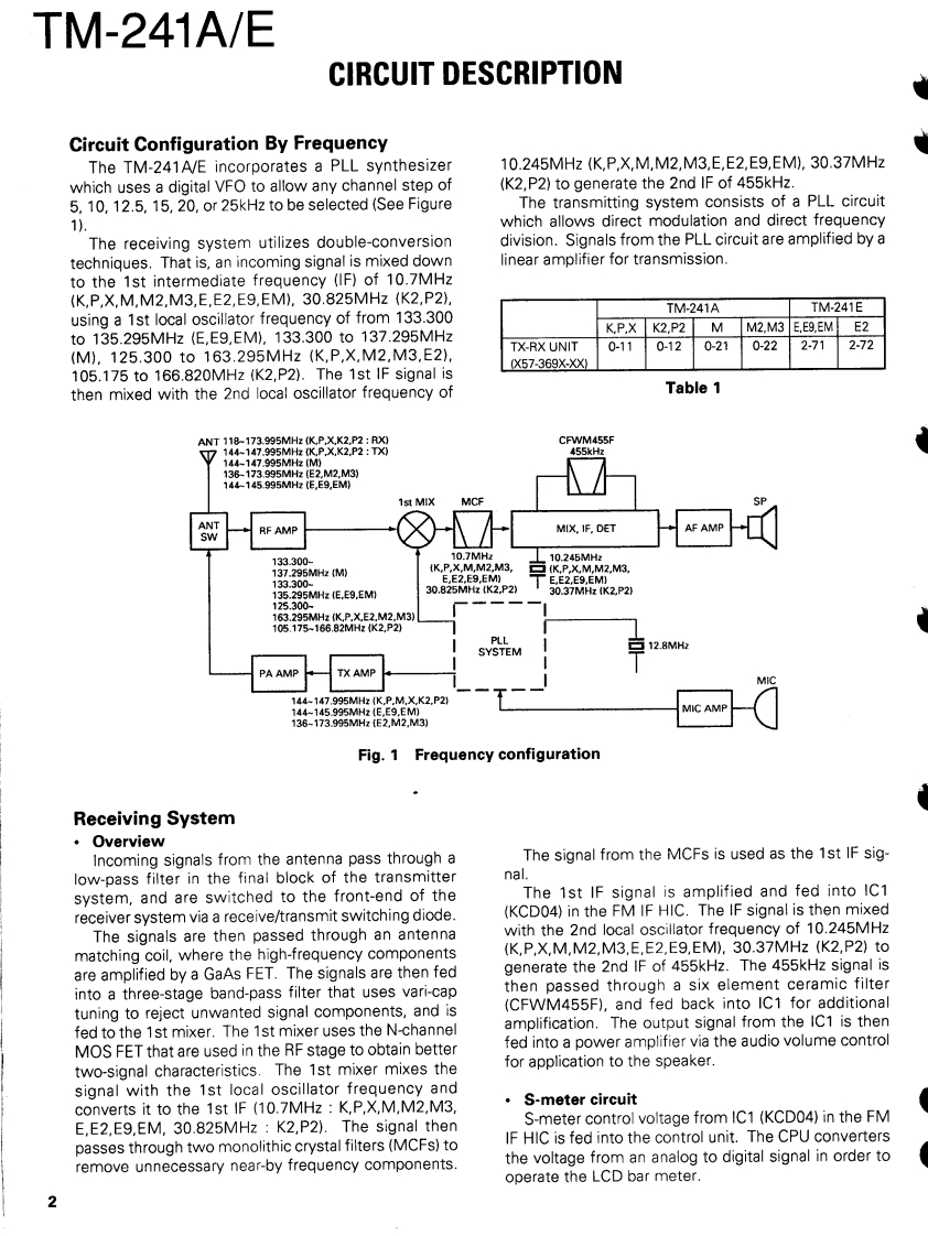 144MHz FM TRANSCEIVERKENWOODTM-241A/ESERVICE MANUALREVISED1994-5 PRINTED IN JAPANB51-8059-10(N)1177This service manual is the same as the ser-Knob (VFO,MR,MHz)Microphone*vice manual (B51-8059-00)for TM-241A/EK27-3035-14)×3(T91-)Panel ass'y"(TM-241A K,P,M,M2 TM-241E:E,E2)desti-(A62-)nations except that this manual contains newitems for (TM-241A:M3.X,K2,P2 TM-241E:Knob (VOL,SQL)E9,EM)destinations.(K29-3157-04)x2Use it together with the previous serviceKnob (LOW)m8nual(B51-8059-001(K27.3067-04)Knob (POWER)(K27-3066-04)KENWOOD4y6.970F28CNNBSKnob (SHIFT)Knob (REV)(K27-3074-14)K27-3072-14Knob (MAIN)Knob (CALL)Knob (F)Knob (TONE)Knob (DR/DT)Mic receptacle(K29-3156-04)(K27-3068-14)(K27-3069-14)(K27-3071-14)(K27-3075-14)(E06-0860-05)Photo is TM-241A.Refer to parts list on page 15.CONTENTSCIRCUIT DESCRIPTION ......2TX-RX UNIT (X57-369X-XX)........................4.4DESCRIPTION OF COMPONENTS11SCHEMATIC DIAGRAM.............................47PARTSBLOCK DIAGRAM........51EXPLODED VIEW.......30LEVELDIAGRAM........54PACKING31DRU-1 (DIGITAL RECORDING UNIT).55ADJUSTMENT...............32DTU-2 (DTMF UNIT)......................63TERMINAL FUNCTION..........37MC-44DM/MC-44DME (MULTI FUNCTIONCIRCUIT DIAGRAMS PC BOARD VIEWSMICROPHONE WITH AUTOPATCH).....................65LCD ASS'Y(B38-0330-05)38MC-44(MULTI FUNCTION MICROPHONE)..........66PLL(X58-3470-00).39MC-44E (MULTI FUNCTION MICROPHONE)........67PLL(X58-3500-11).41TSU-6 (CTCSS UNIT).........................68APC(X59-3130-00)43SPECIFICATIONS....................BACK COVERMIC AMP(X59-3610-00).43