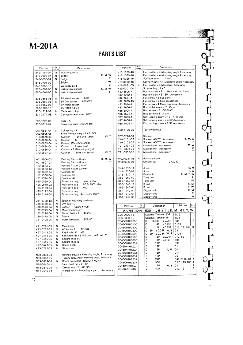 KENWOODSERVICE MANUALTM-201AU5A OnVHF FM TRANSCEIVER6.00。通CONTENTSCIRCUIT DESCRIPTIONPACKING...8PARTSADJUSTMENT.LEVEL DIAGRAMA UNIT IX44-1530-11,61113FC-10 OPTION..2FINAL UNIT(X45-1330-11114TU-3D1 SPLAY UNIT IX54-1740-01,51,61.14SCHEMATIC DIAGRAM(W.T)...........29TONE UNIT (X52-1250-50,61)W,Tonly ................4BLOCK DIAGRAM.SCHEMATIC DIAGRAM (K.MIBUNIT [X53-1340-11,61l15.3】DISASSEMBLY16REFERENCE DATA32