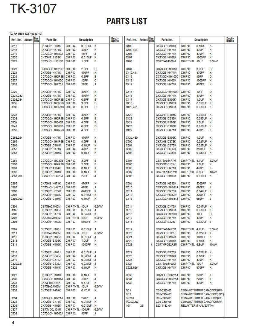 UHF FM TRANSCEIVERTK-3107KENWOODJVC KENWOOD CorporationSERVICE MANUALSUPPLEMENTM version2012-4 PRINTED IN JAPANB53-7023-00Y)PDFThis service manual has been revised due to the modification of the Drive Final FET andissues it as a supplement manual.This service manual applies to products with B2400001 orsubsequent serial numbers.Refer to the TK-3107 series service manual for any informationwhich has not been covered in this manual.Whip antennaT90-1039-25Knob(Selector)K29-5278-03)Knob (VOL)K29-5255-03)CONTENTSKENWOODGENERAL...................2PARTS LIST.....3PC BOARDTX-RX UNIT(X57-6030-10).8SCHEMATIC DIAGRAM.12Plastic cabinet assyA02-2448-53)LFThis product uses Lead Free solder.