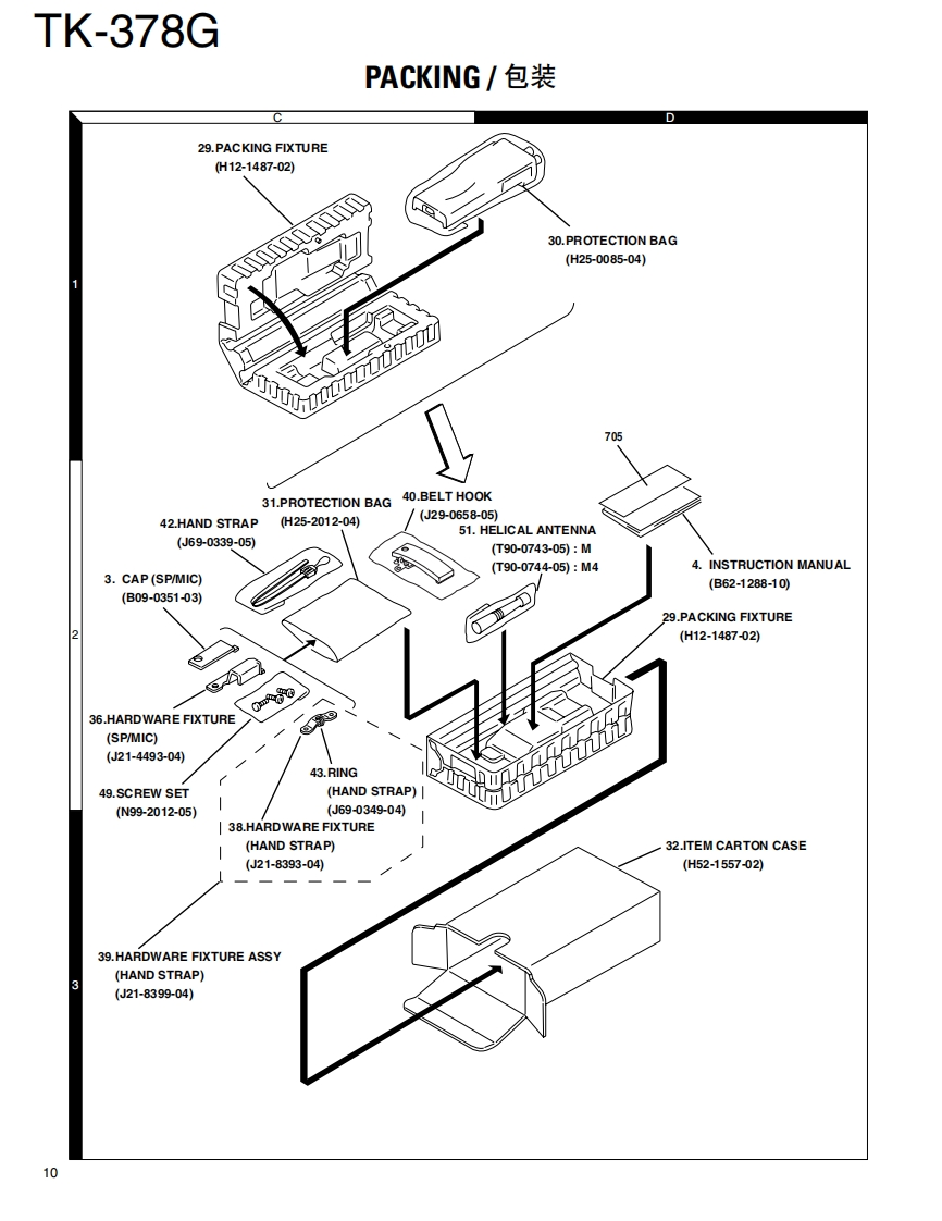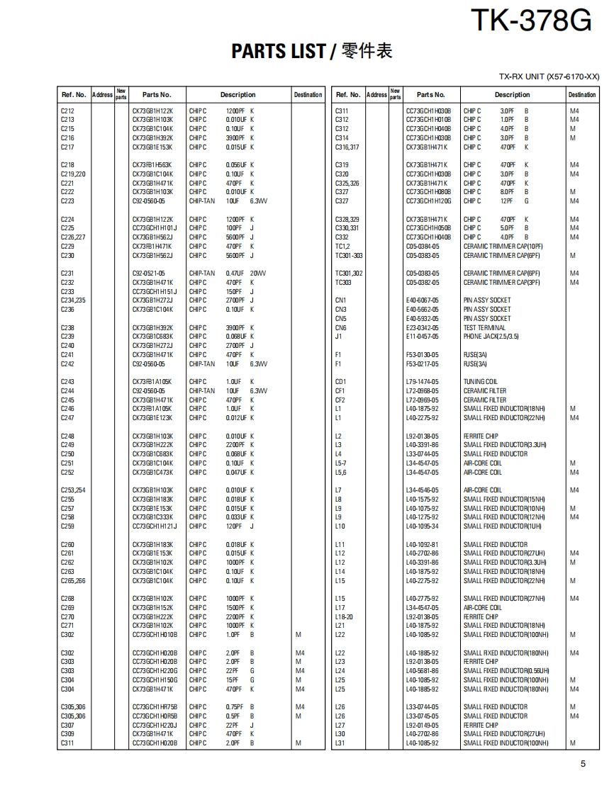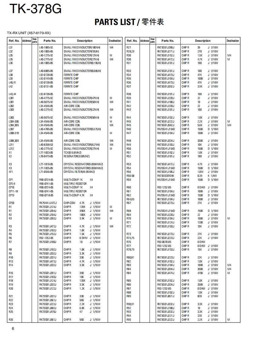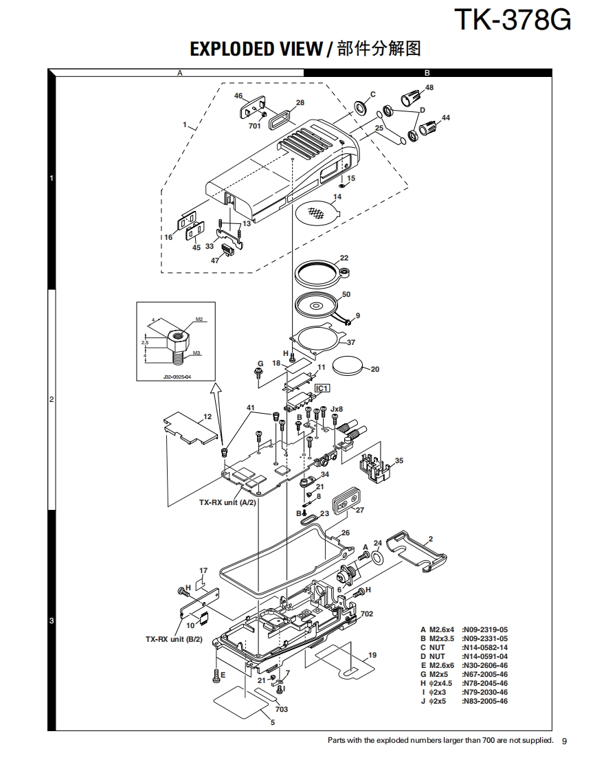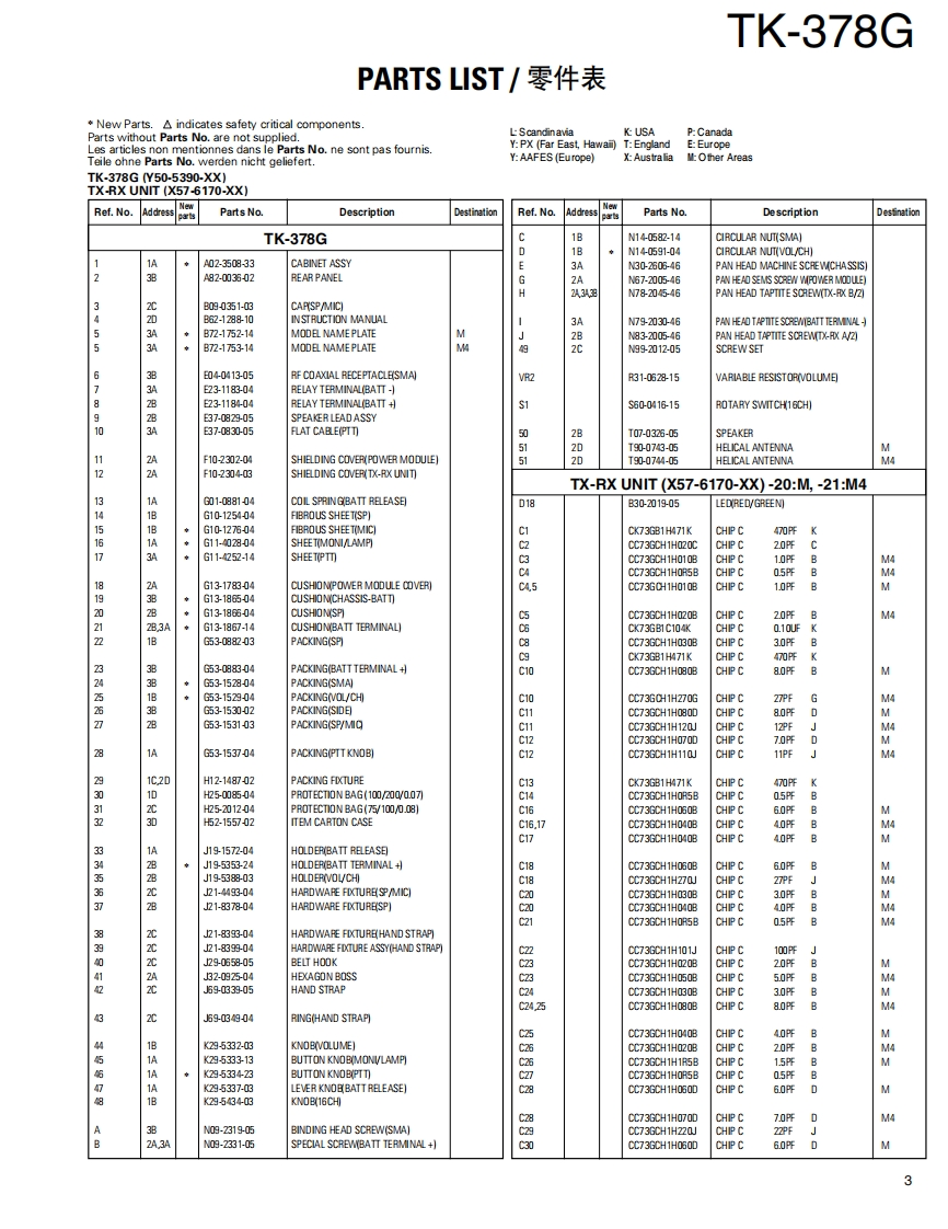 UHF FM TRANSCEIVER/UHF FM手S持机KENWOODTK-378GSERVICE MANUAL/维修手册M VERSIONS2002-10 PRINTED IN JAPANB51-8640-00(S)607SUPPLEMENT/追补版This service manual is aimed to revise and update theinformation on the PC Board that is used in the TK-378Gtransceiver having the serial number 4700201 and thelater serial numbers.Refer to the original TK-378G(M,M4)service manual (B51-8517-00)for anyinformation which are not contained in this manual.Knob此维修手册的目的是修改和更新印刷电路板的资料,它(CHANNEL SELECTOR)用于序号4700201以后的TK-378G对讲机。关于未包Helical Antenna(K29-5434-03)含于此手册的资料请参照TK-378G(M,M4)初版维修手(T90-0743-05):M(T90-0744-05):M4册(B51-8517-00).Knob (VOLUME)(K29-5332-03)Cabinet assy(A023508-33)Button knob (PTT)(K29-5334-23)Button knob.(MONI/LAMP)K29-5333-13)CONTENTS目录PARTS LIST............2零件表..2EXPLODED VIEW.......9部件分解图.9PACKING.10包装10ADJUSTMENT....11调整.11PC BOARD VIEWSPC板视图TX-RX UNIT (X57-617X-XX)....................3TX-RX单元(X57-617X-XX).23SCHEMATIC DIAGRAM..29原理图.29BLOCK DIAGRAM.33方块图.33LEVEL DIAGRAM........35电平图..35KNB-14/KNB-15A (Ni-Cd BATTERY)...............36KNB-14/KNB-15A(镍-铬电池).36KMC-17/KMC-21 (SPEAKER MICROPHONE)..37KMC-17/KMC-21(扬声器话筒)37SPECIFICATIONS.BACK COVER规格.39